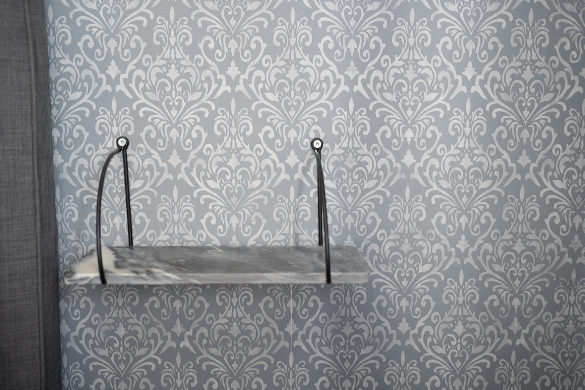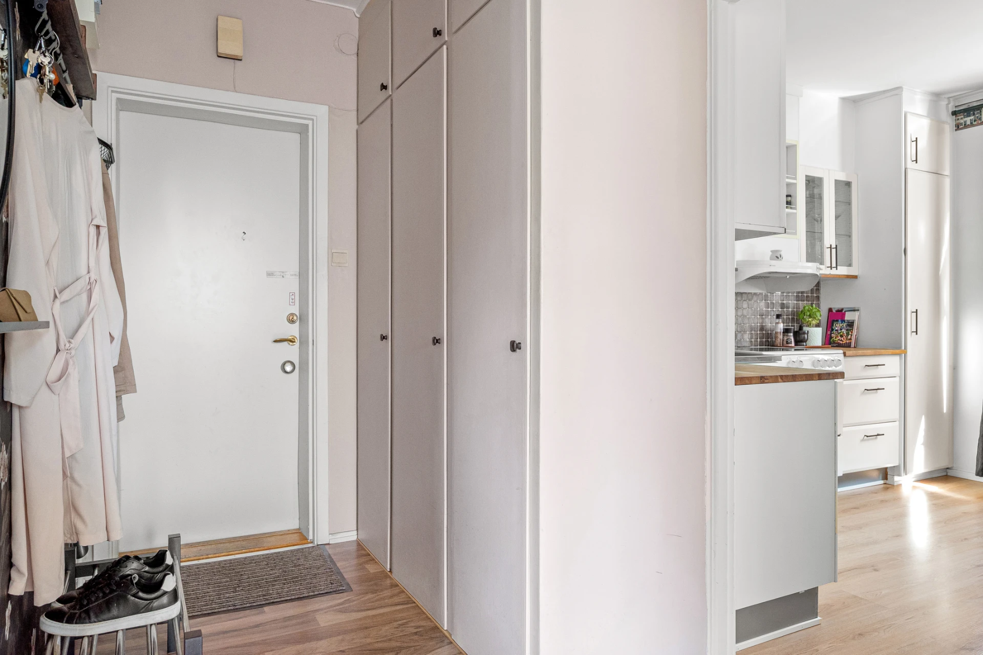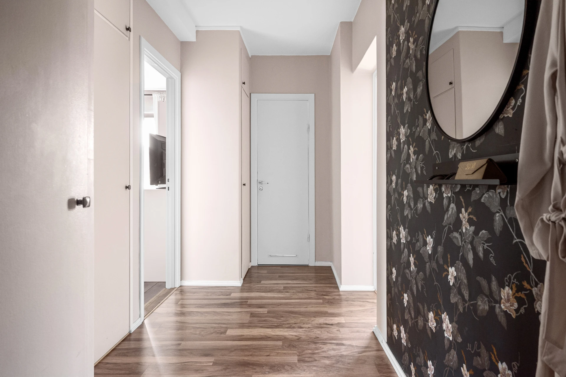 Hall med förvaringsmöjligheter i 5 inbyggda garderober. Månade väggar samt en tapetserad vägg och laminat golv.