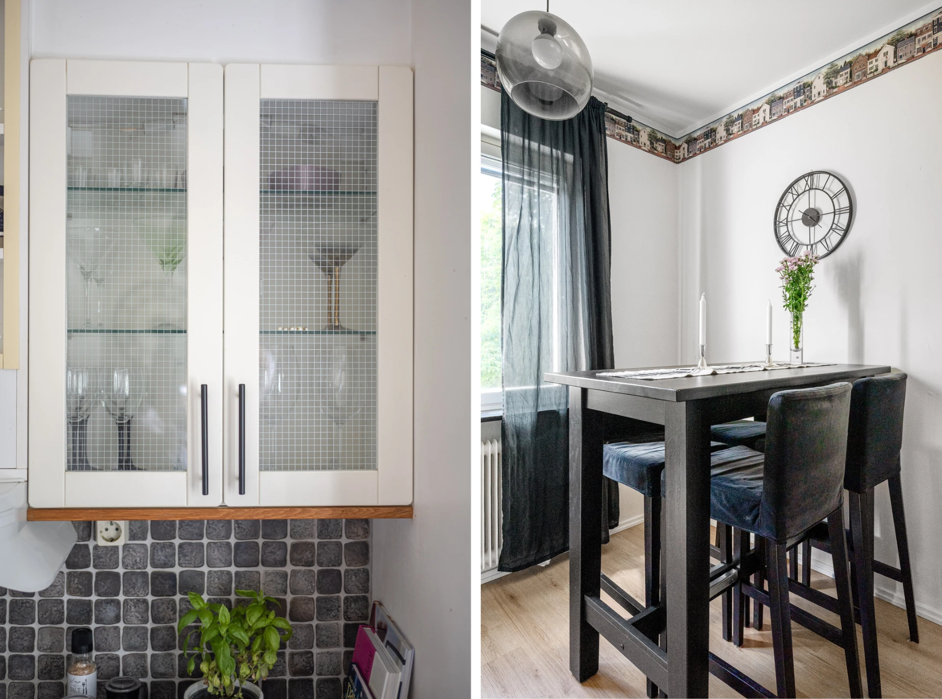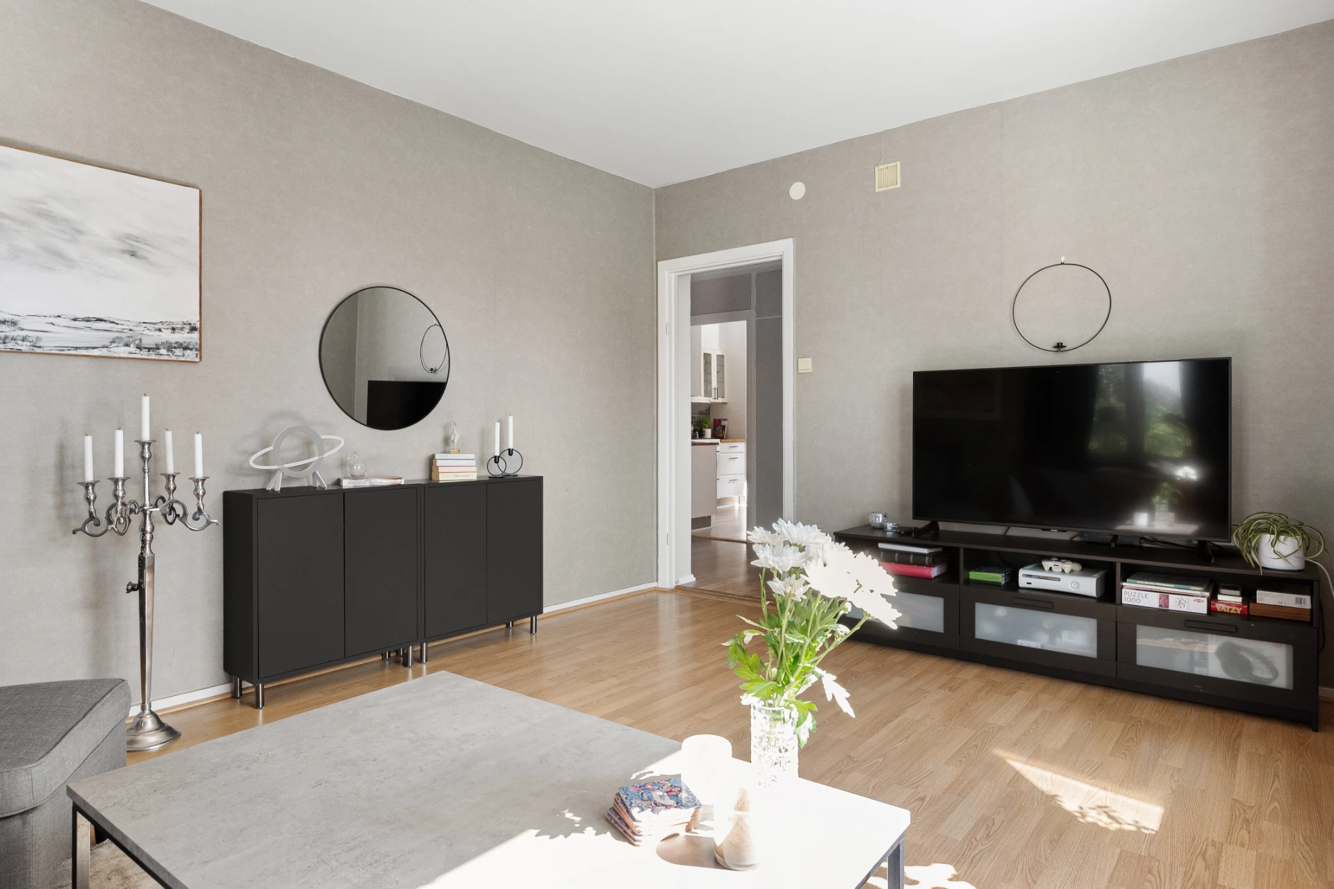 Vardagsrummet har vackert parkettgolv och en trivsam atmosfär, medan det hemtrevliga köket har plats för matbord. Badrummet är helkaklat och fräscht, och bostaden erbjuder gott om förvaring.