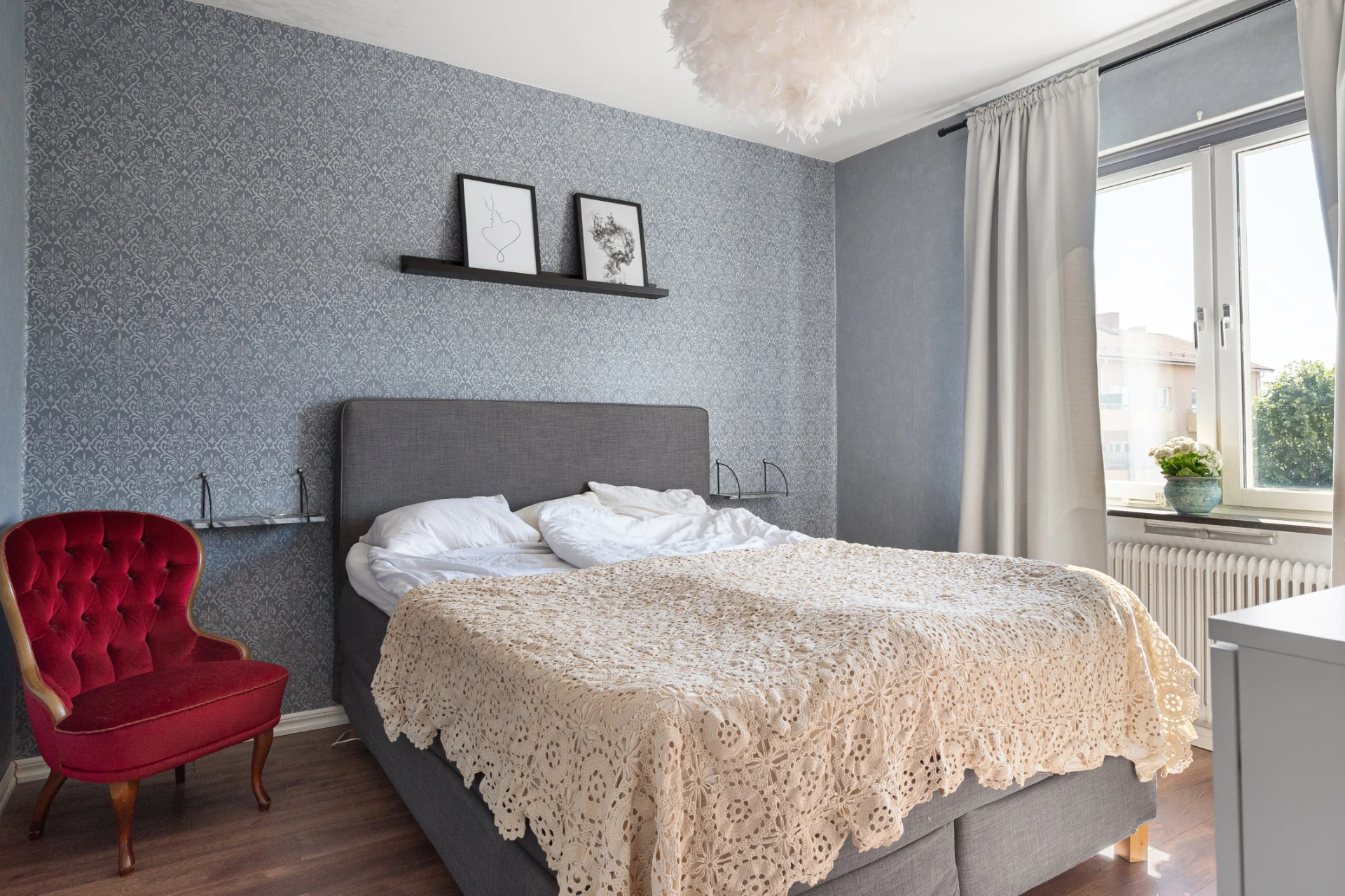 Sovrum med tapetserade väggar och laminat på golv. Garderobsförvaring finns.