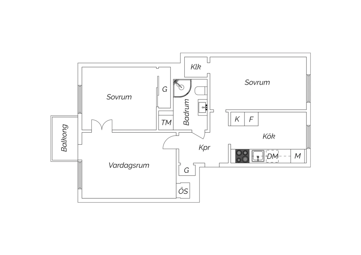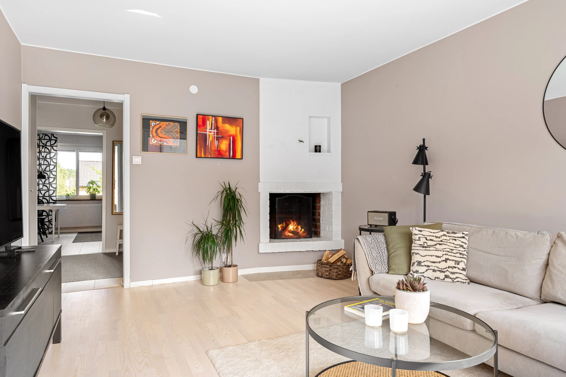Bostaden har en harmonisk och öppen planlösning med ljusinsläpp från två håll som skapar ett ljust och luftigt intryck. Vardagsrummet är rymligt och inbjudande med plats för både soffhörna och matplats. Här finns dessutom en vacker öppen spis som blir en naturlig samlingspunkt och ger rummet en varm och exklusiv känsla. Från vardagsrummet når du också balkongen i soligt läge, perfekt för morgonkaffet eller avkoppling på eftermiddagen.