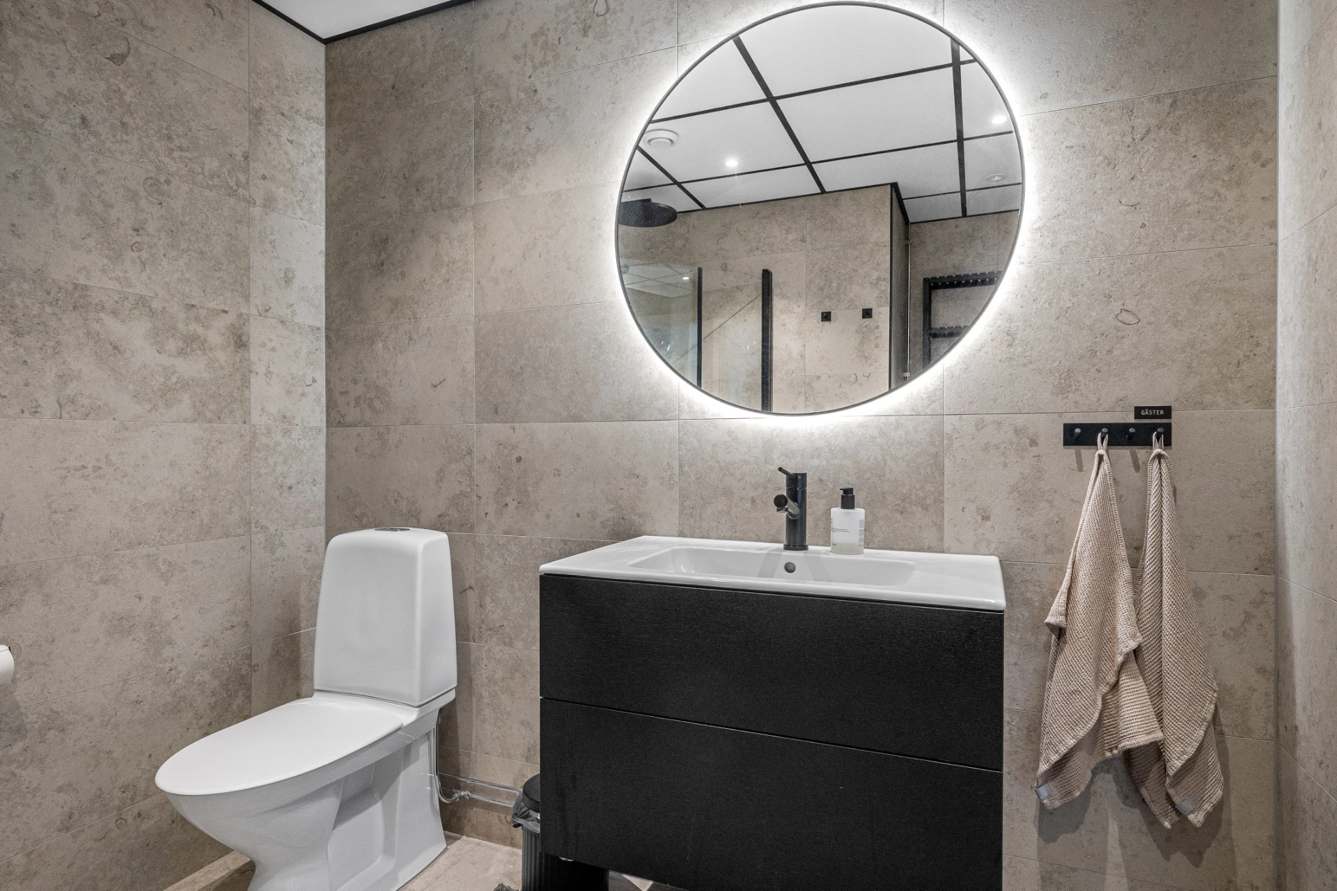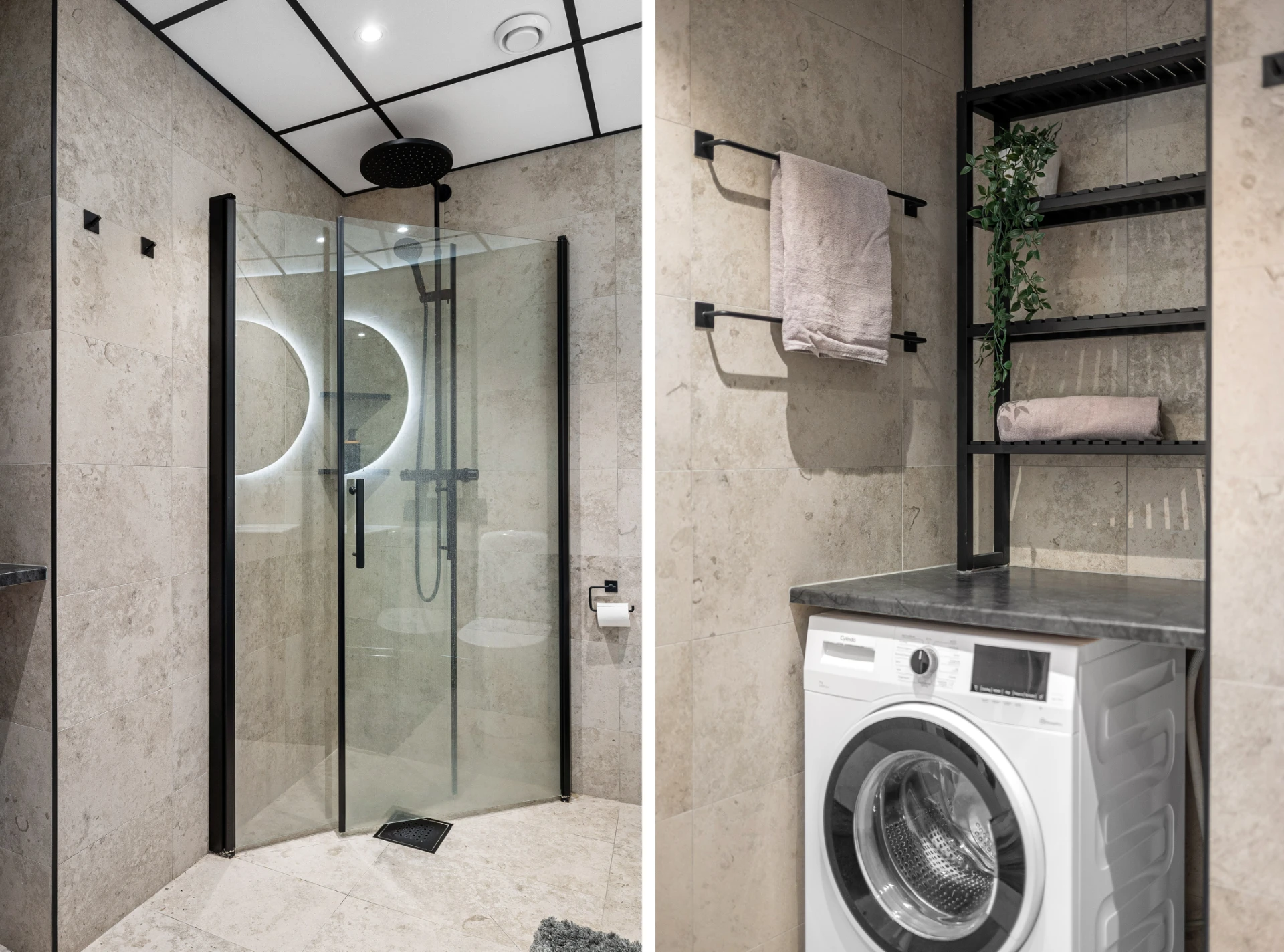 Köket är stilrent med moderna materialval, renoverat under 2023, och ger gott om utrymme för matlagning och förvaring. Badrummet är lyxigt helkaklat med klinkergolv och utrustat med moderna detaljer som för tankarna till ett privat spa.