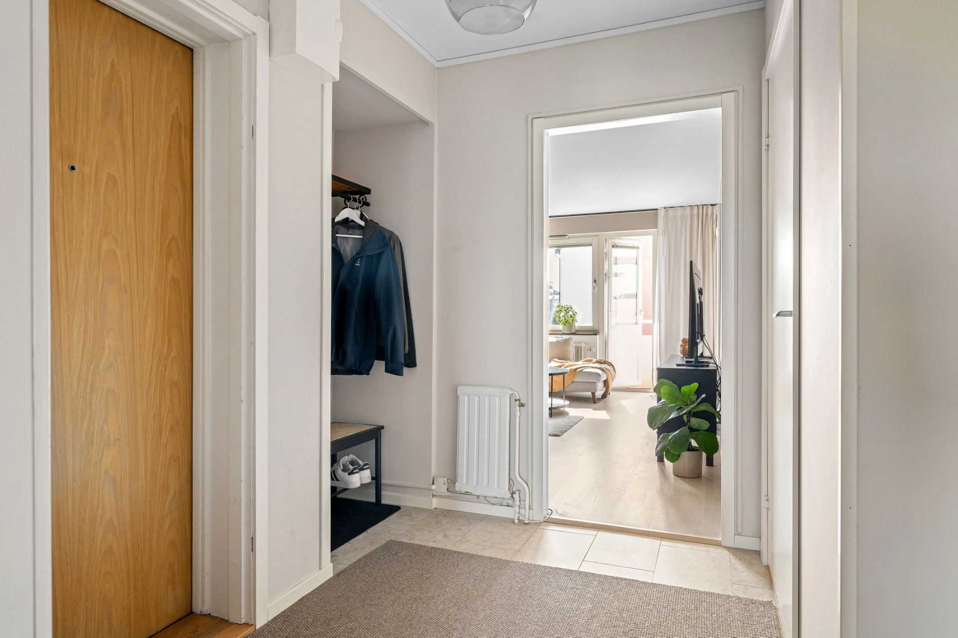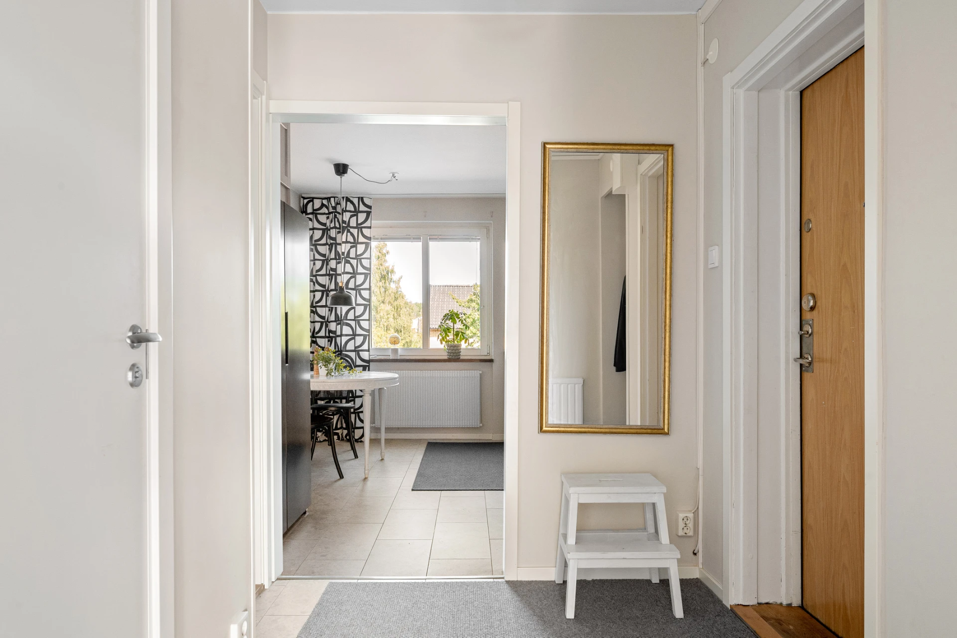 Klinkergolv och målade väggar. Rymlig hall med plats för avhängning av ytterkläder.
