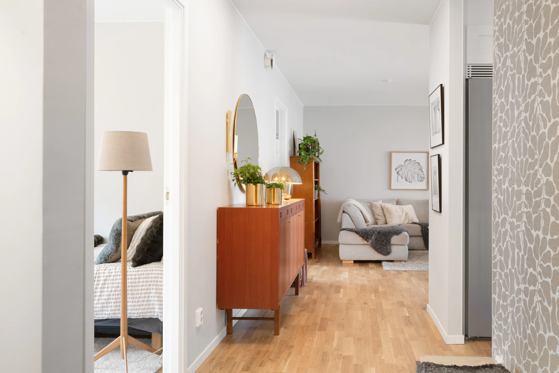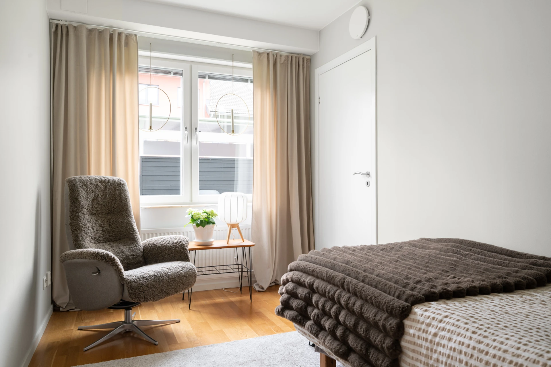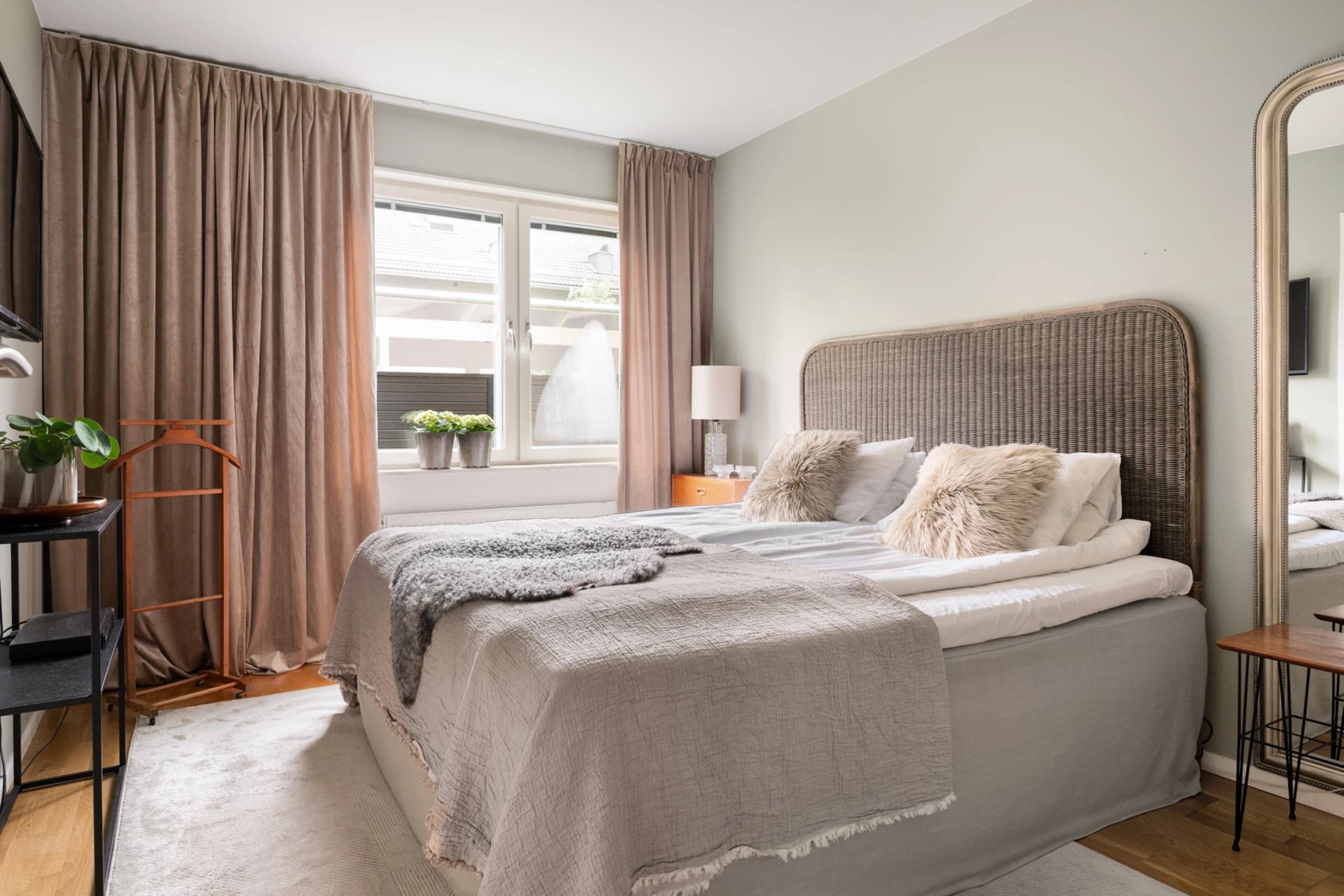 Två rogivande sovrum ger plats för vila och återhämtning. Båda rummen har generösa förvaringslösningar i form av klädkammare som gör det enkelt att hålla hemmet organiserat. Badrummet, helkaklat och renoverat 2023, bjuder på en elegant känsla med moderna detaljer och samtidigt en hög grad av funktionalitet. Här finns dessutom både tvättmaskin och torktumlare som gör vardagen smidigare. Genomgående ekparkettgolv och fönsterbrädor i sten sätter en exklusiv ton genom hela hemmet.