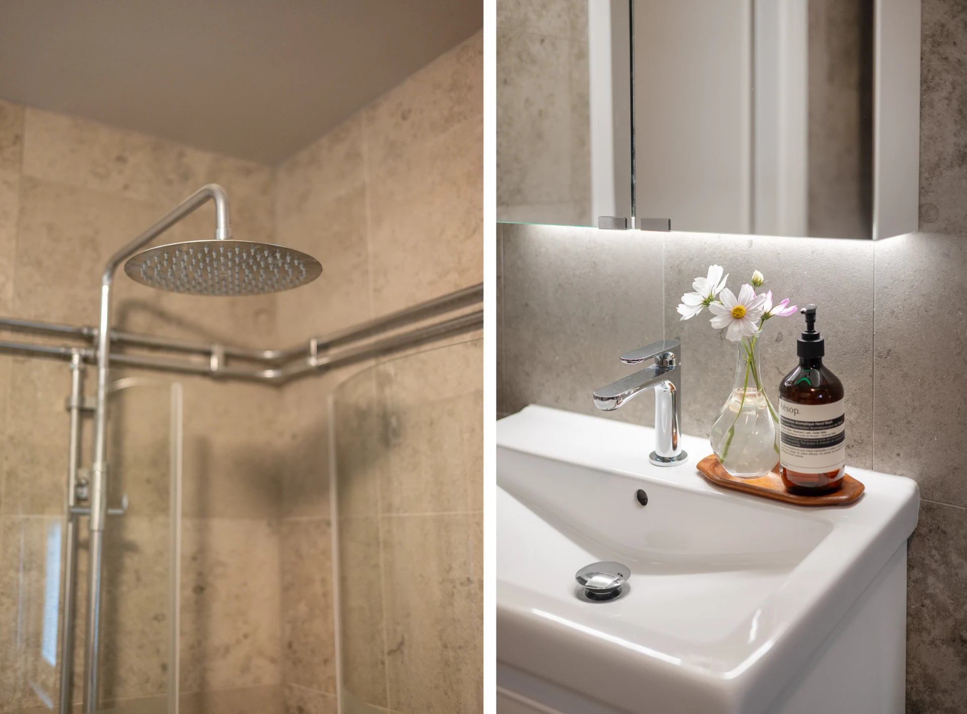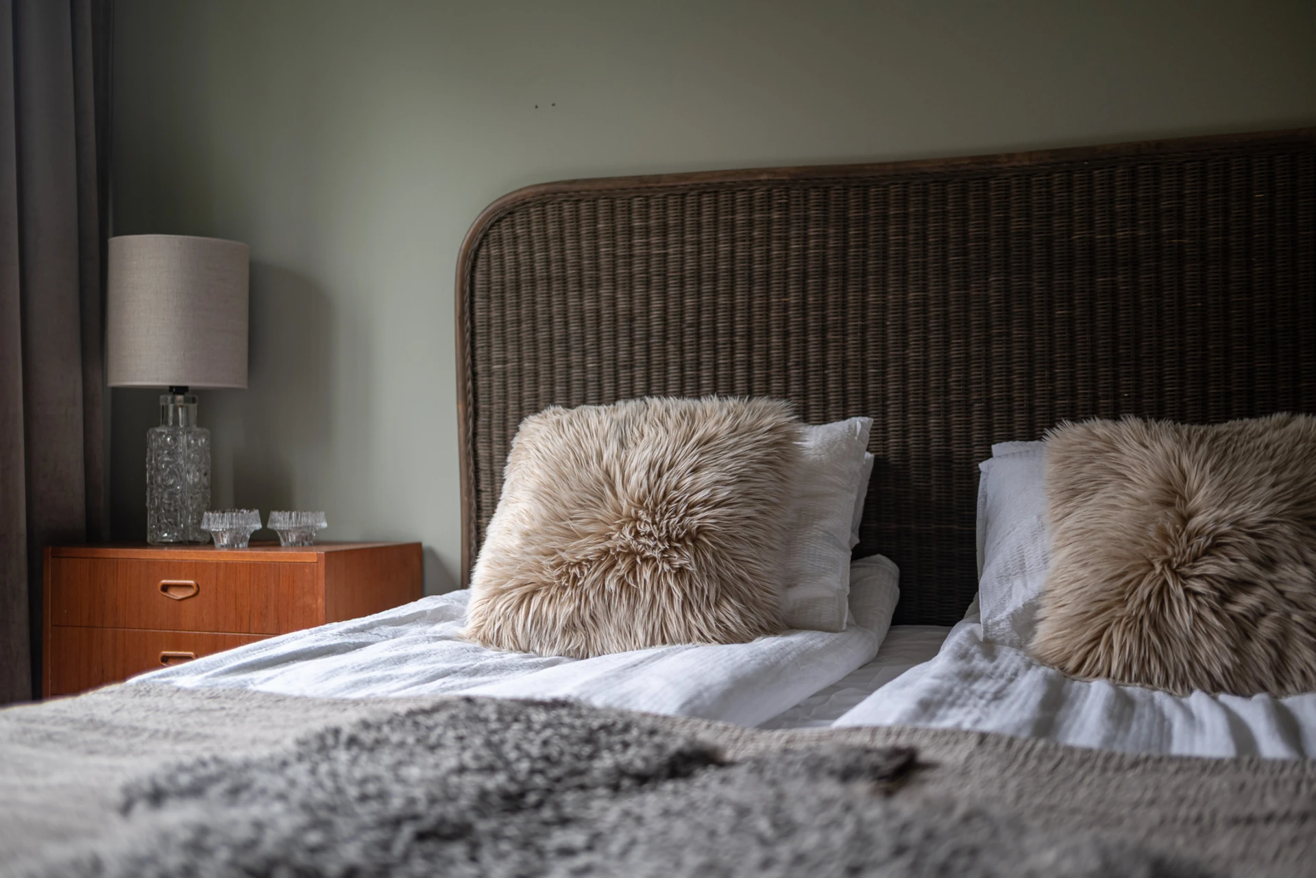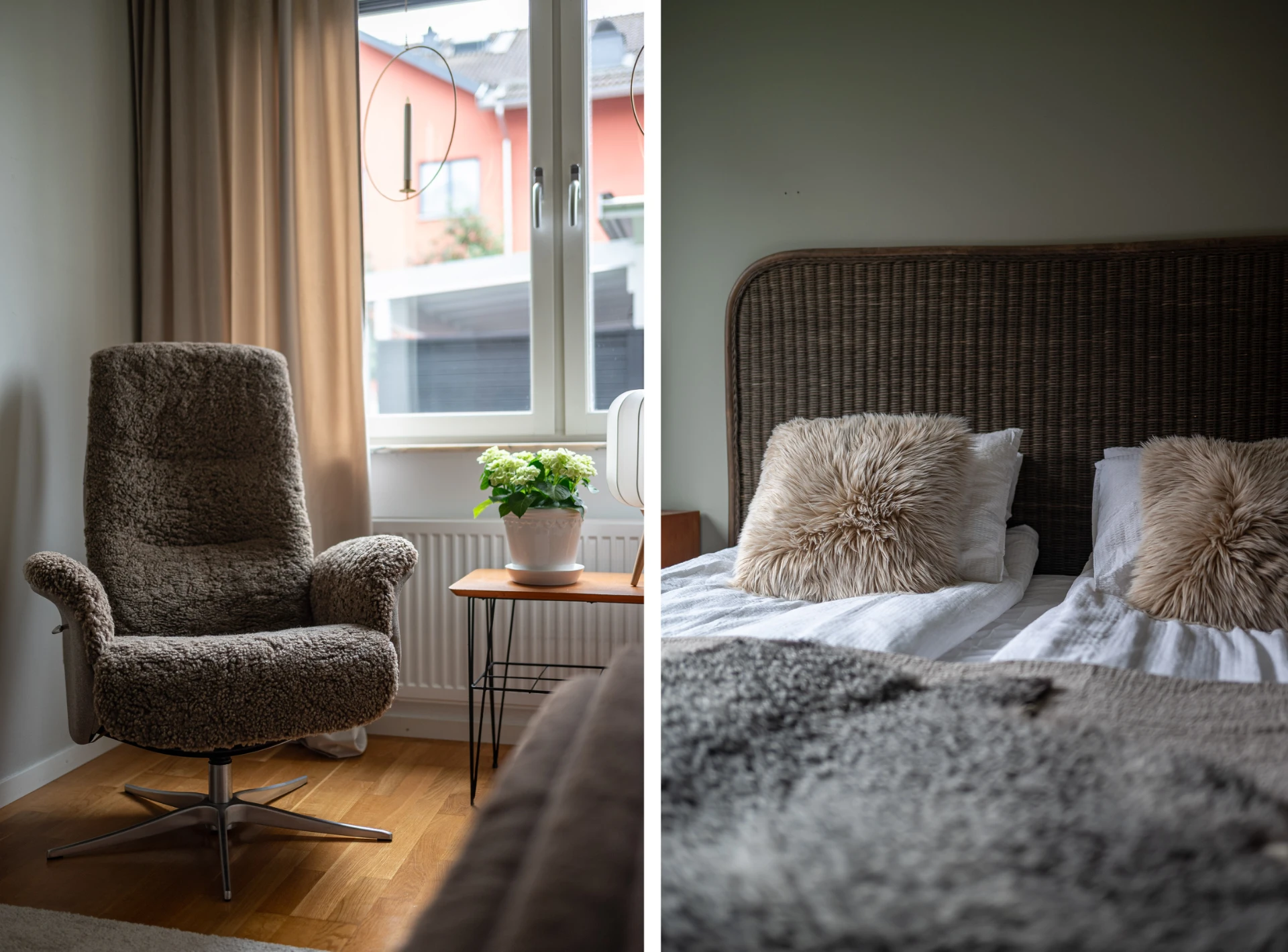 Två rogivande sovrum ger plats för vila och återhämtning. Båda rummen har generösa förvaringslösningar i form av klädkammare som gör det enkelt att hålla hemmet organiserat. Badrummet, helkaklat och renoverat 2023, bjuder på en elegant känsla med moderna detaljer och samtidigt en hög grad av funktionalitet. Här finns dessutom både tvättmaskin och torktumlare som gör vardagen smidigare. Genomgående ekparkettgolv och fönsterbrädor i sten sätter en exklusiv ton genom hela hemmet.