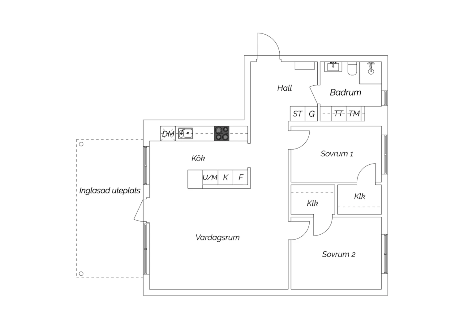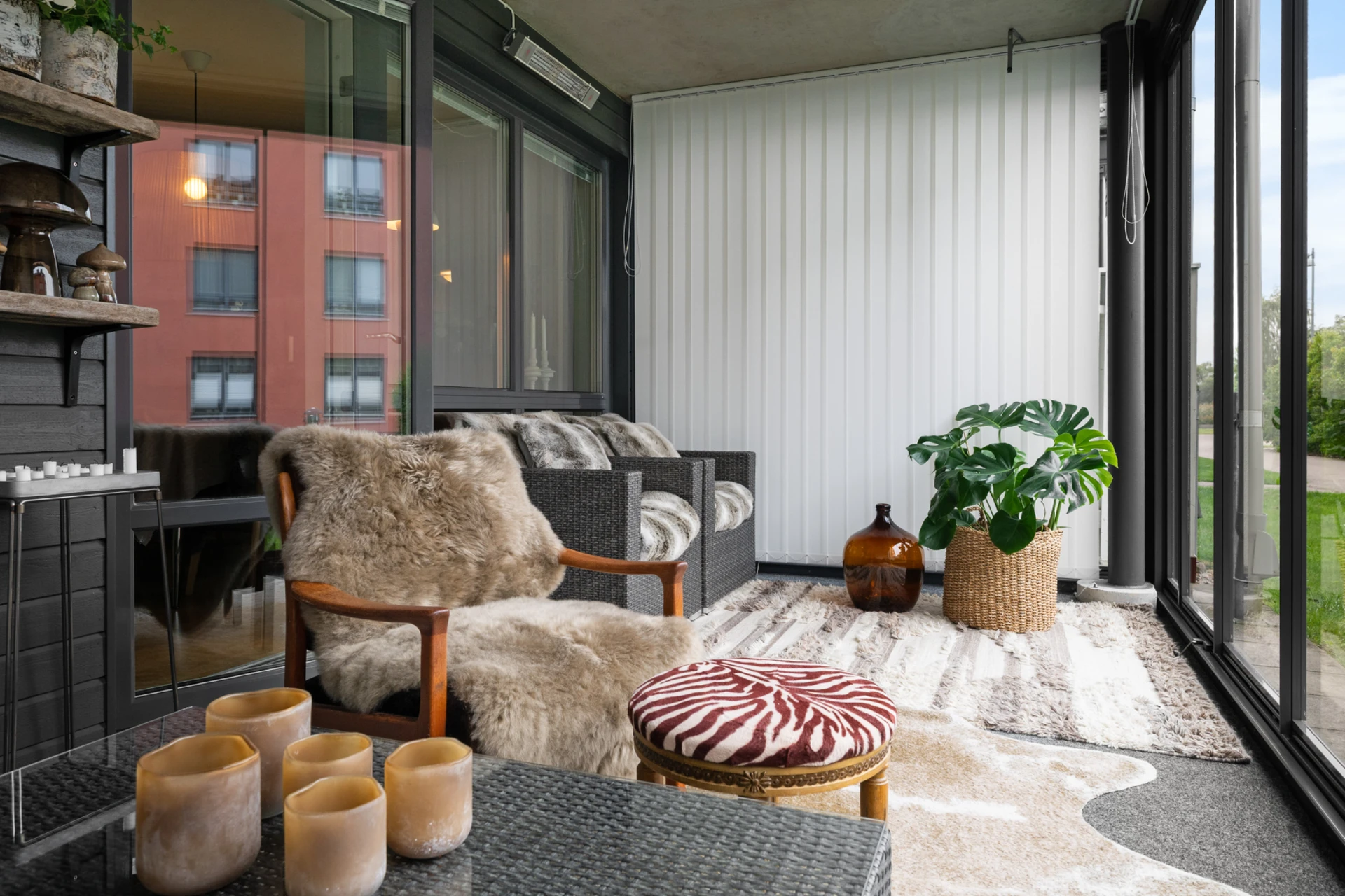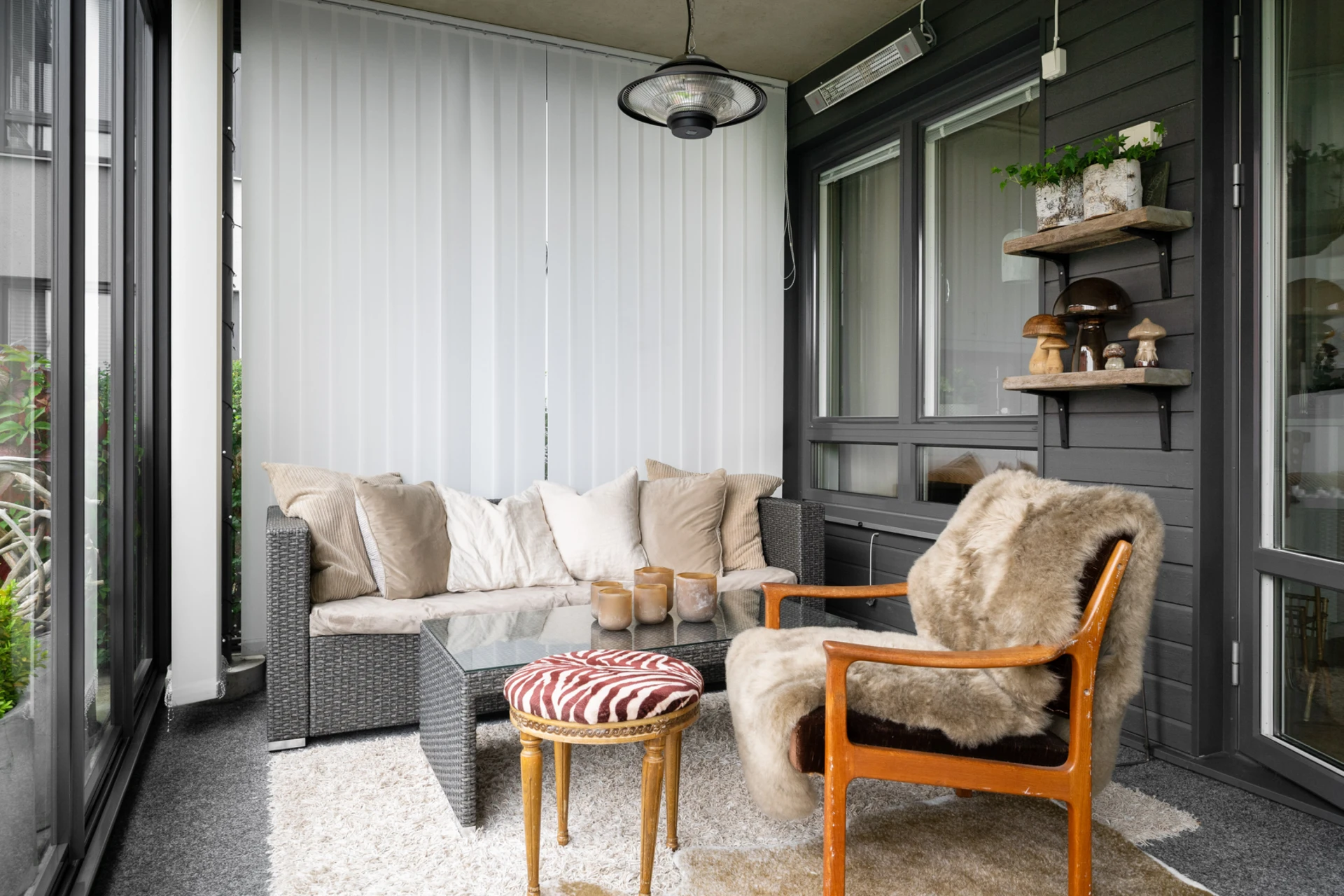 Den inglasade uteplatsen i sydvästläge blir snabbt en favoritplats. Här kan du njuta av dagens första kaffe eller en stunds avkoppling med en bok, året runt. Utrymmet blir ett naturligt extra rum, perfekt för både umgänge och stillhet.