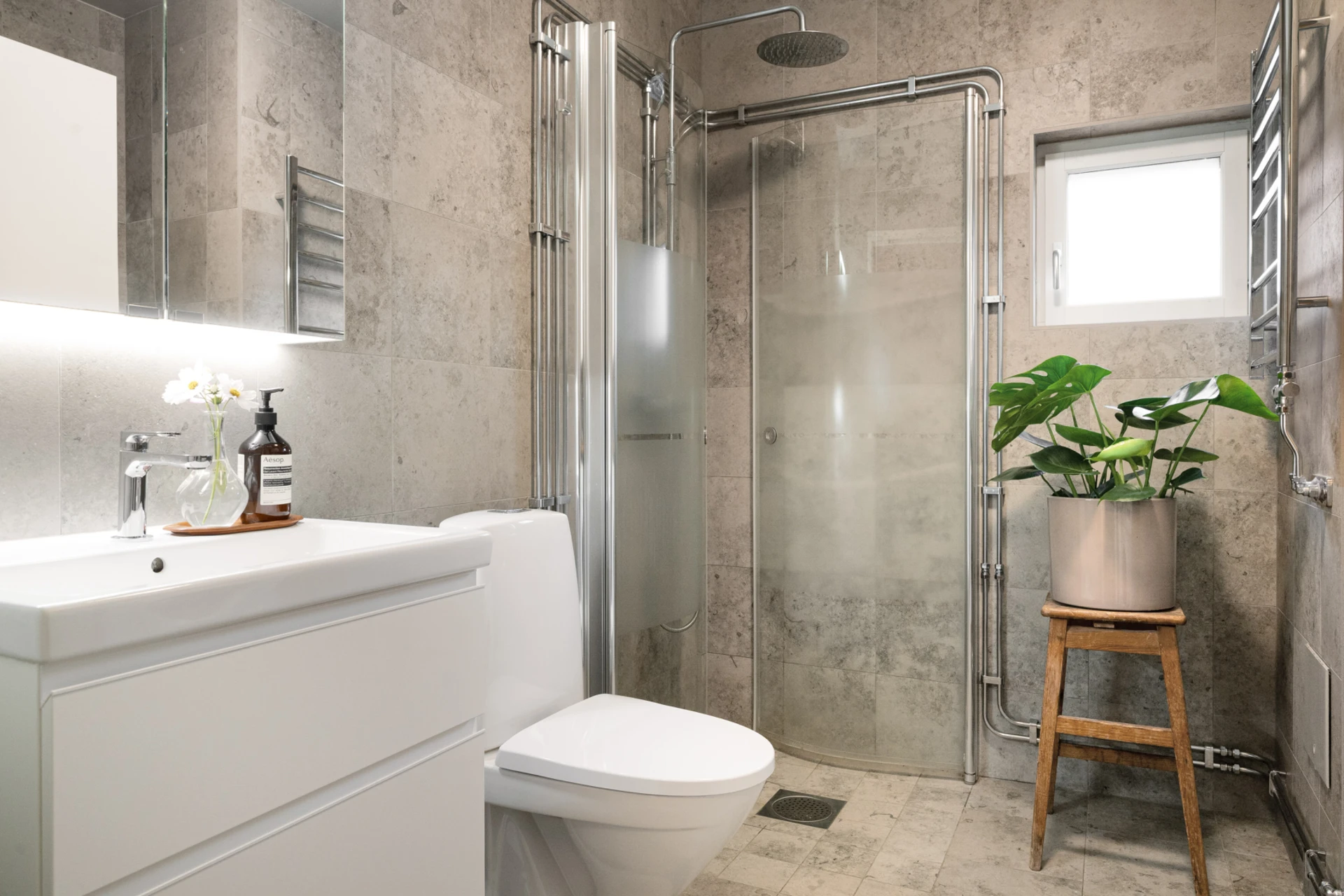 Klinkergolv och kaklade väggar. Badrummet är utrustat med WC, handfat med kommod, dusch samt tvättmaskin och torktumlare med arbetsbänk över.
