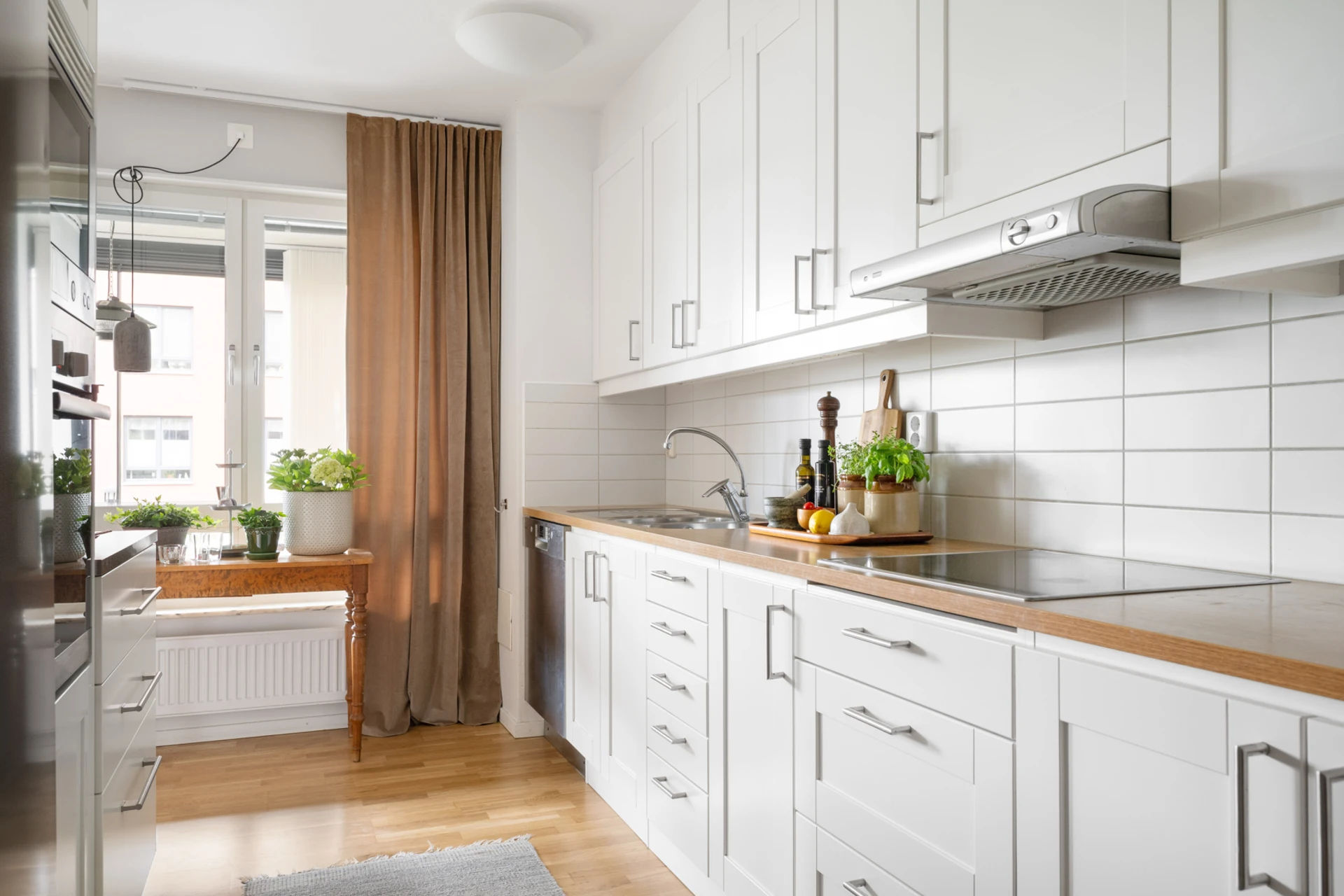 Parkettgolv och målade väggar. Köksinredning i vitt med bänkskiva i laminat och ett vitt kakel som stänkskydd. Köket är utrustat med induktionshäll, fläkt, diskmaskin, inbyggd ugn och mikro samt kyl och frys i fullhöjd.
