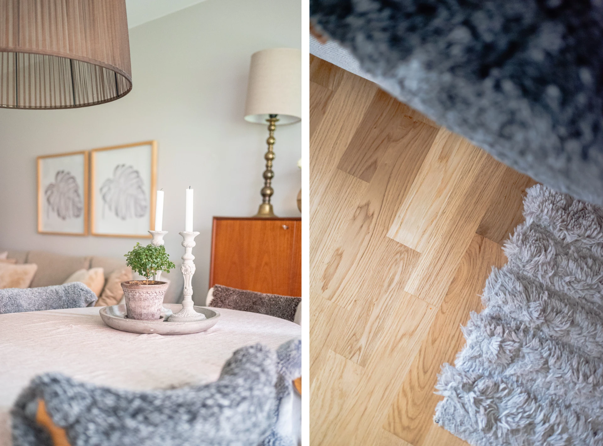 Parkettgolv och målade väggar. Ljust vardagsrum med utgång till uteplatsen. Öppen planlösning mot köket.