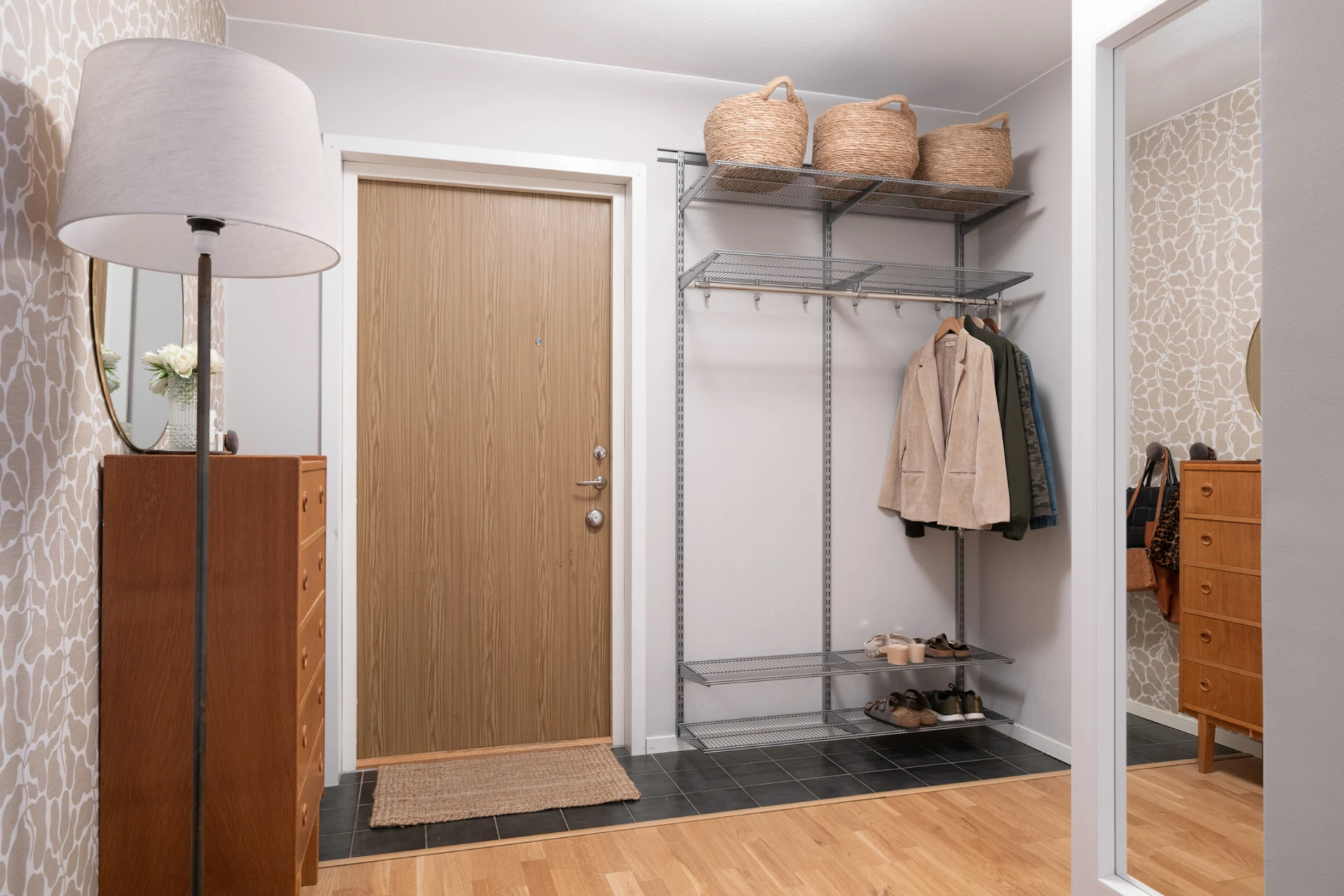 Parkettgolv och målade väggar. Här finns förvaring i en klädkammare.