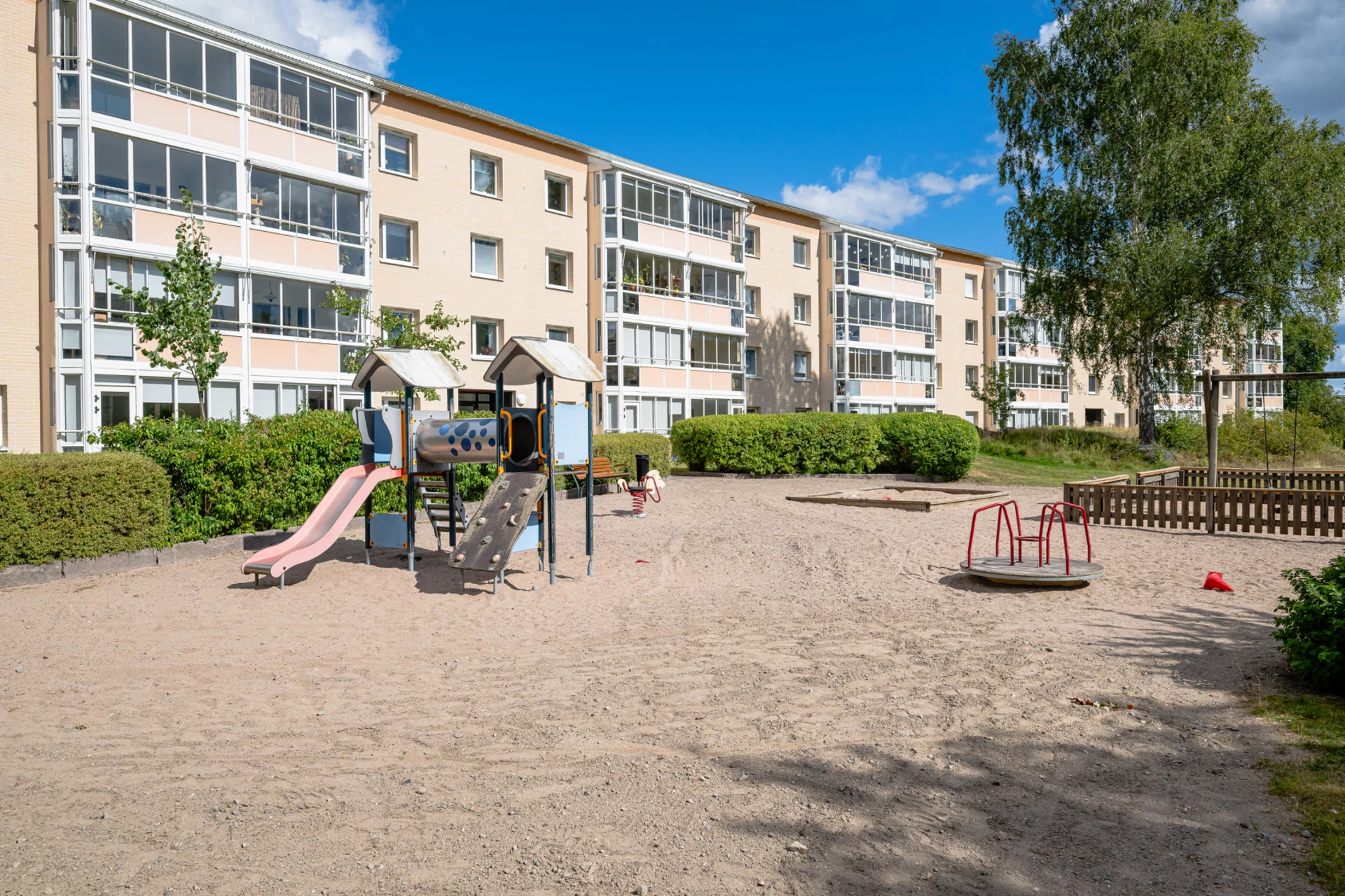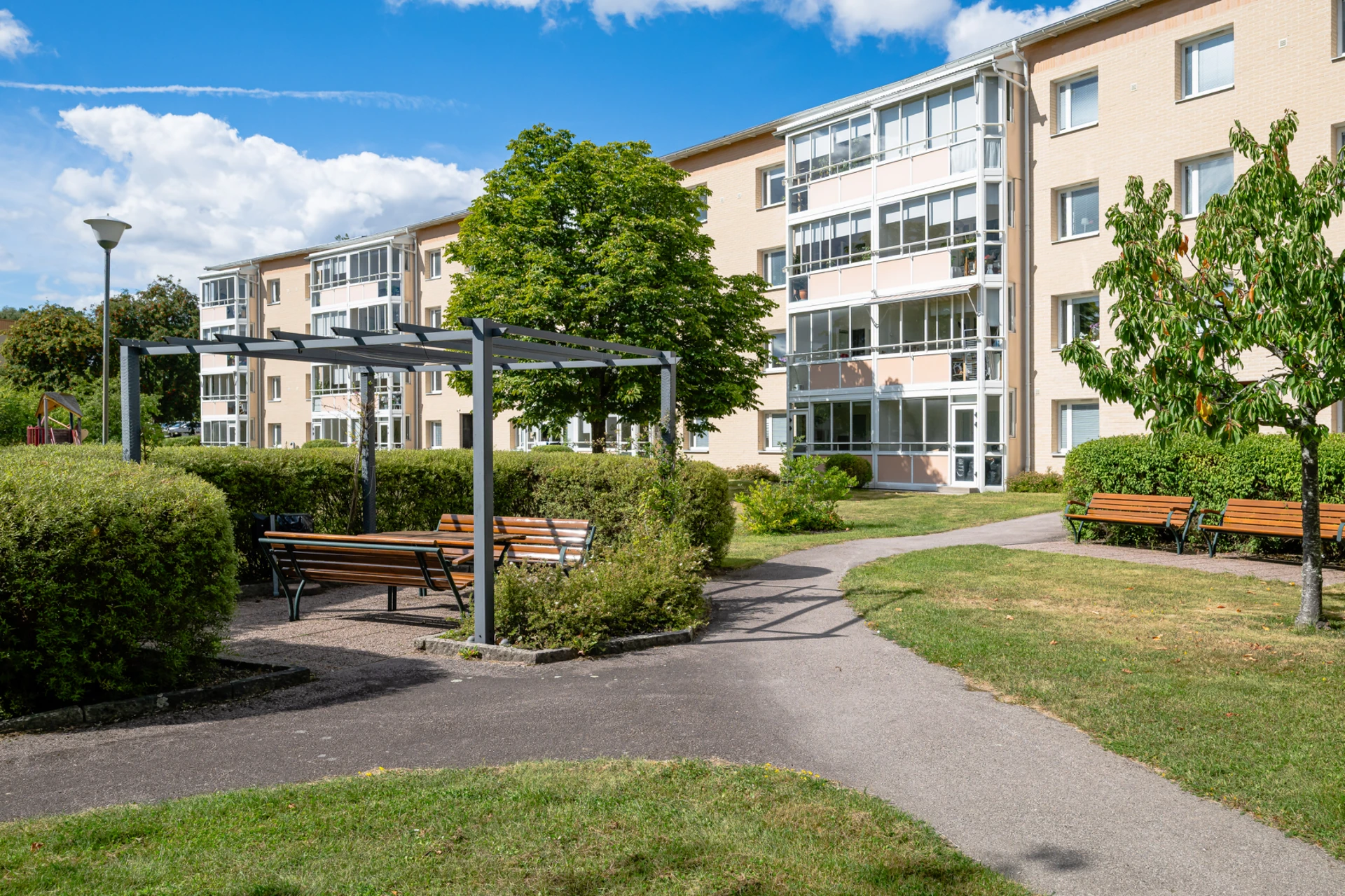 På den trevliga gården finns det sittgrupper, lekplatser och grillmöjligheter.