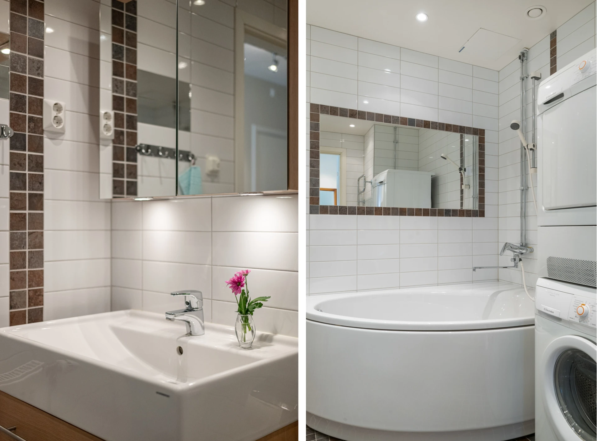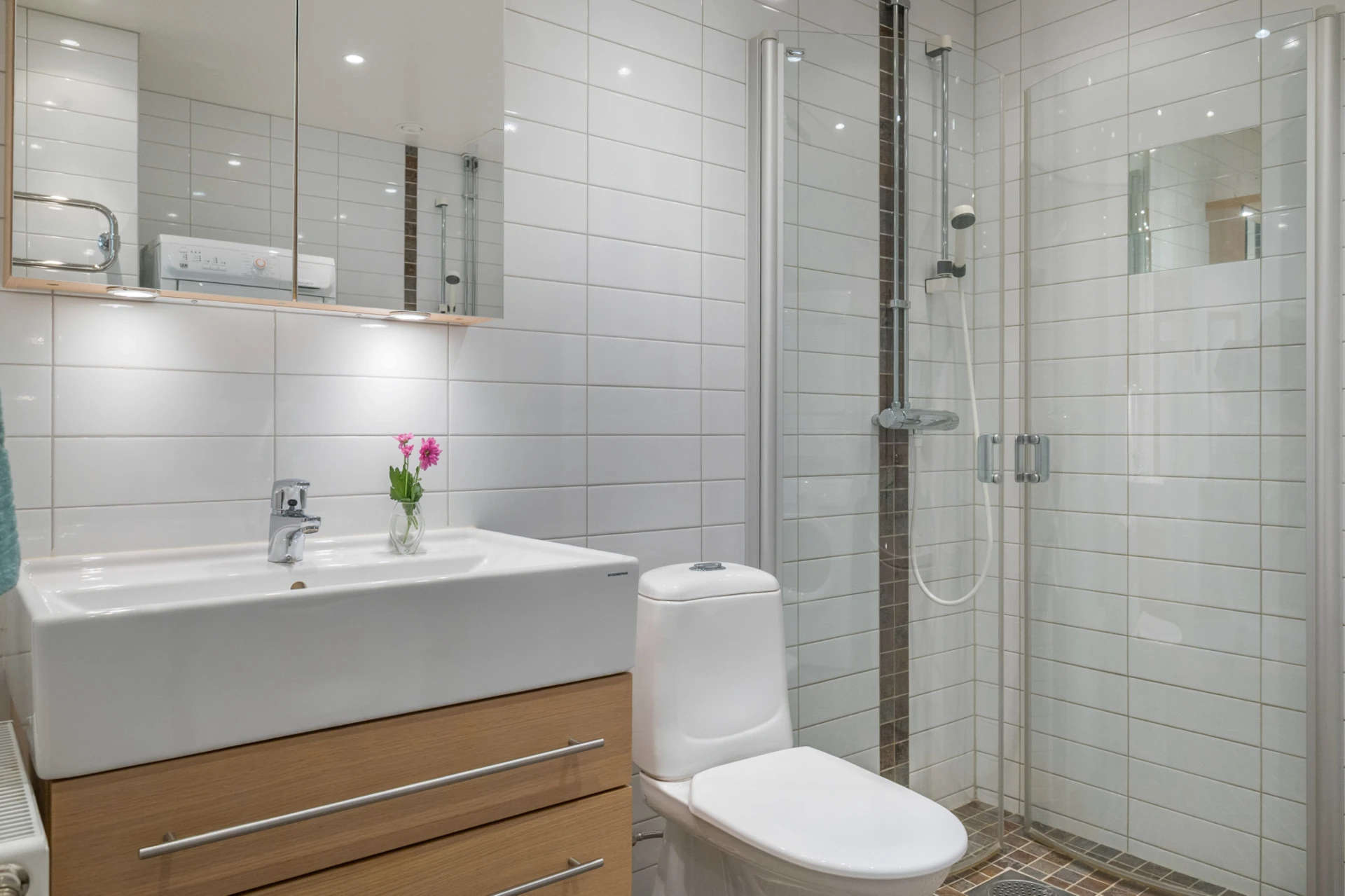 Helkaklat badrum med klinkergolv och golvvärme. Wc, hörnbadkar, dusch, handukstork, tvättmaskin/tumlare och infälld armatur i tak.