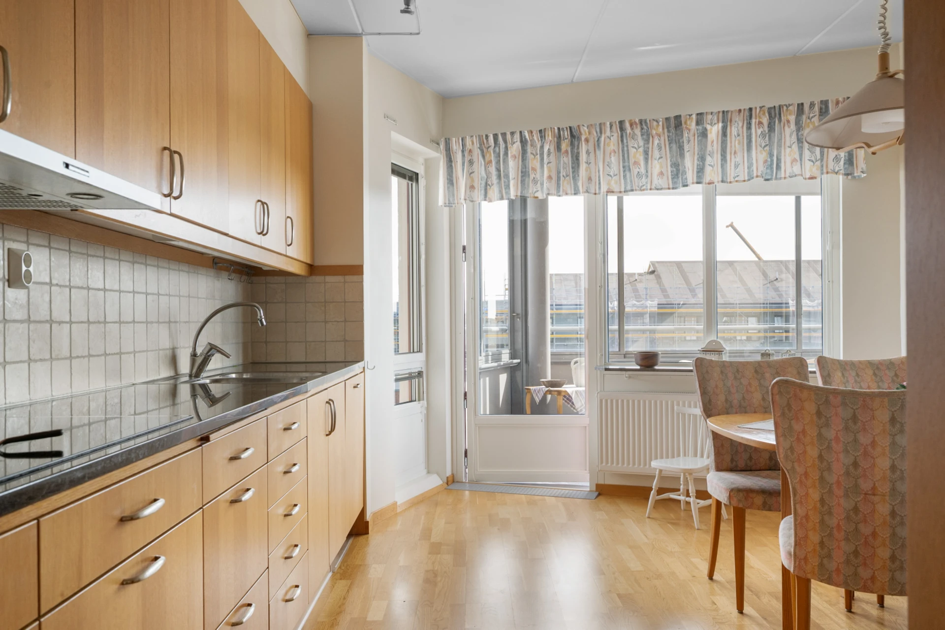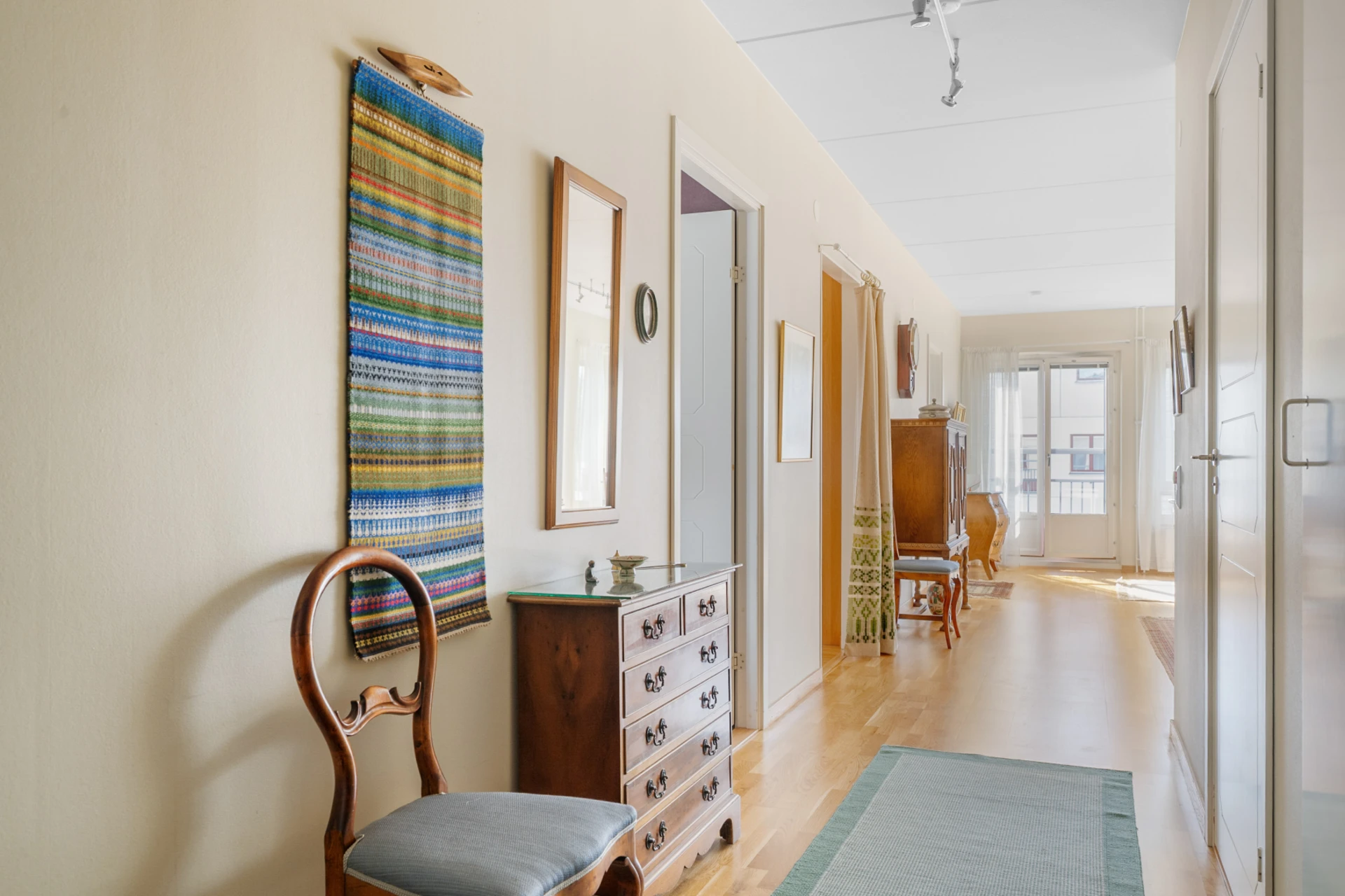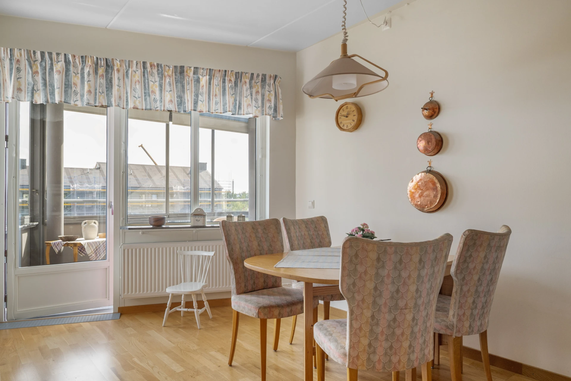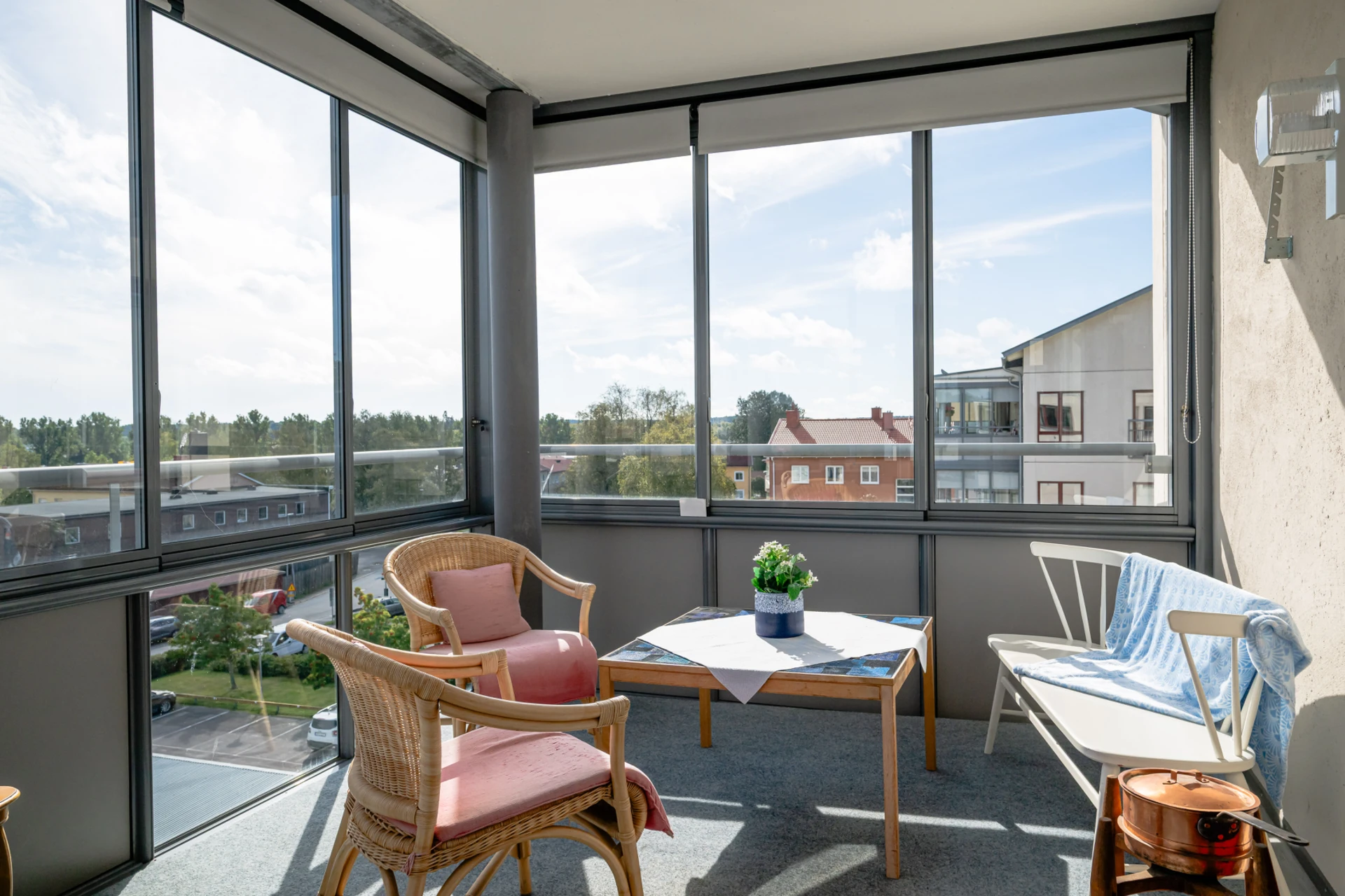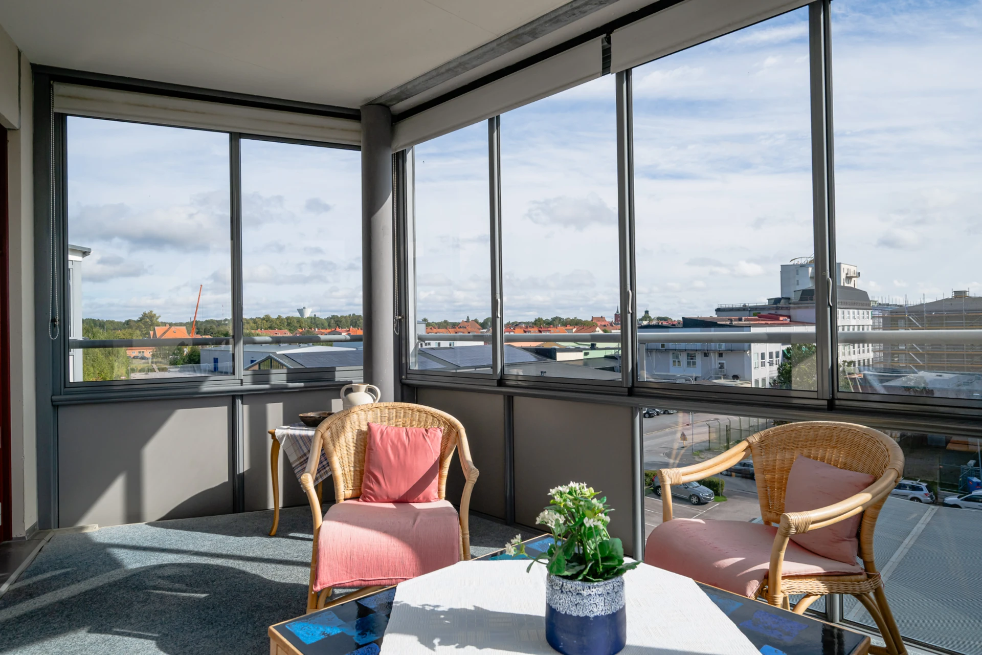 Högst upp på Krukmakaregatan 5 med hiss, ligger denna tilltalande lägenhet på 86 kvm fördelat på tre rejäla rum. Ljust och fint med genomgående parkettgolv, väl tilltaget badrum/tvättstuga med badkar, dusch och skön golvvärme. Väl tilltaget vardagsrum med fransk balkong, stort kök med utgång till en härlig, inglasad balkong med både takåsar och Lindbacke i blickfånget. Vidare finns här två sovrum samt en större klädkammare. Här bor ni bekvämt, tyst och lugnt men ändå bara 5 min promenad till centrum och tågstation med goda pendlingsmöjligheter till Stockholm. Stort förråd på vinden och möjlighet att hyra garage.