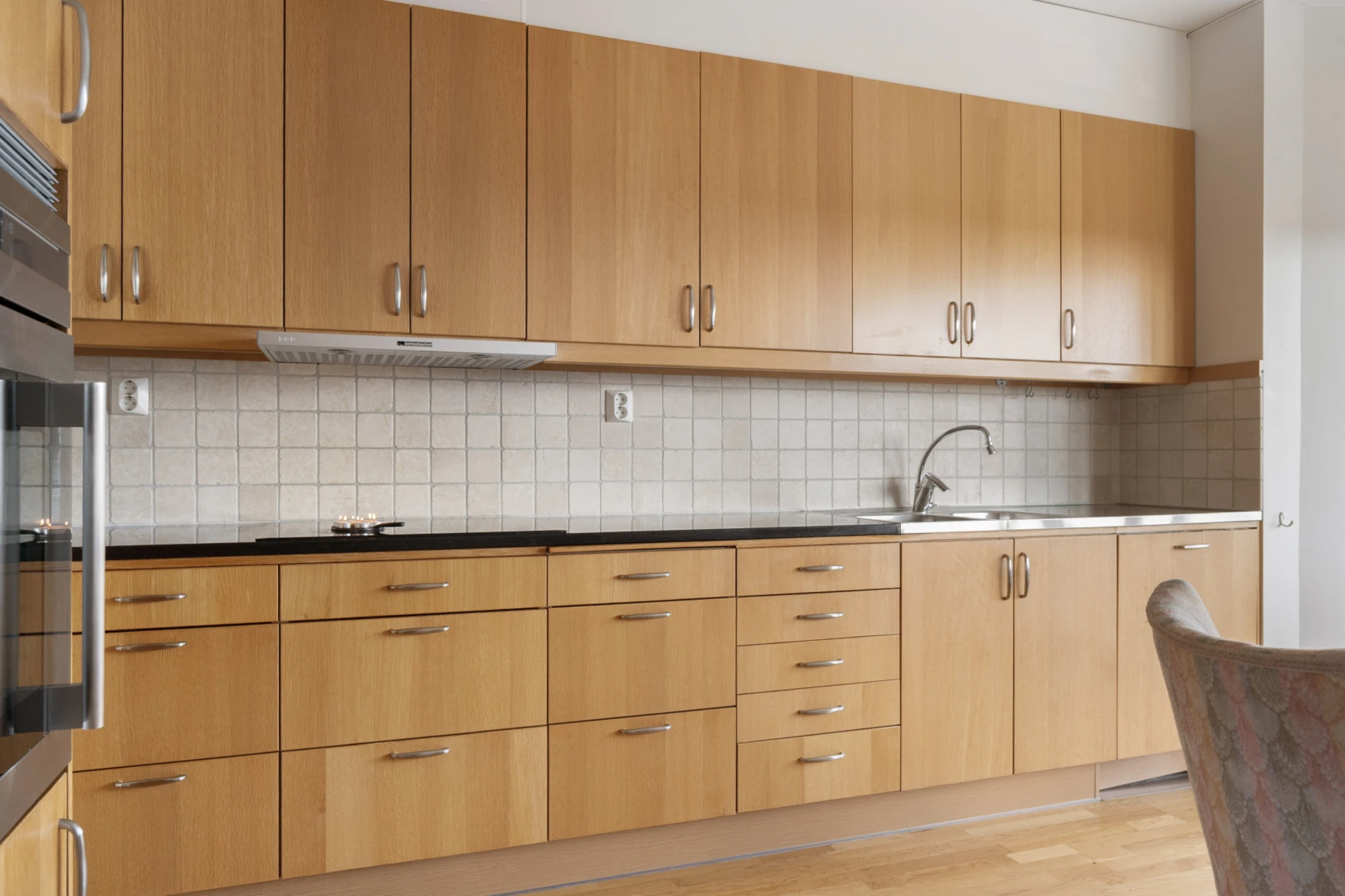 Myresjökök med parkettgolv och målade väggar. Spishäll, ugn, fläkt, kyl/frys och integrerad diskmaskin. Bänkskiva i granit och rostfritt.