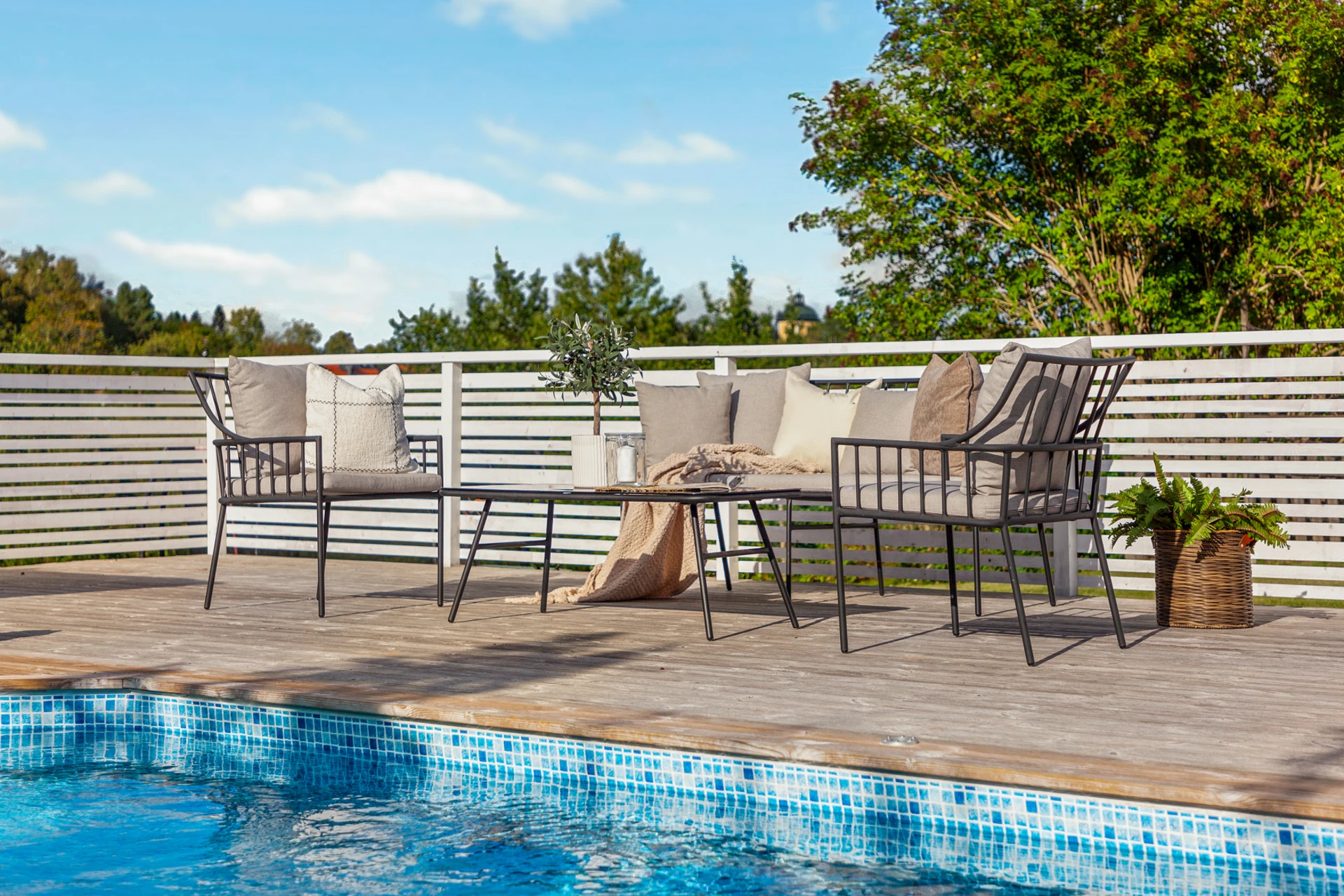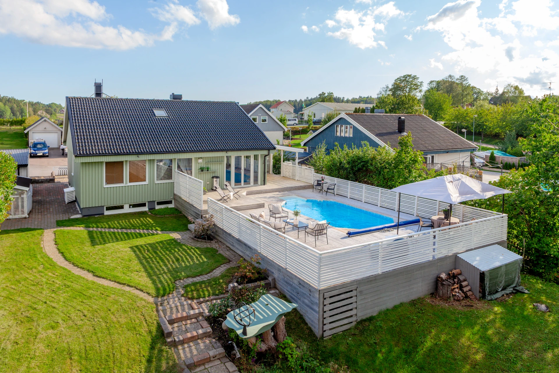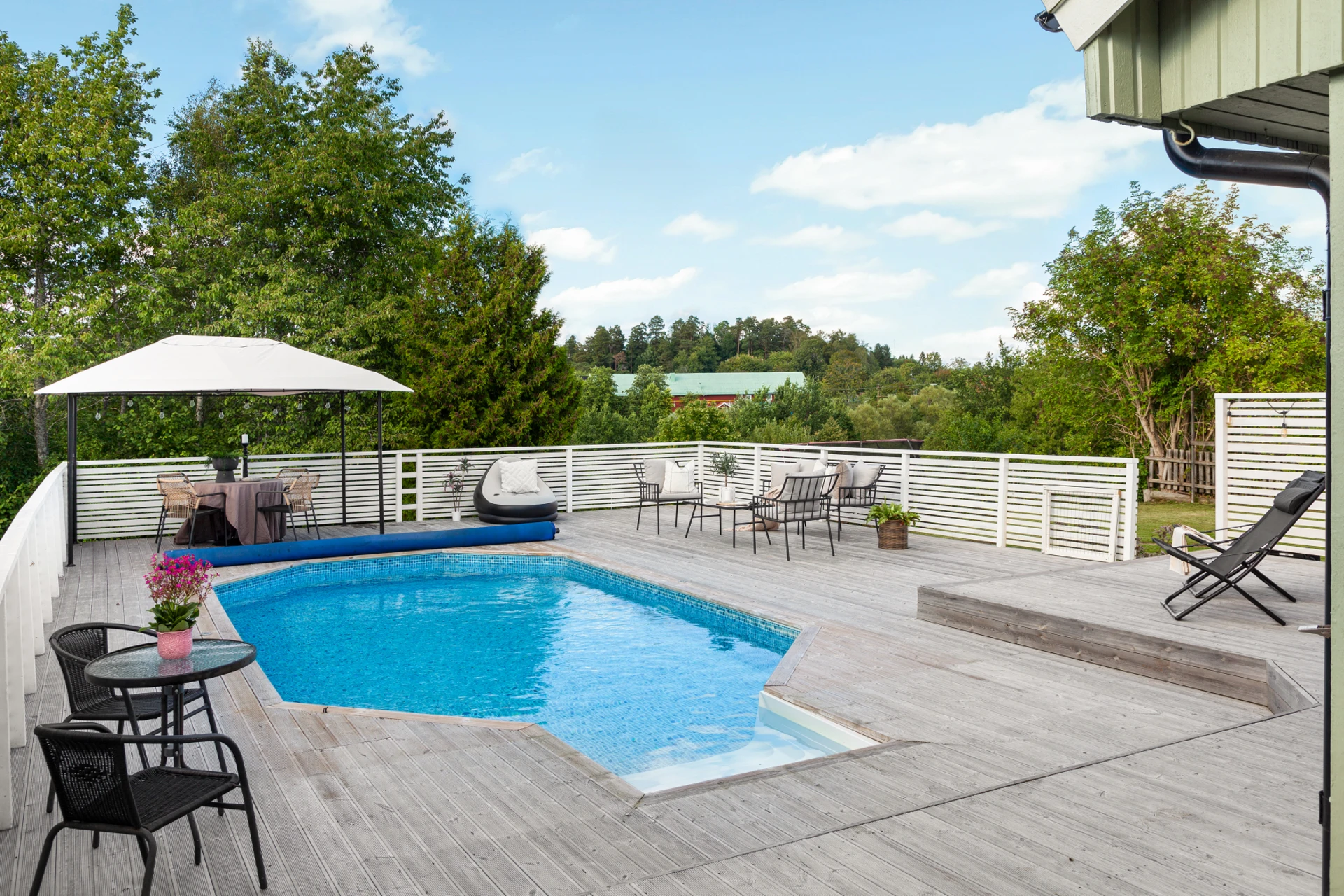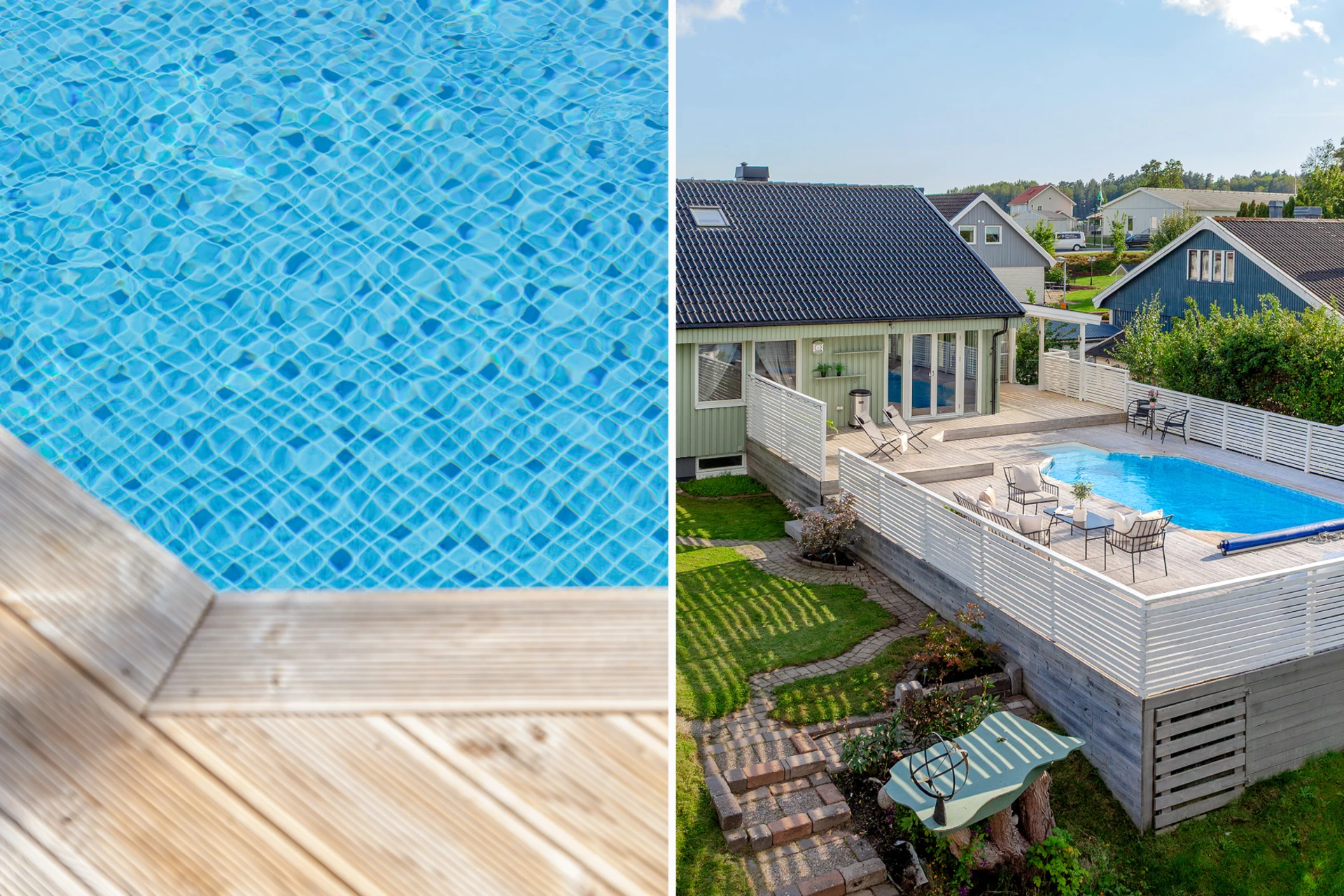 Laminatgolv och blå väggar samt mönstrad fondvägg.
