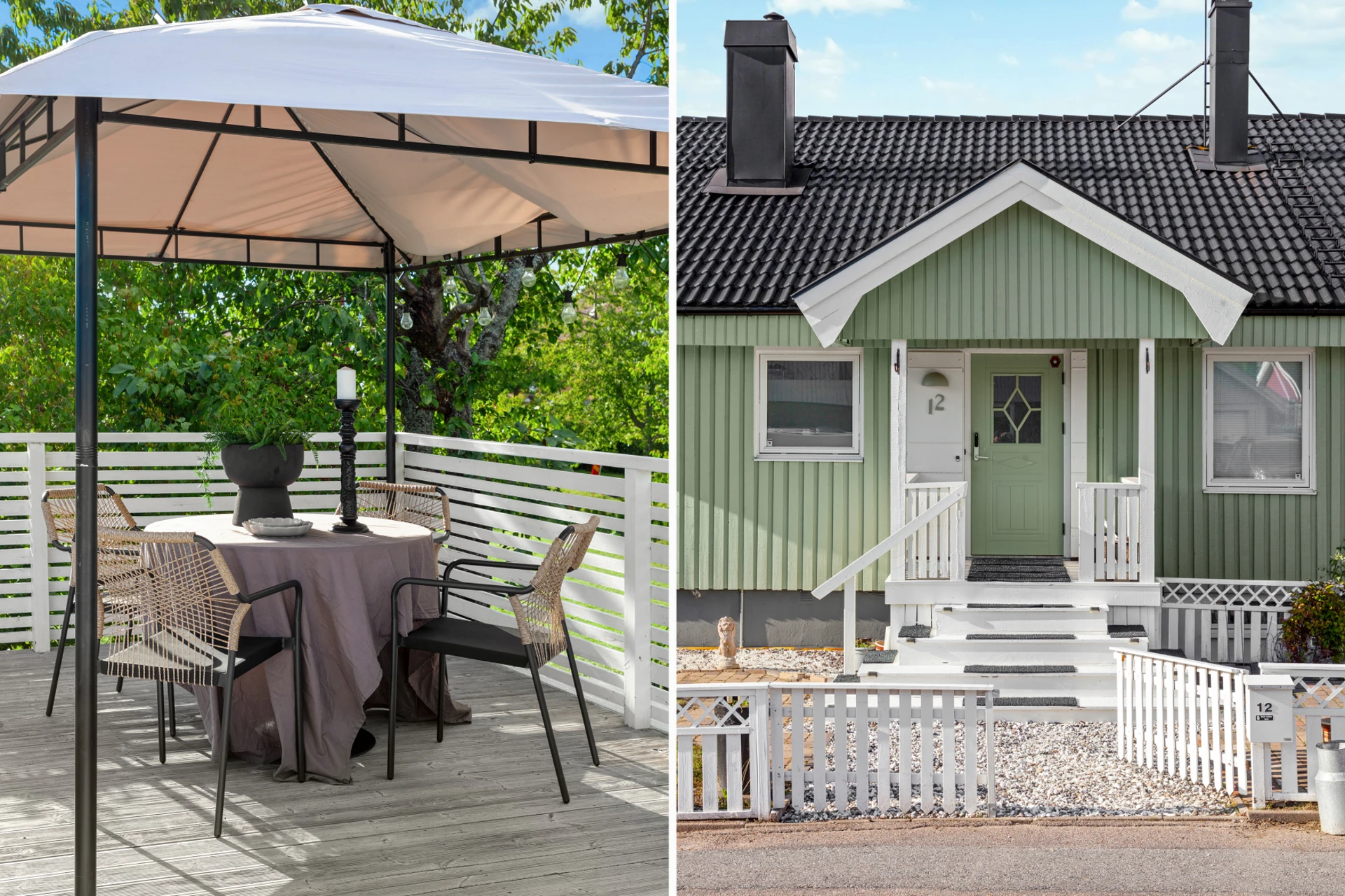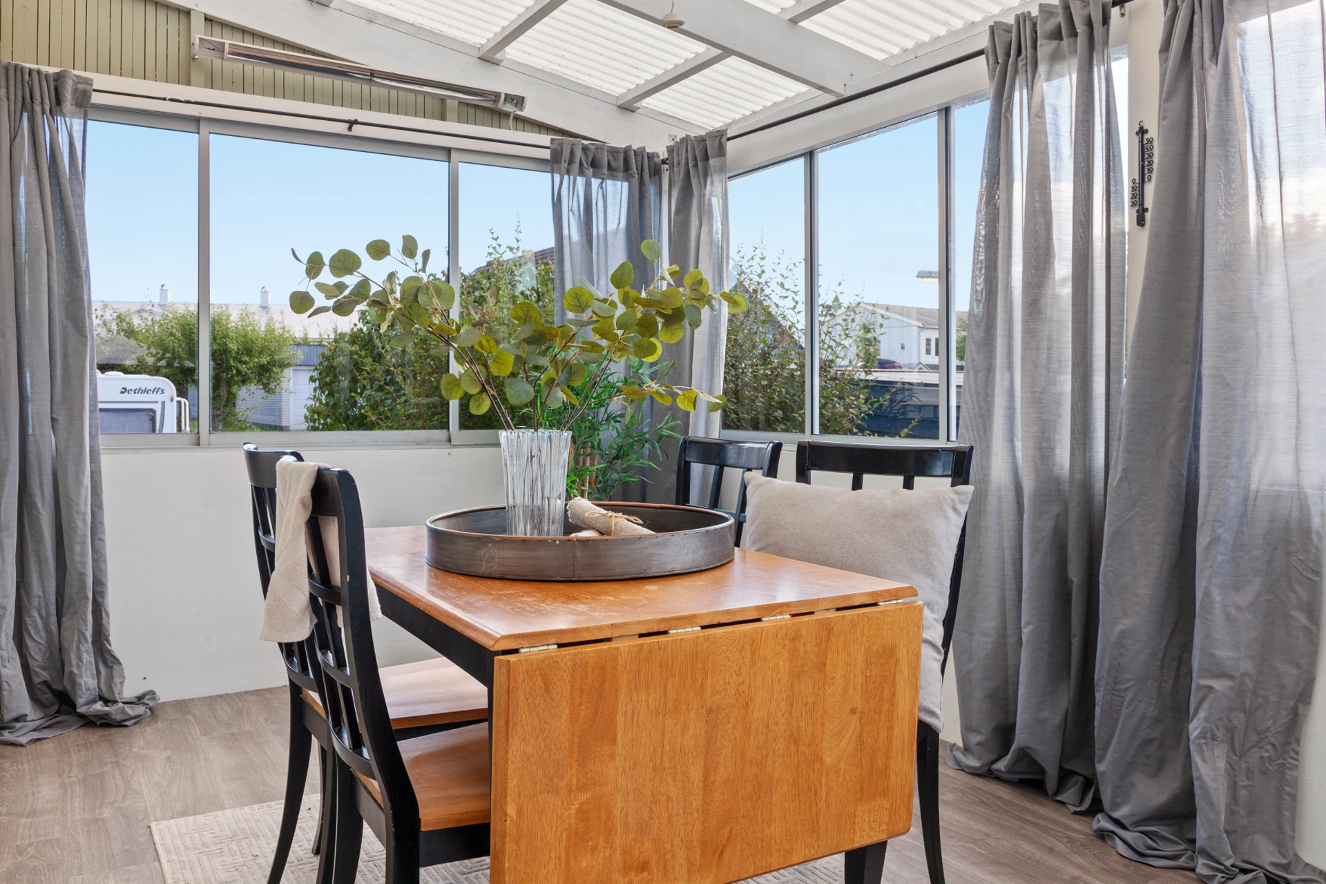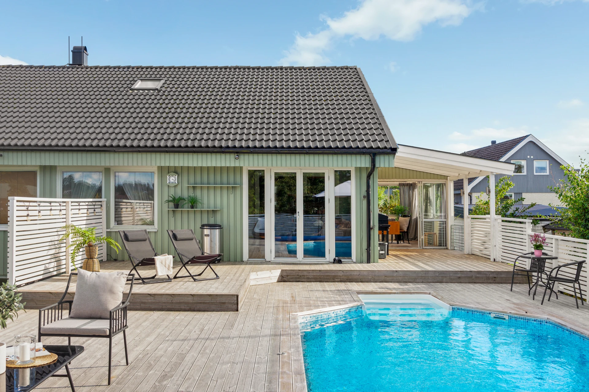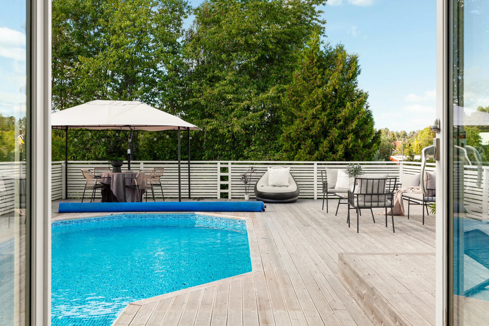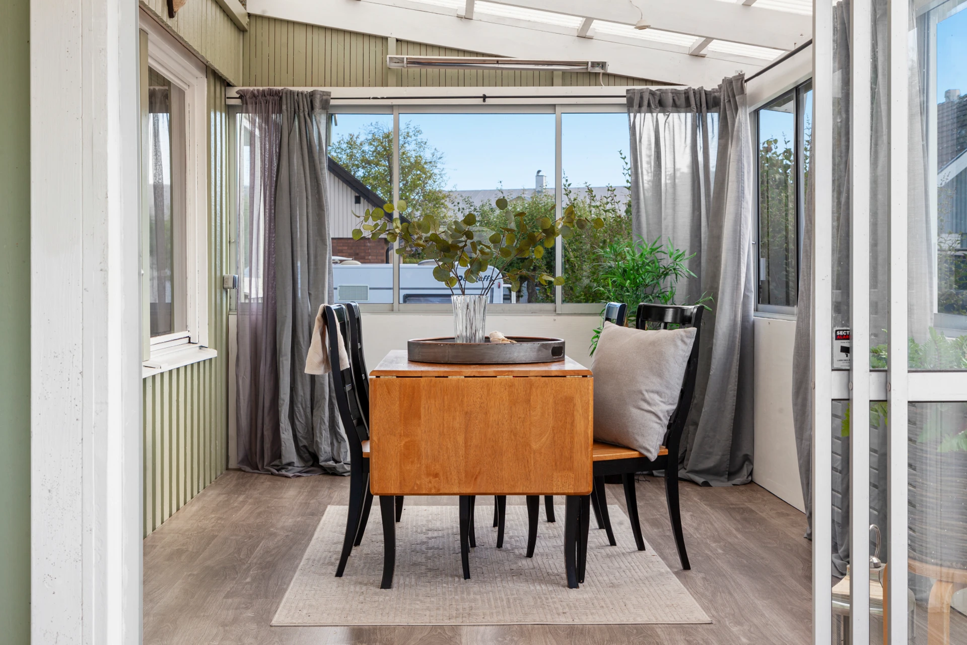 Parkettgolv och grå väggar. Dubbeldörrar som öppnas upp ut mot altanen.