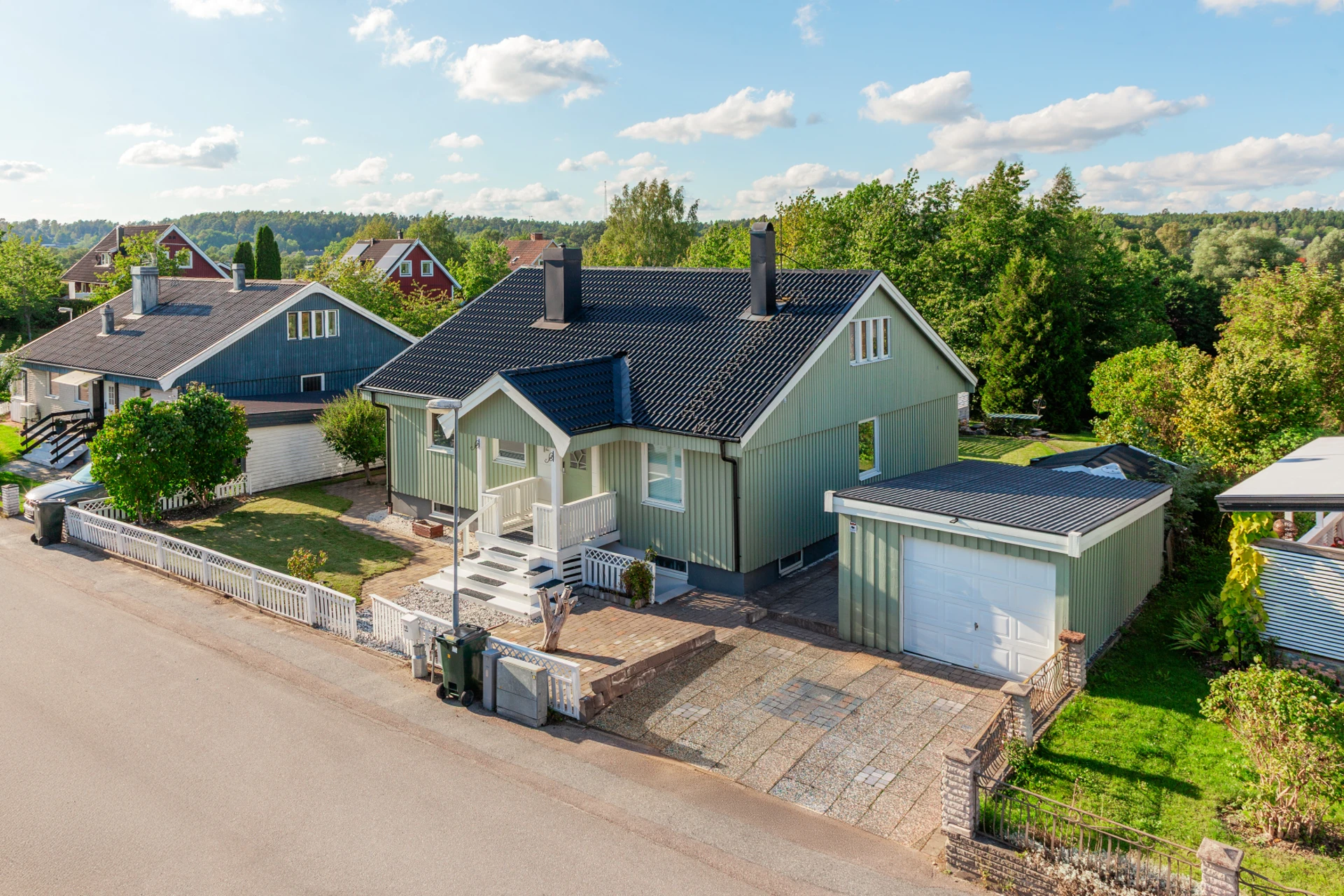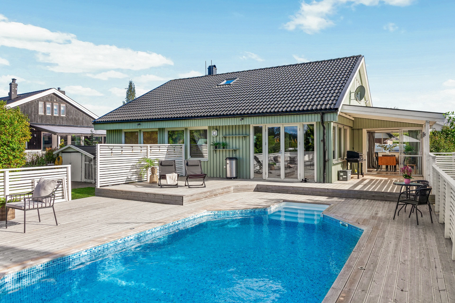 Antracitgrå klinker med golvvärme som övergår till parkettgolv. Grå väggar, plats för avhängning och ytterligare förvaring i skjutdörrsgarderob. Luftvärmepump (Panasonic).