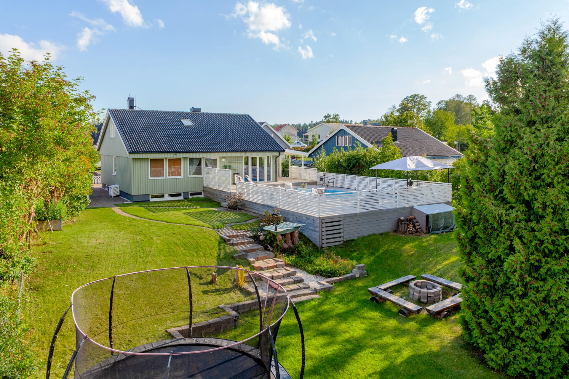 Parkettgolv och vit träpanel på väggar. Här finns en kamin med kassett, och luftvärmepump (Panasonic).