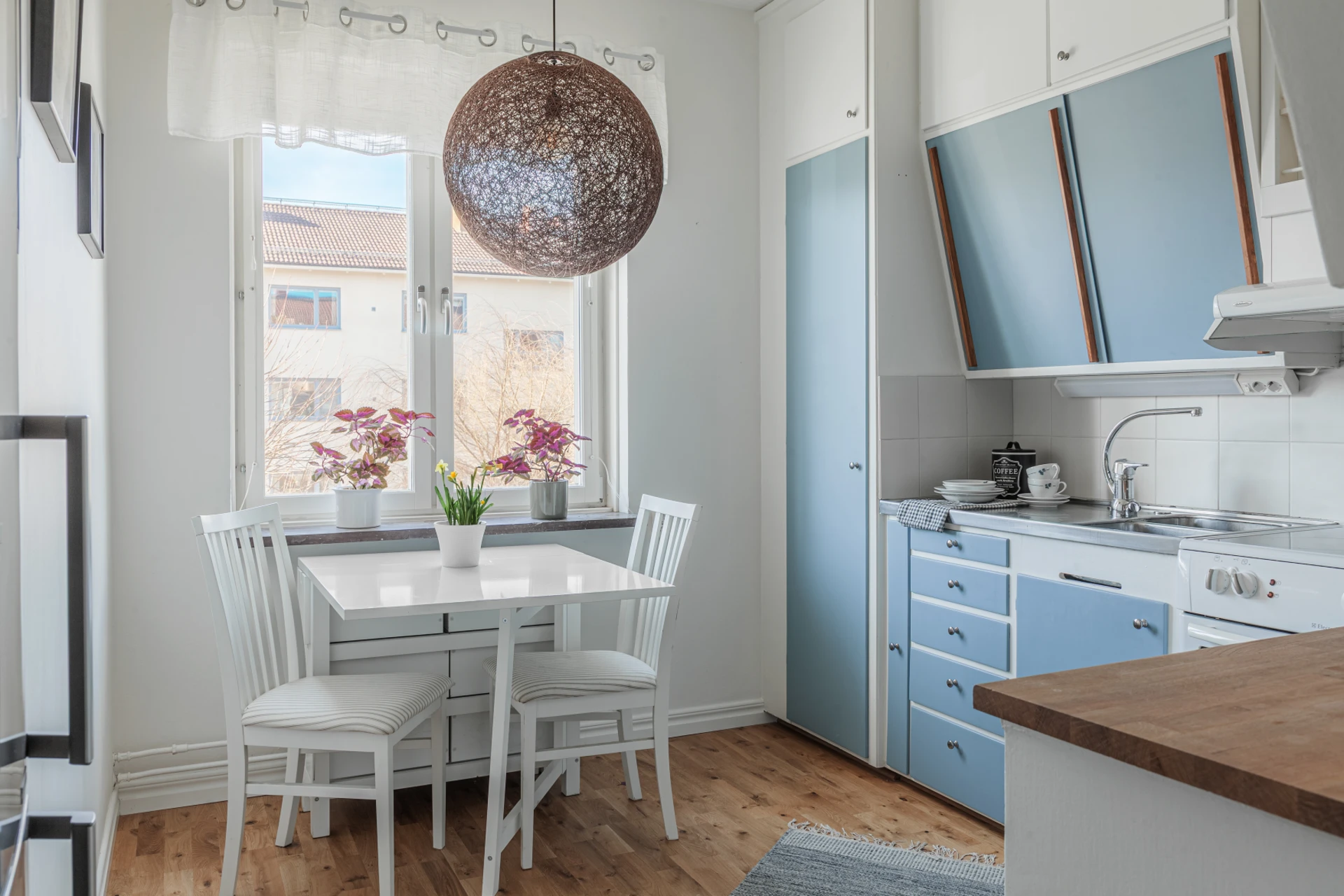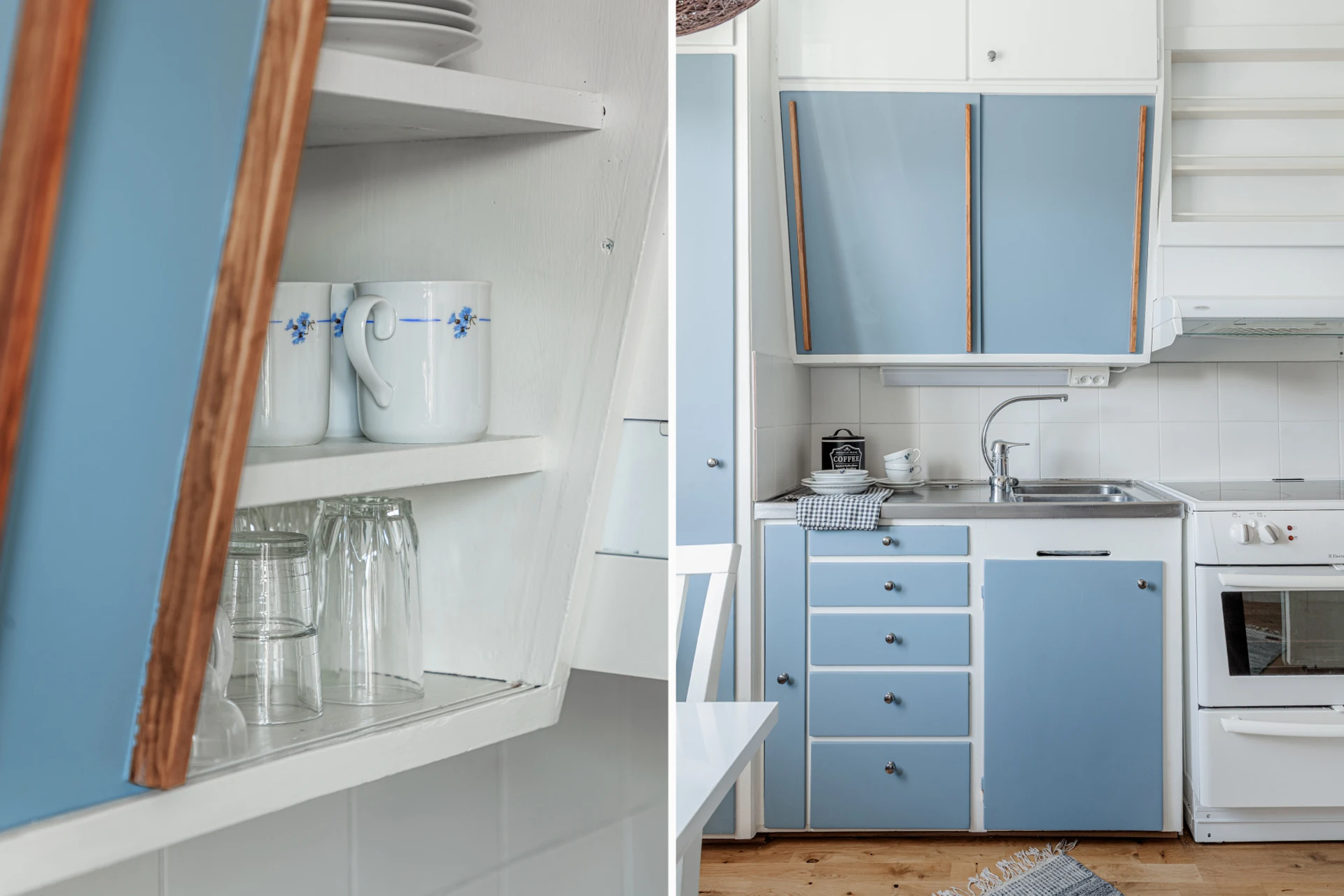 Laminatgolv och vita väggar. Köksinredning i original med blå och vita luckor samt vitt kakel ovanför arbetsbänk i rostfritt och trä. Köket är utrustat med spis med glaskeramikhäll (Electrolux), fläkt (Futurum) och kyl/frys (Samsung) med platsbyggt överskåp. Charmiga snedställda specialtillverkade skjutluckor och utrymme för installation av diskmaskin. Fönster med fönsterbänk i sten och plats för matbord.