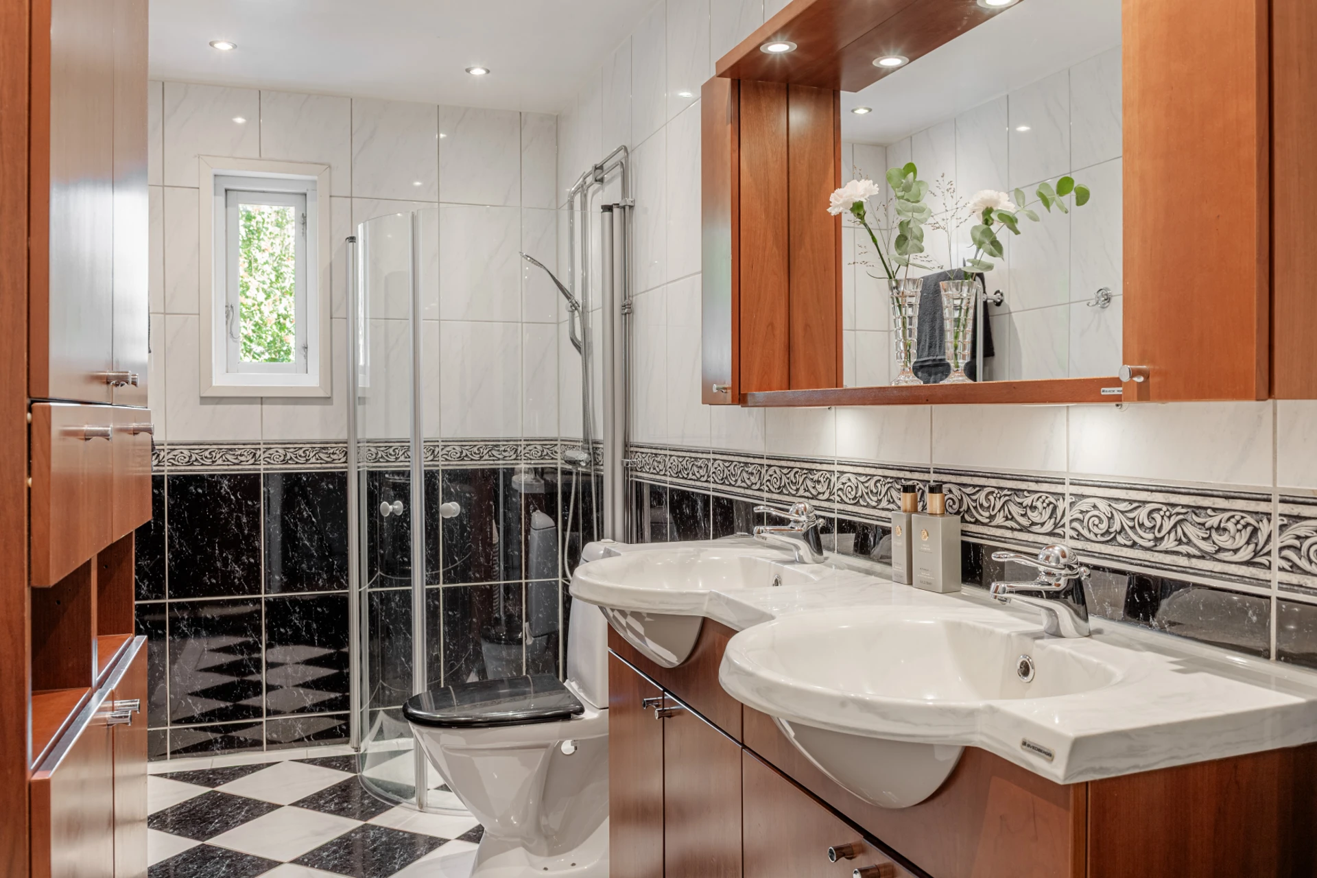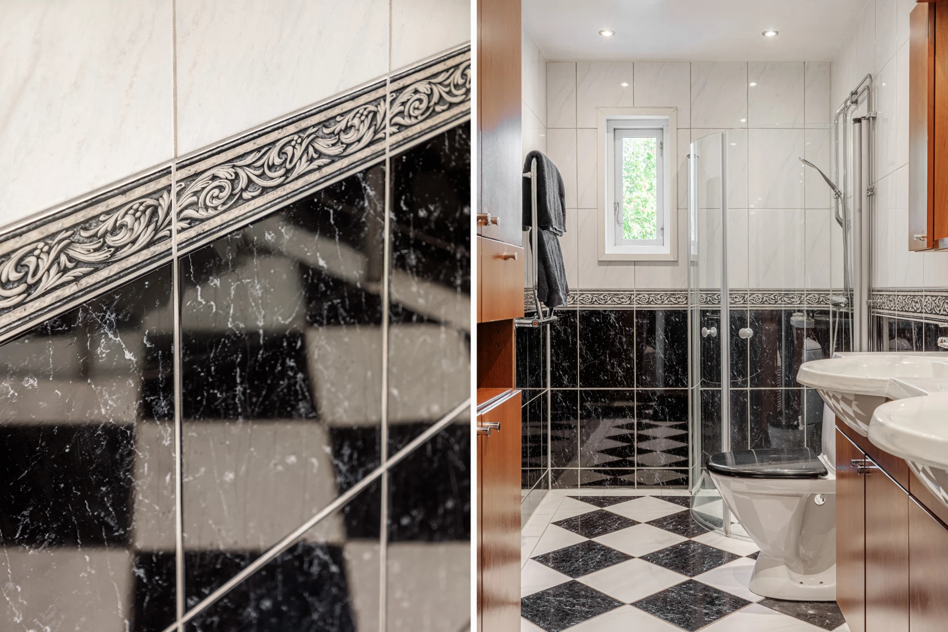 Svart/vitt klinkergolv med golvvärme och svart/vit kaklade väggar. Badrummet är utrustat med WC, dubbelhandfat med kommod, spegel med spotlights, dusch med glasdörrar, handdukstork samt skåp.