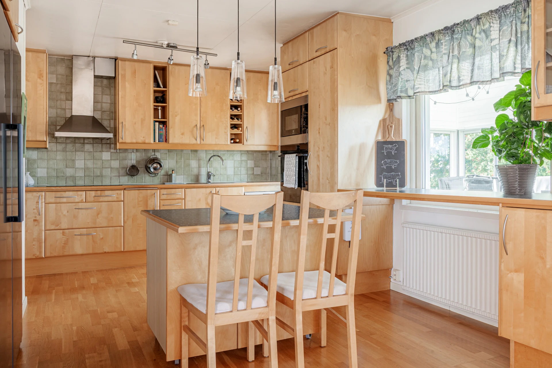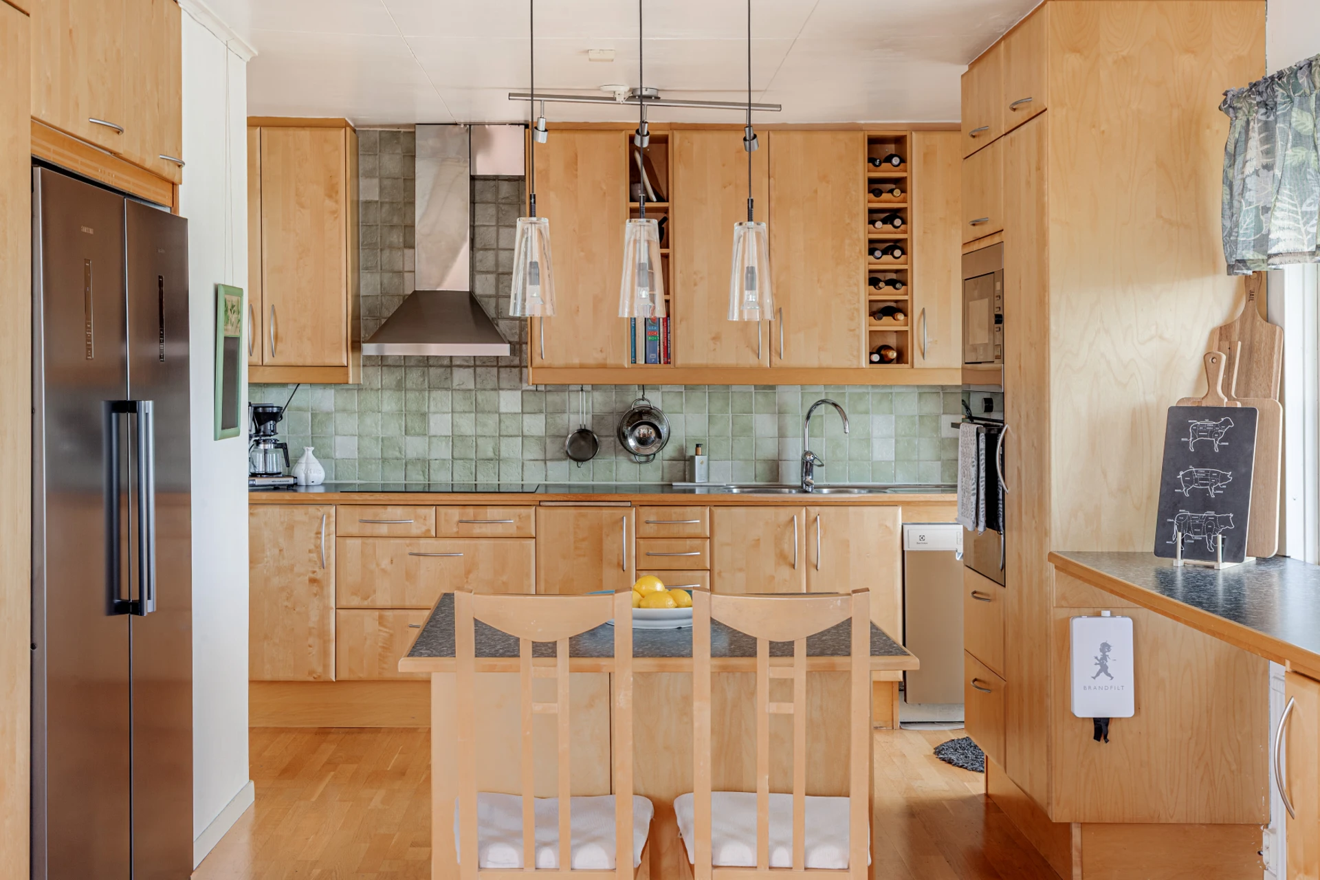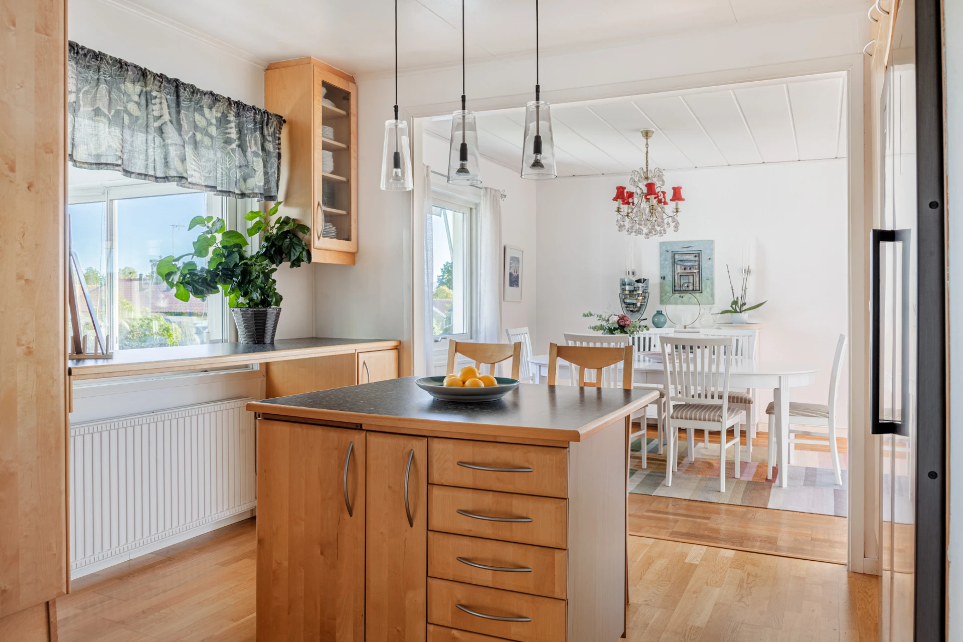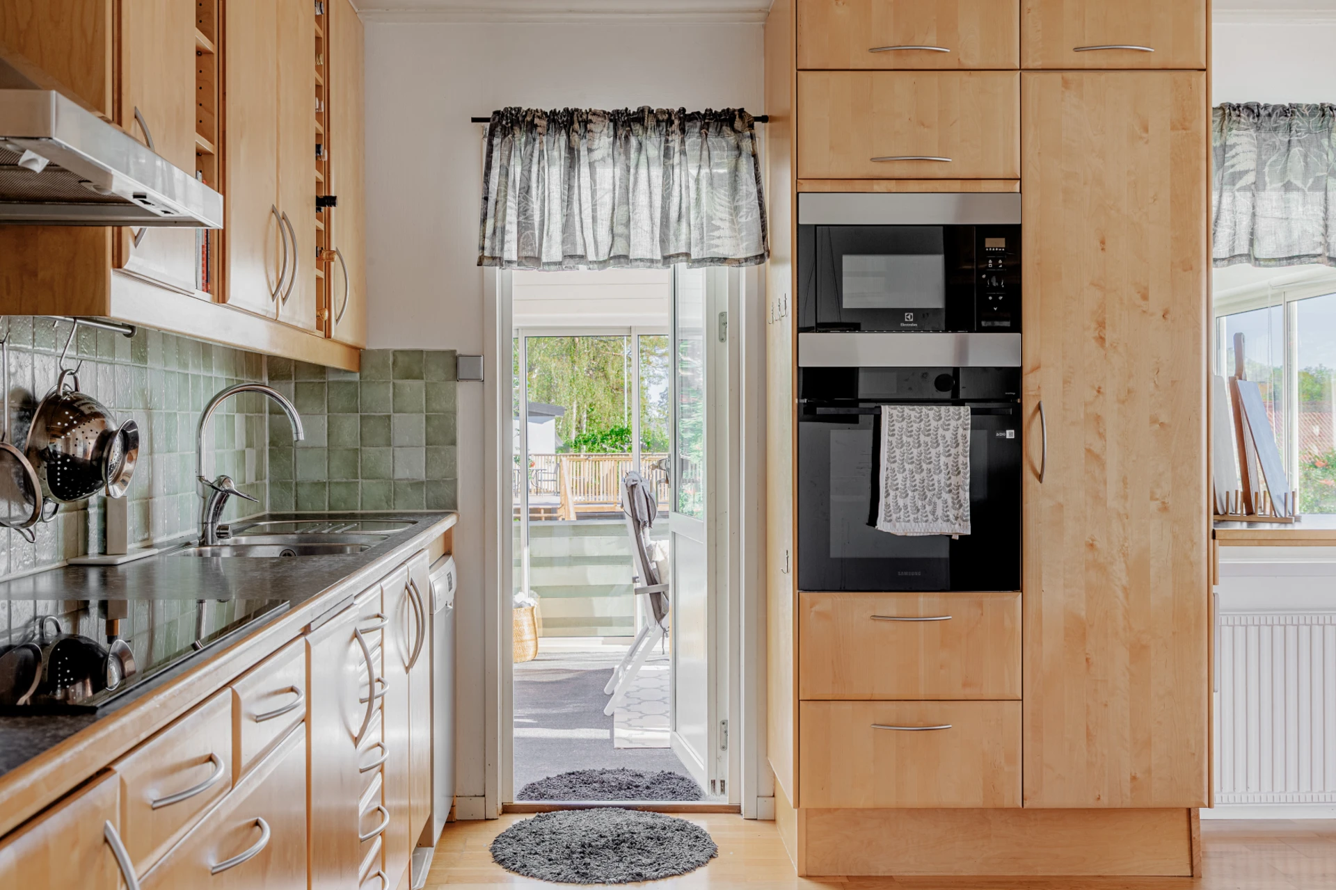 Parkettgolv och vitmålade väggar. Köksinredning från Ballingslöv med luckor i gediget björkträ, arbetsbänk i laminat och kakel som stänkskydd. Köket är utrustat med kyl och frys med ismaskin i fullhöjd (Samsung), extra bred induktionshäll (Electrolux), inbyggd varmluftsugn med ångfunktion (Samsung), fläkt, inbyggd mikro (Electrolux) samt diskmaskin (Electrolux). Flyttbar köksö på hjul. Utgång till inglasat uterum och vidare access till altanen med inbyggt spabad.