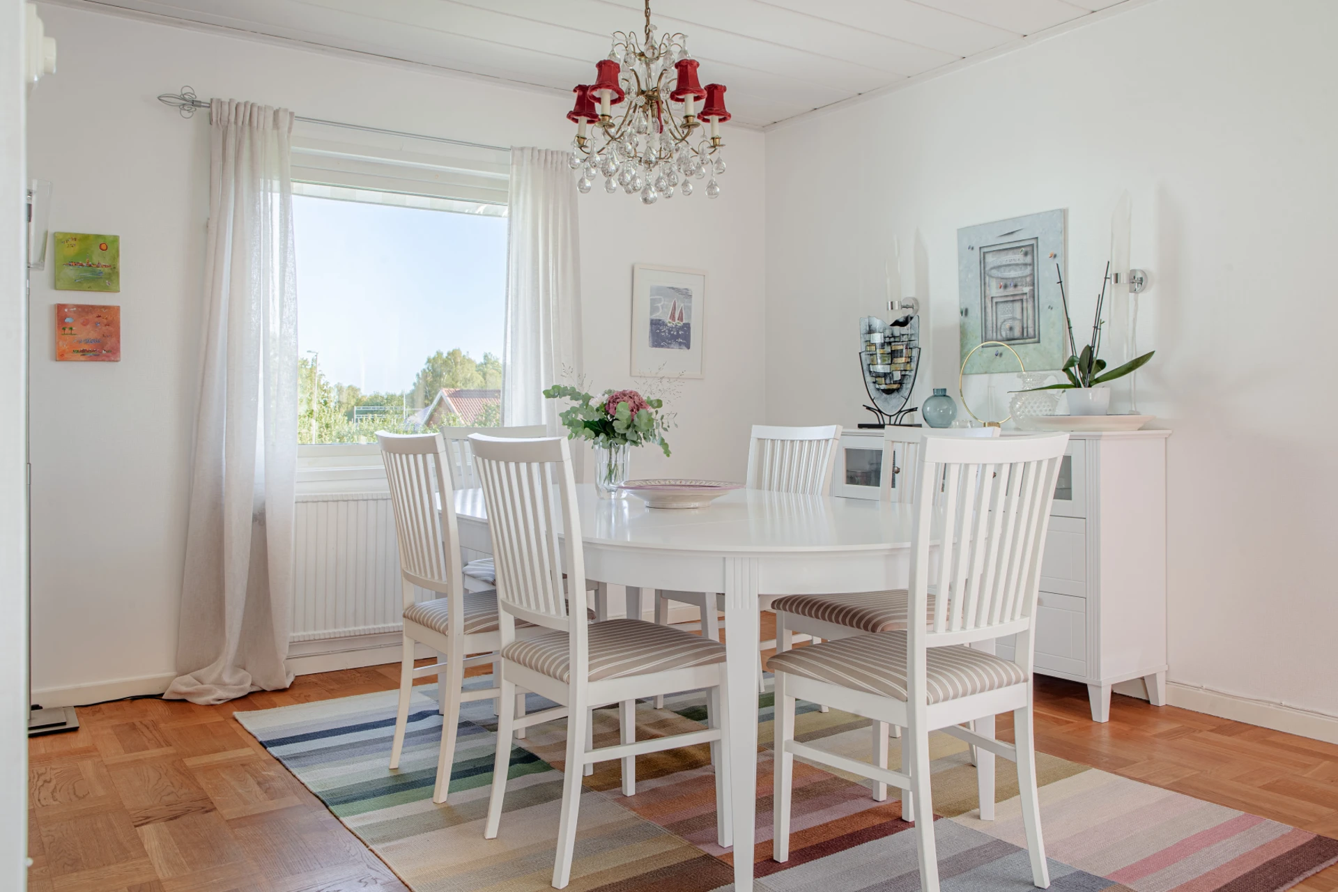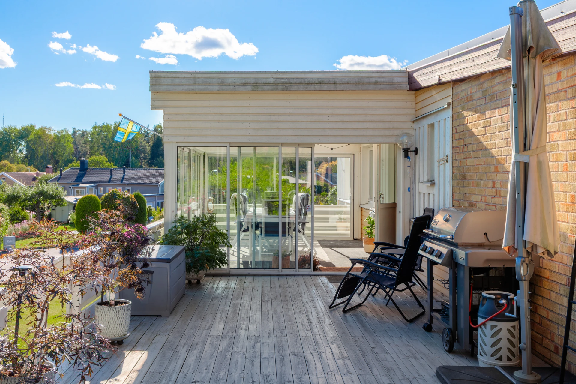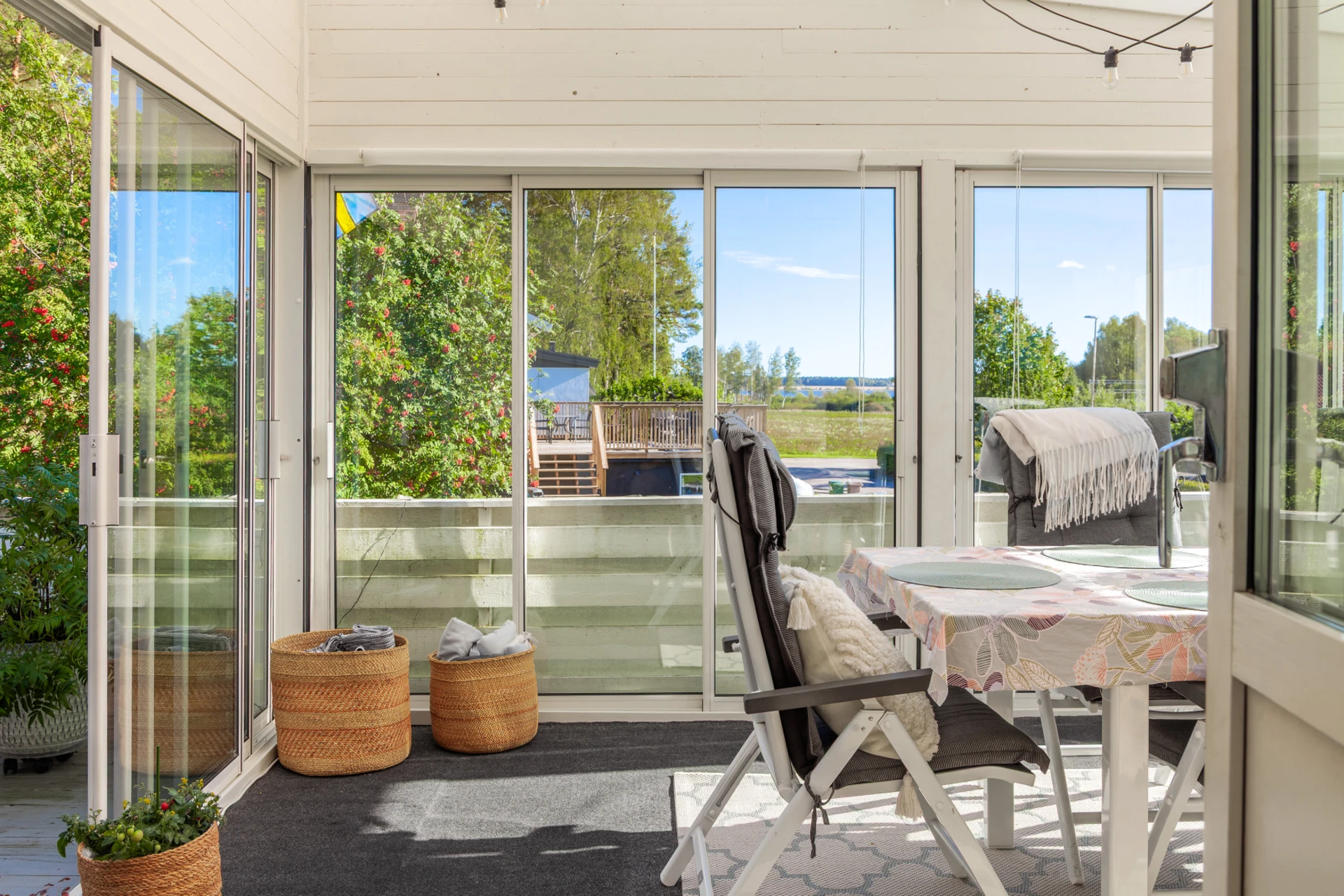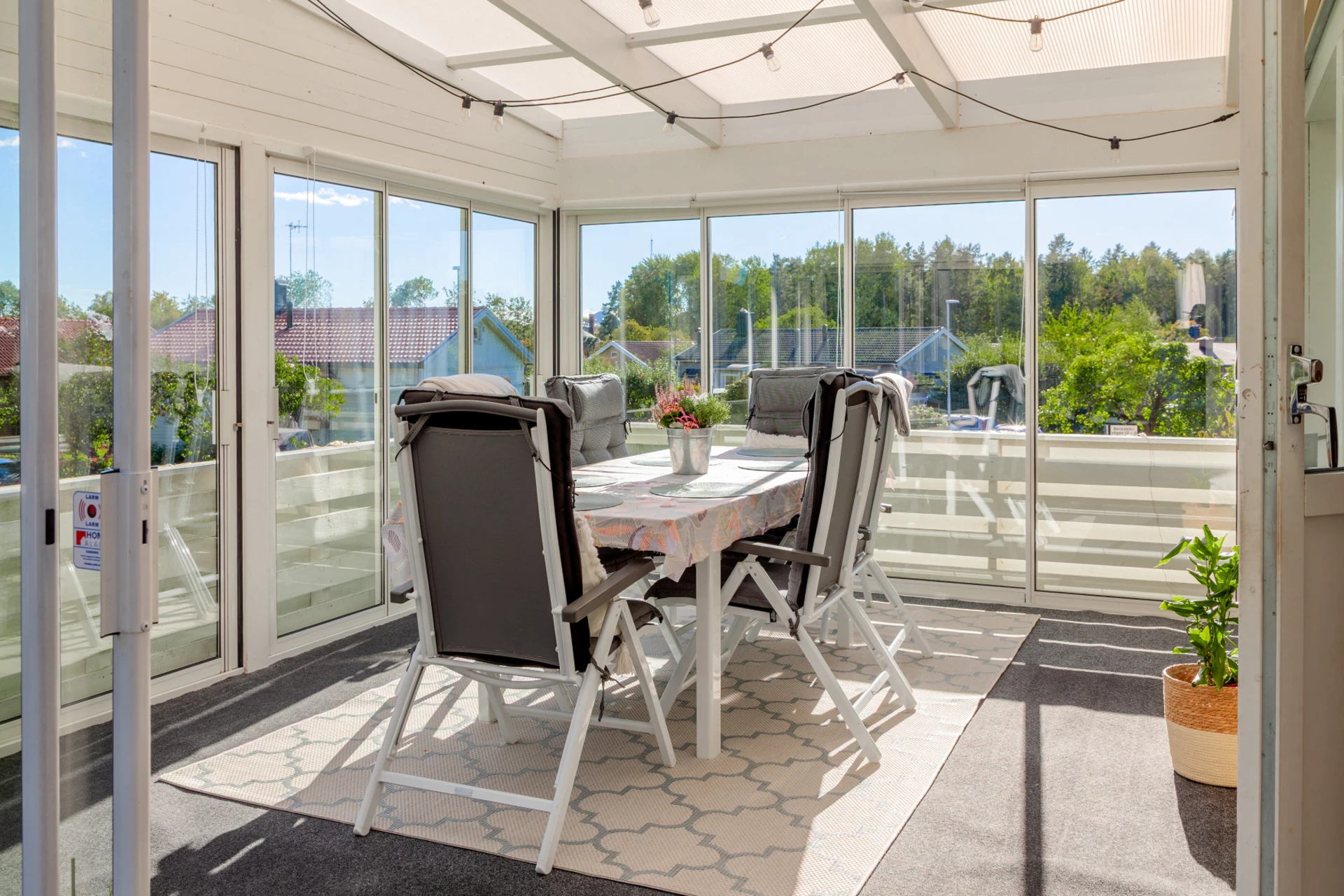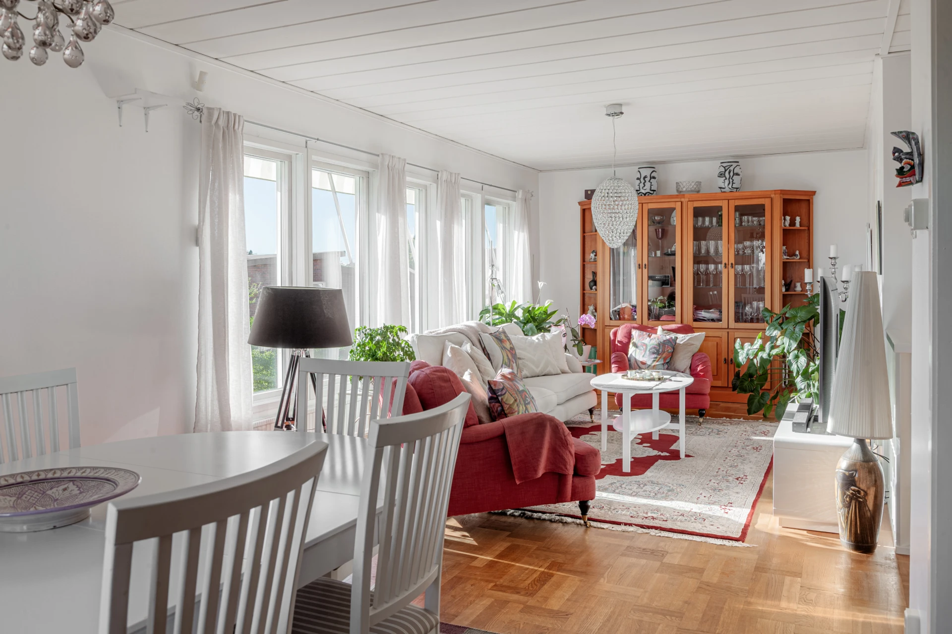 Parkettgolv och vitmålade väggar. Köksinredning från Ballingslöv med luckor i gediget björkträ, arbetsbänk i laminat och kakel som stänkskydd. Köket är utrustat med kyl och frys med ismaskin i fullhöjd (Samsung), extra bred induktionshäll (Electrolux), inbyggd varmluftsugn med ångfunktion (Samsung), fläkt, inbyggd mikro (Electrolux) samt diskmaskin (Electrolux). Flyttbar köksö på hjul. Utgång till inglasat uterum och vidare access till altanen med inbyggt spabad.