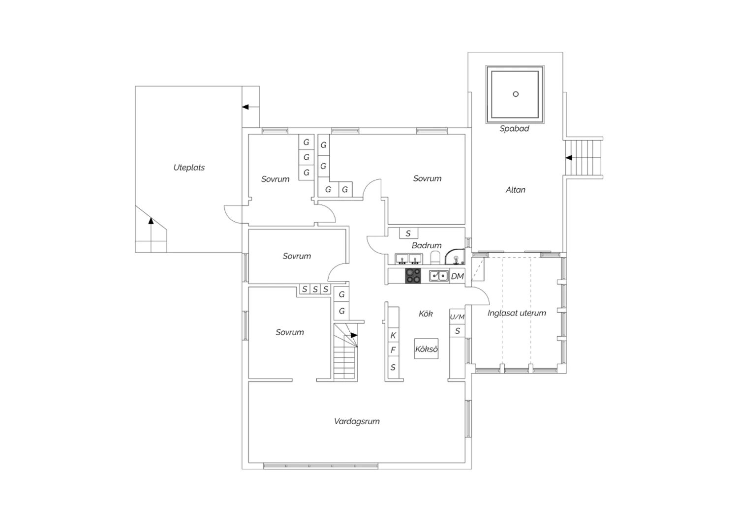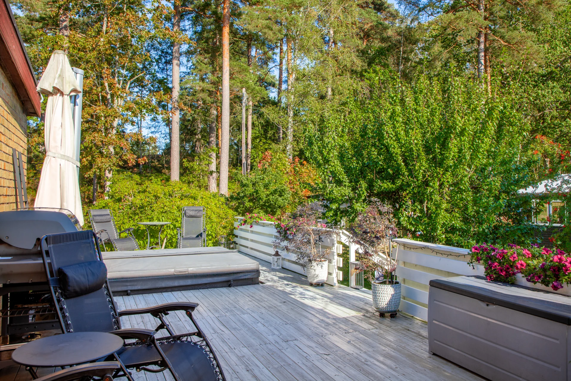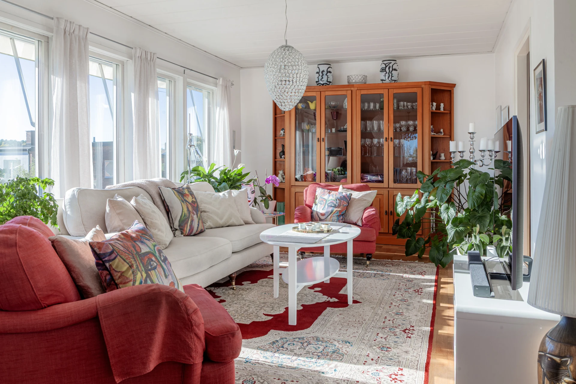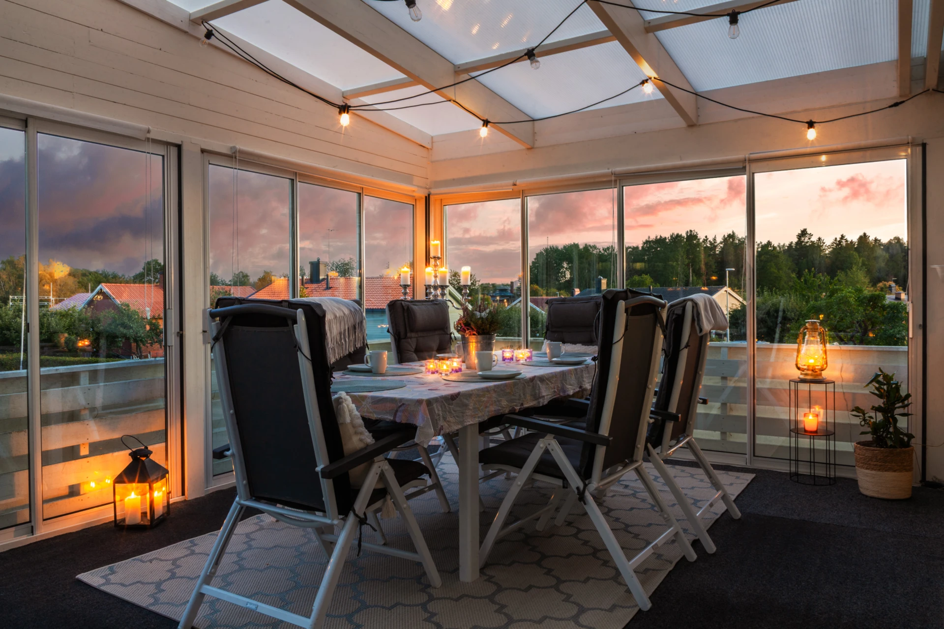 Parkettgolv och vitmålade väggar. Köksinredning från Ballingslöv med luckor i gediget björkträ, arbetsbänk i laminat och kakel som stänkskydd. Köket är utrustat med kyl och frys med ismaskin i fullhöjd (Samsung), extra bred induktionshäll (Electrolux), inbyggd varmluftsugn med ångfunktion (Samsung), fläkt, inbyggd mikro (Electrolux) samt diskmaskin (Electrolux). Flyttbar köksö på hjul. Utgång till inglasat uterum och vidare access till altanen med inbyggt spabad.