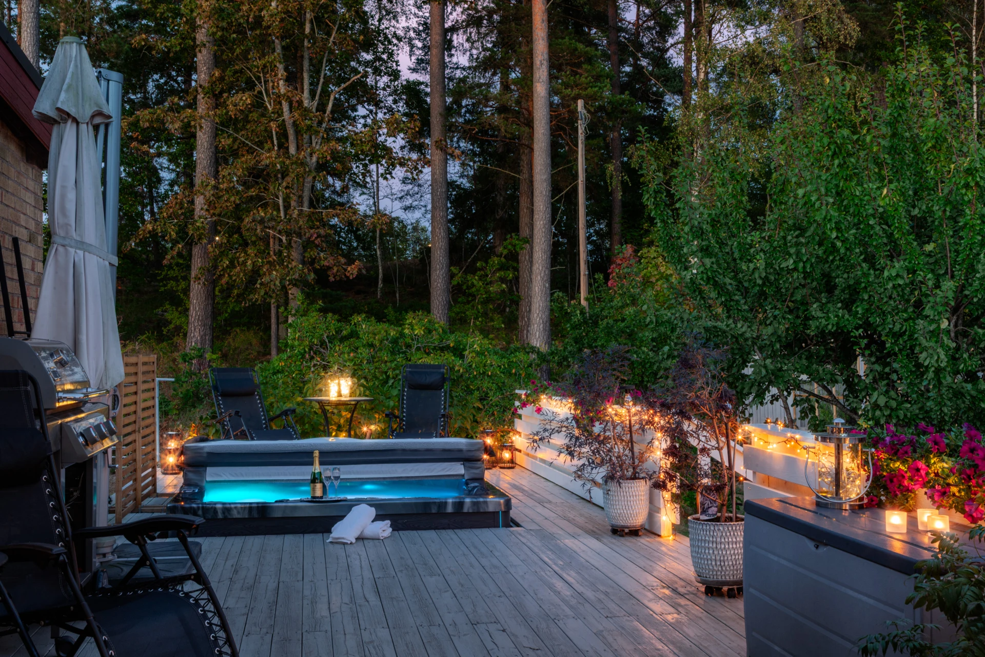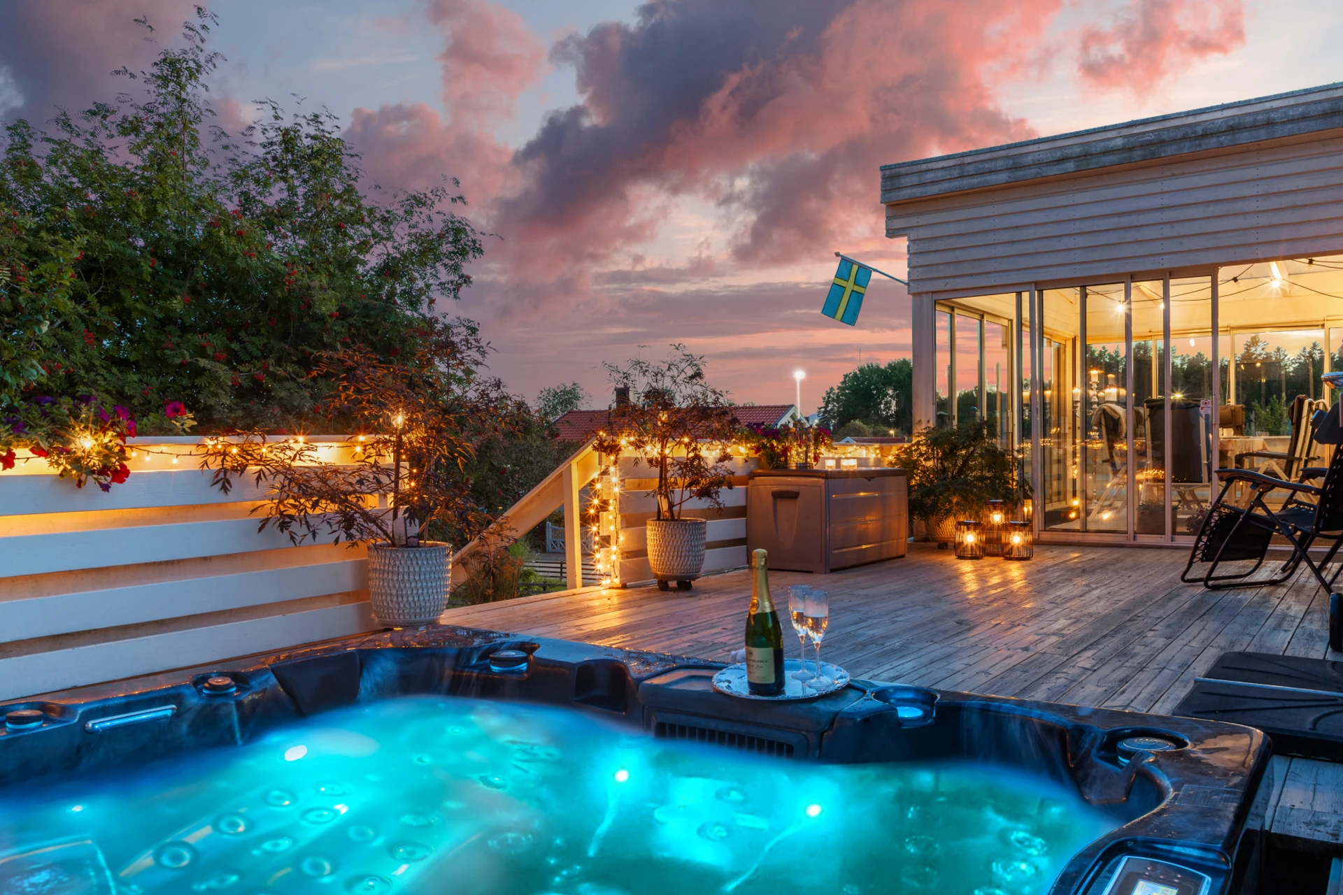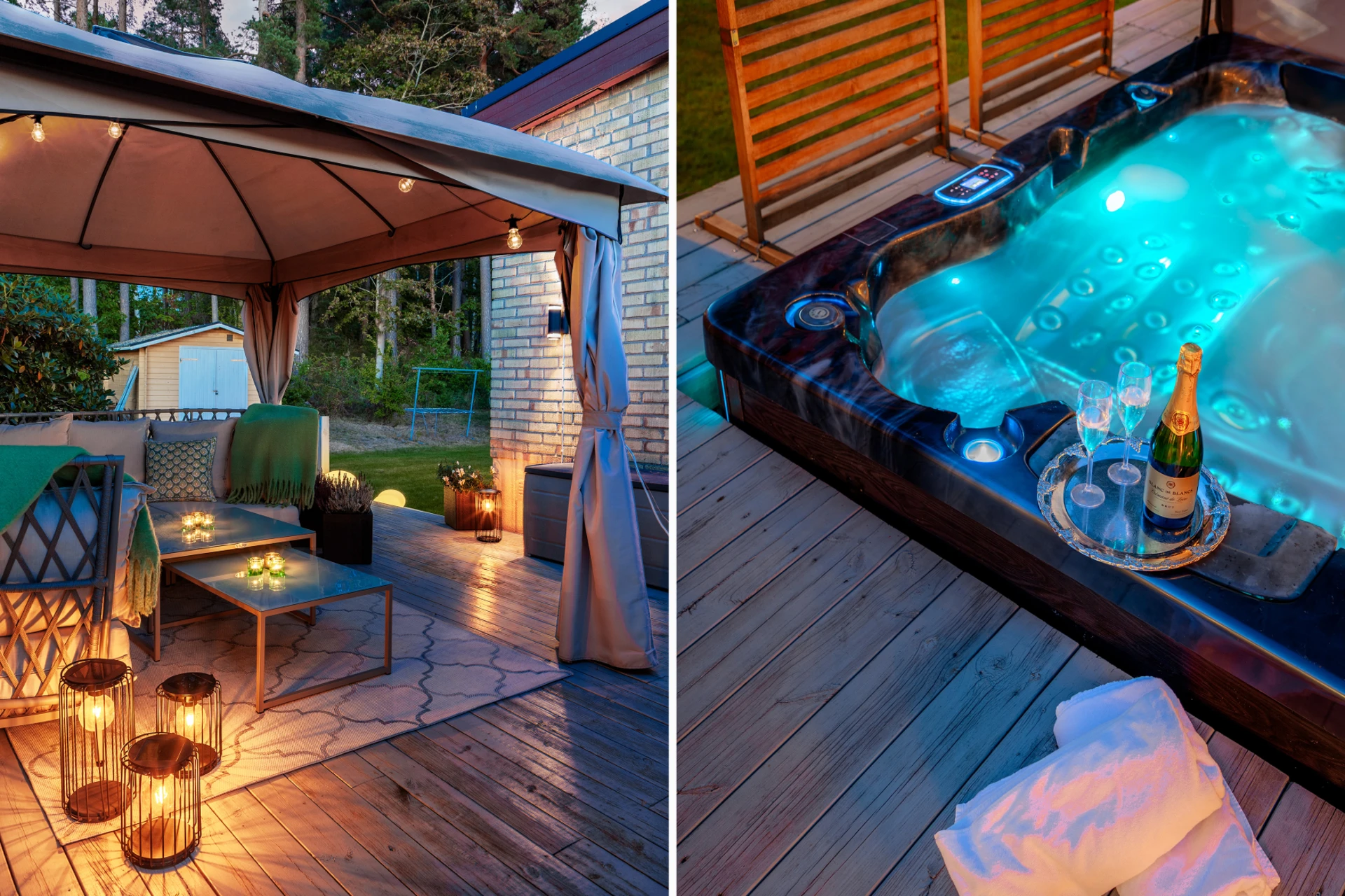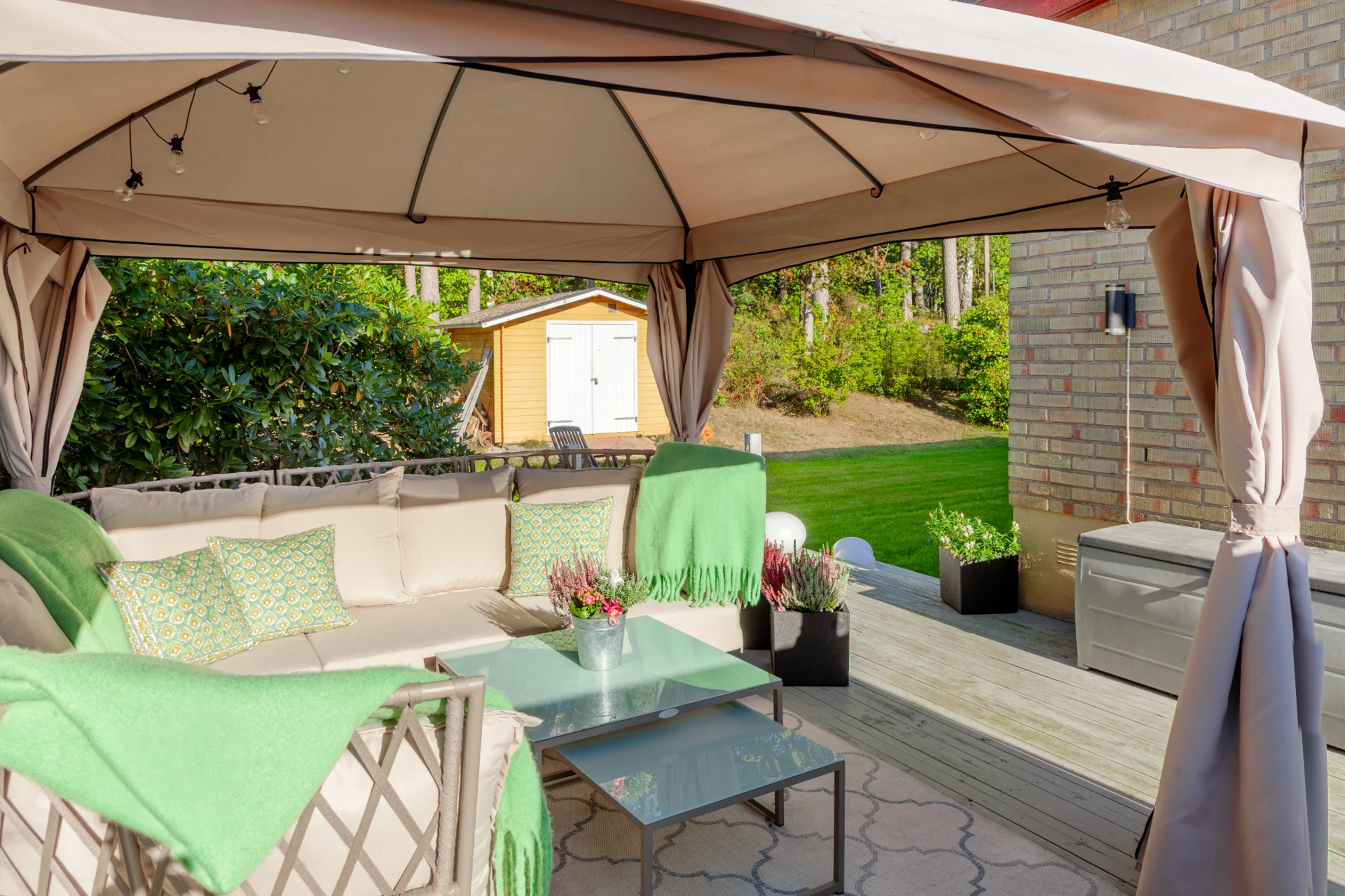 Parkettgolv och vitmålade väggar. Köksinredning från Ballingslöv med luckor i gediget björkträ, arbetsbänk i laminat och kakel som stänkskydd. Köket är utrustat med kyl och frys med ismaskin i fullhöjd (Samsung), extra bred induktionshäll (Electrolux), inbyggd varmluftsugn med ångfunktion (Samsung), fläkt, inbyggd mikro (Electrolux) samt diskmaskin (Electrolux). Flyttbar köksö på hjul. Utgång till inglasat uterum och vidare access till altanen med inbyggt spabad.