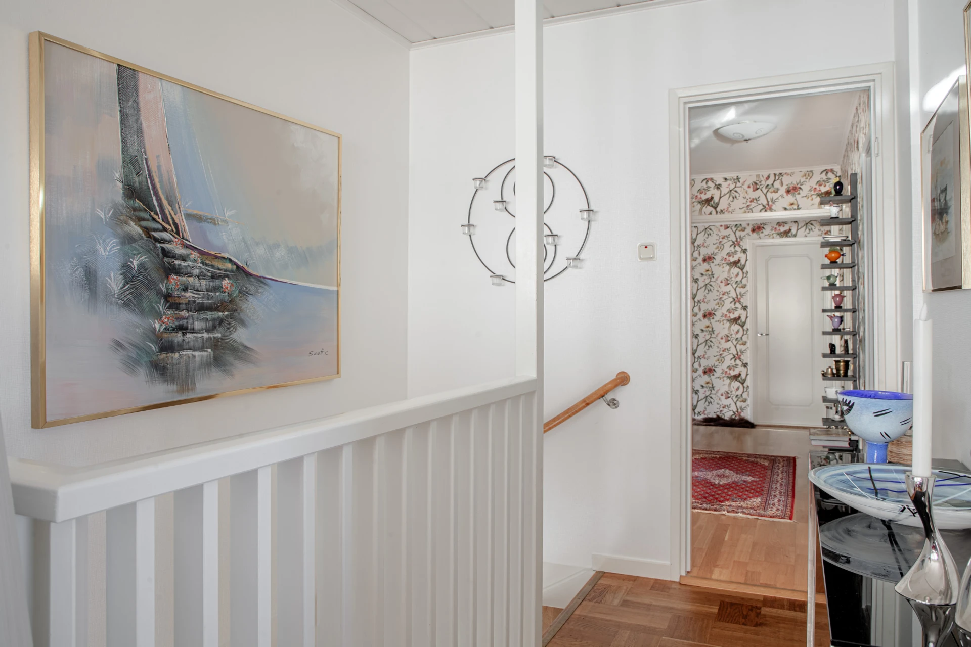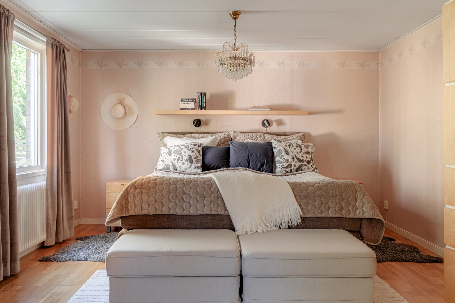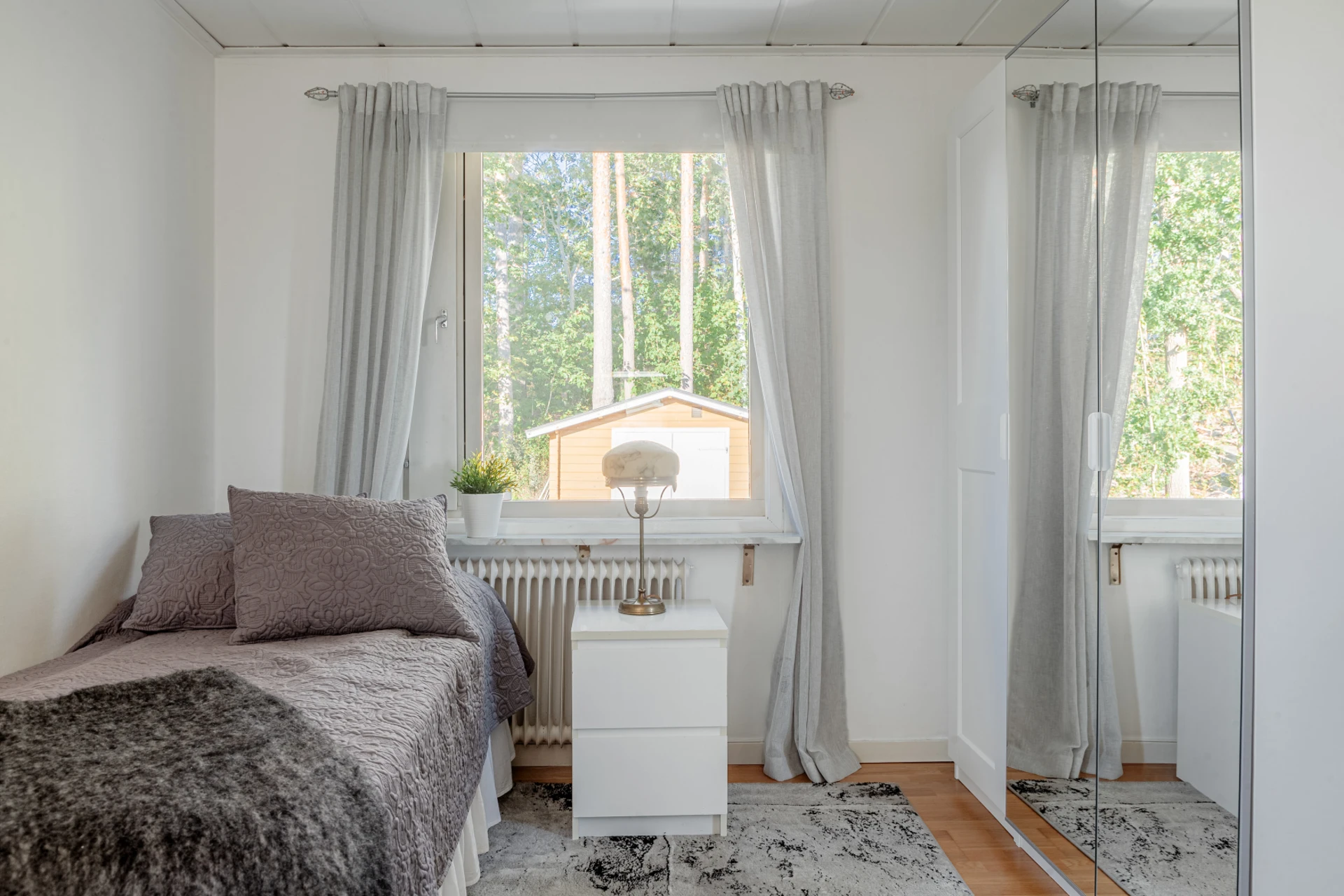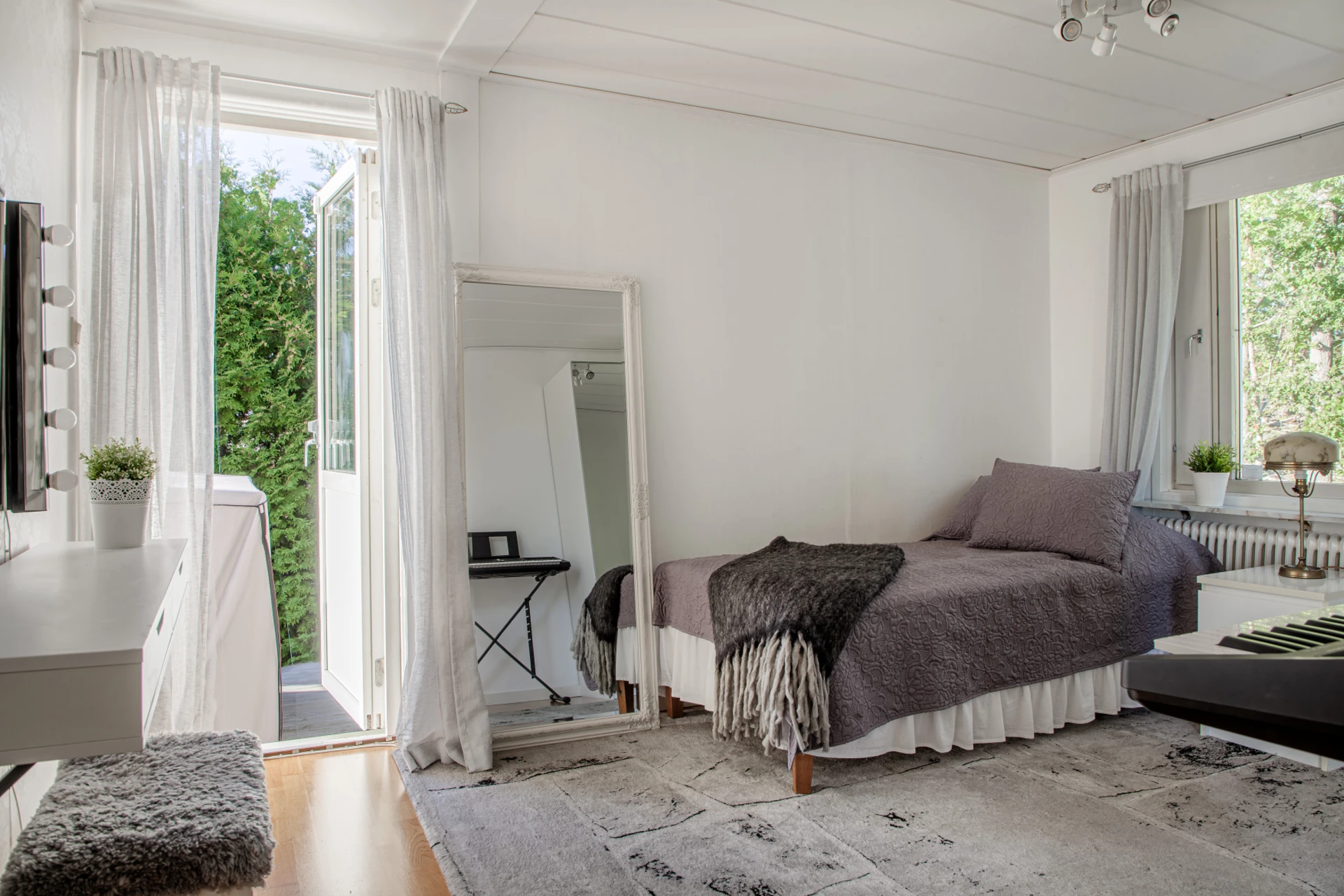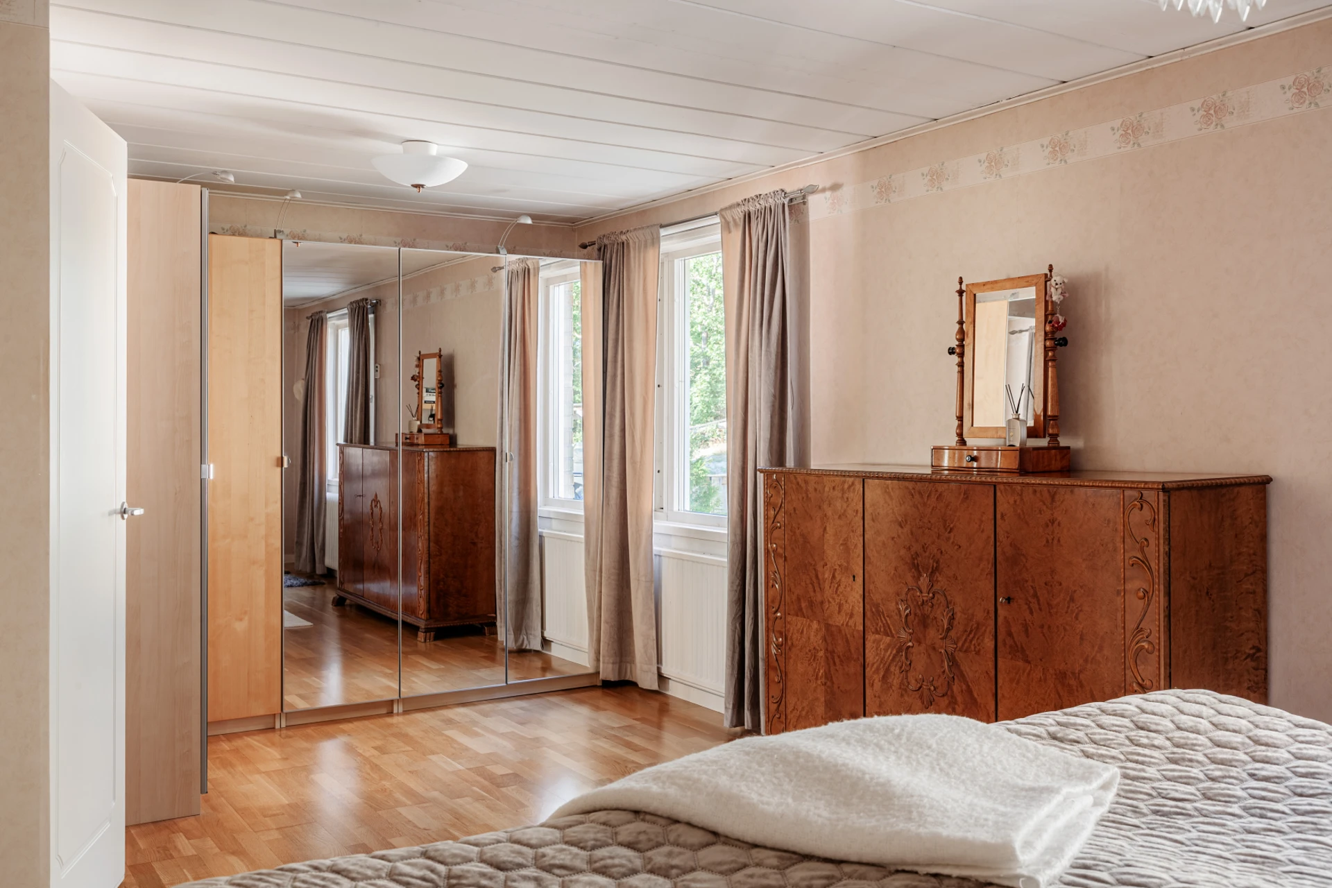 Ekparkett och vitmålade väggar med en tapetserad fondvägg. Förvaring i en dubbelgarderob med spegeldörrar samt en garderob med dörr.