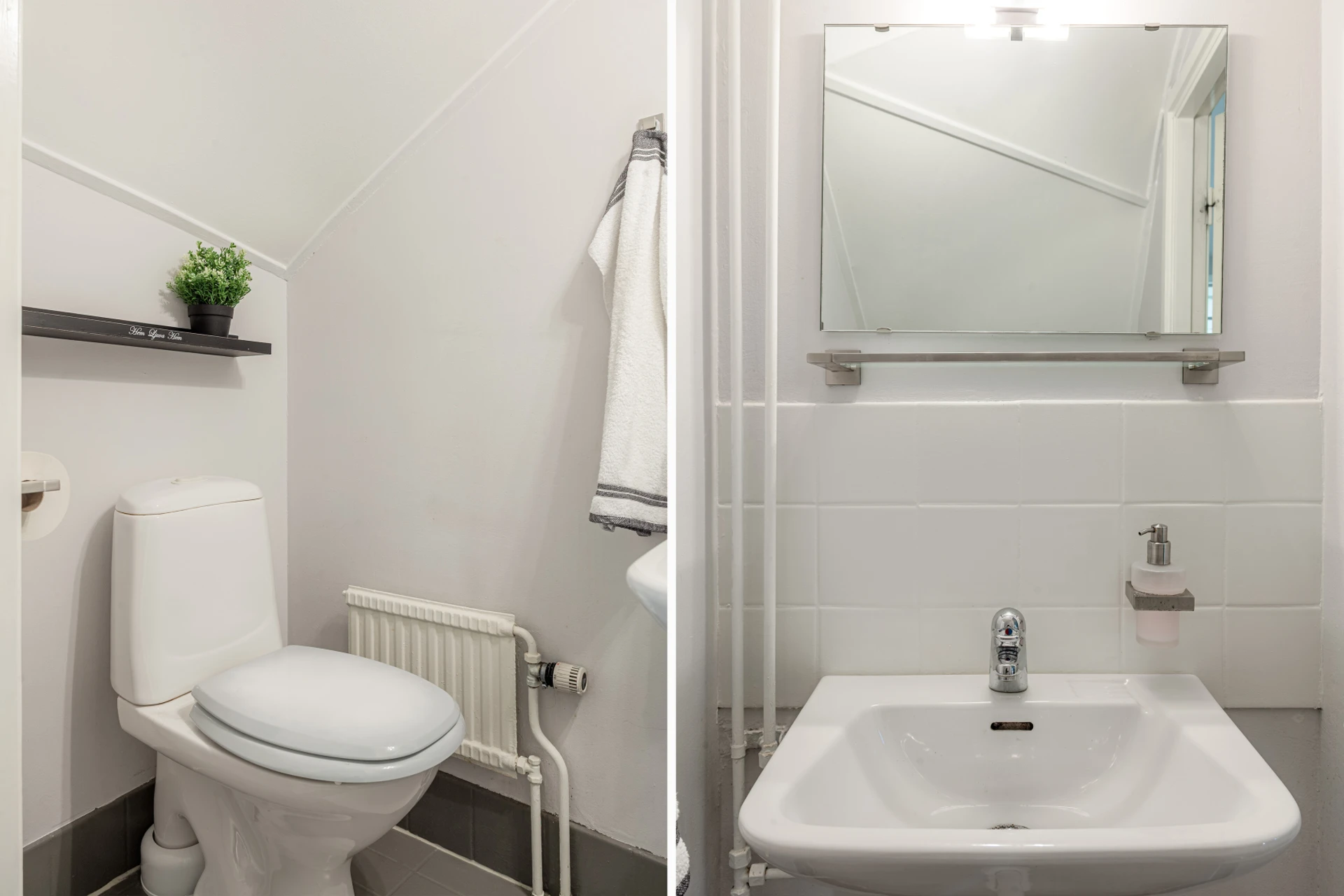 Gråmålat klinkergolv och målade väggar. Toaletten är utrustat med WC, handfat samt spegel.