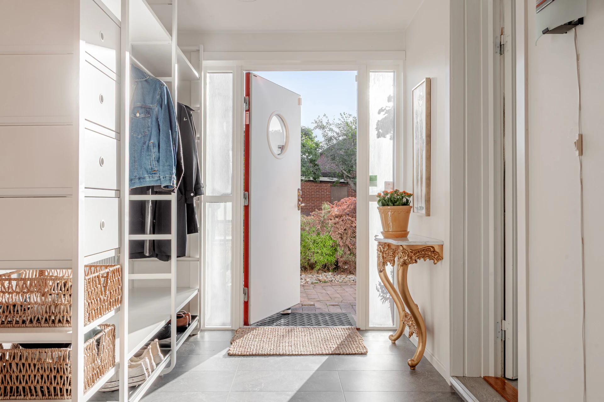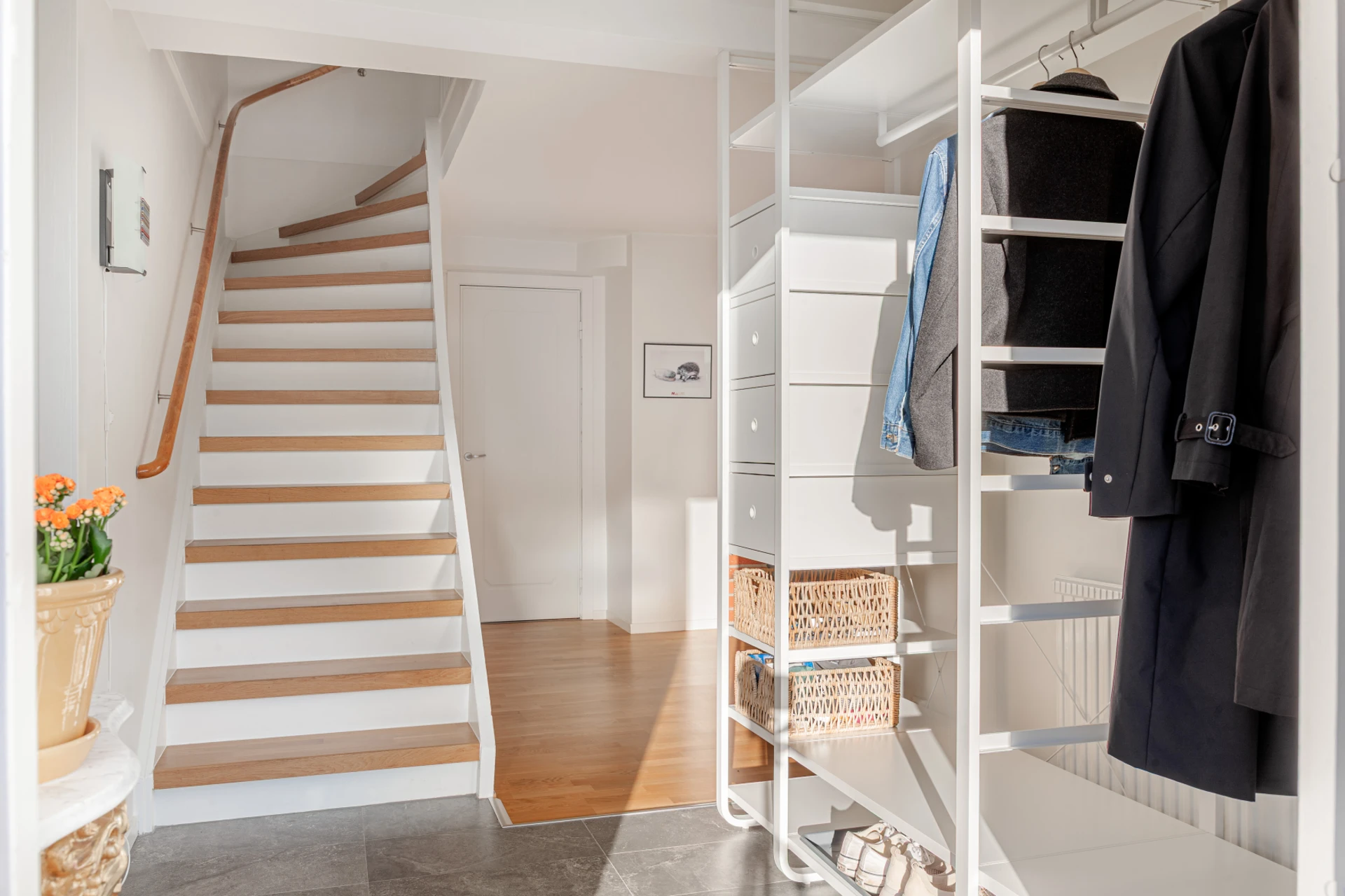 Grått klinkergolv och vitmålade väggar. IKEA förvaringssystem.