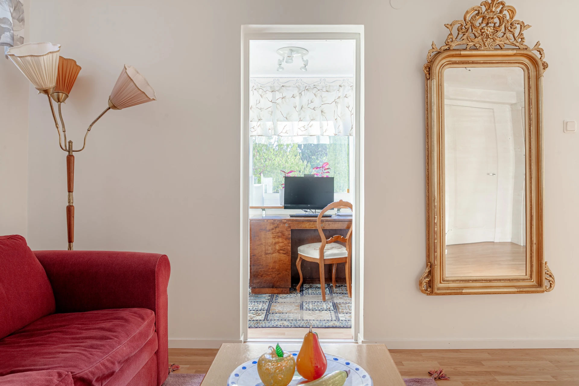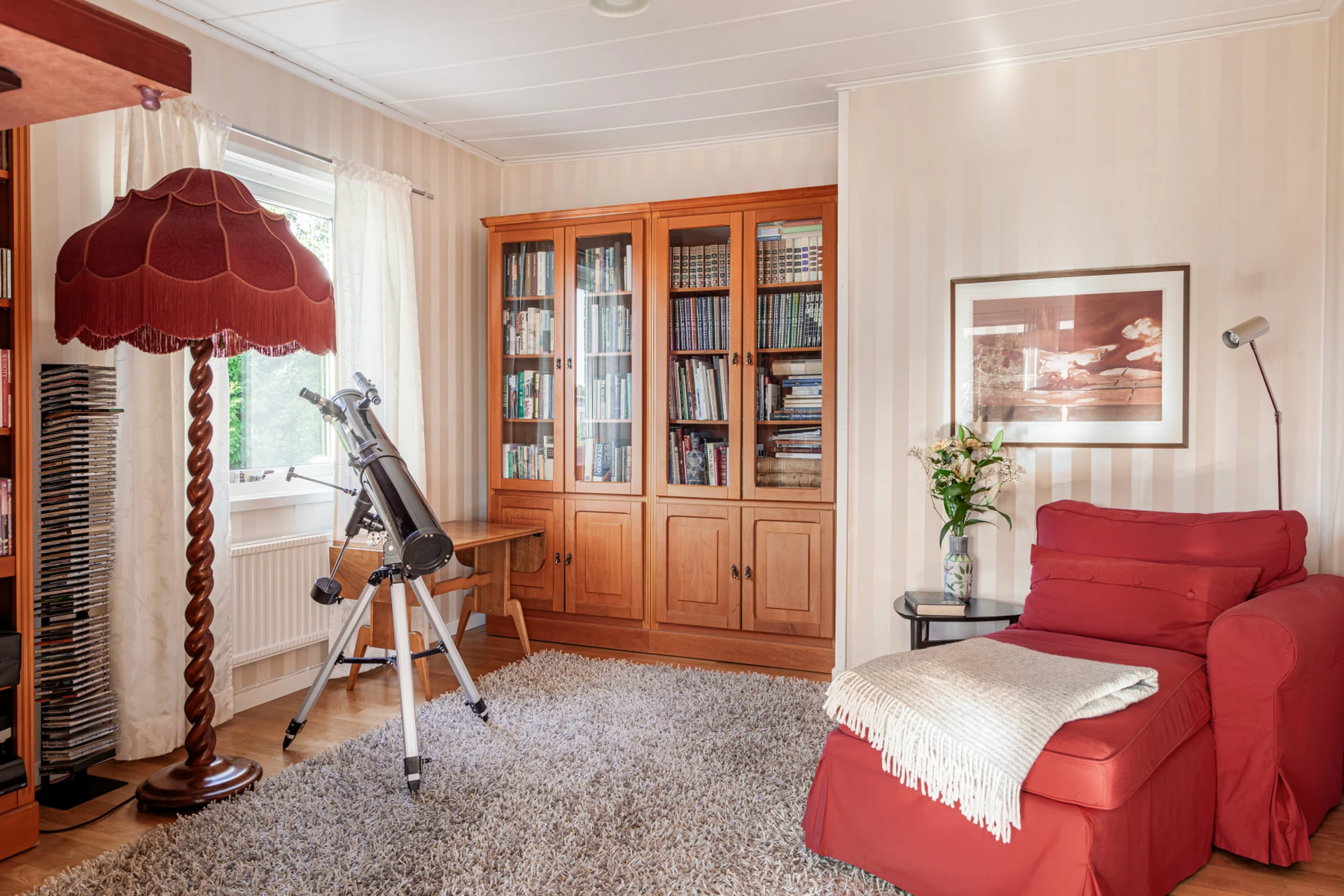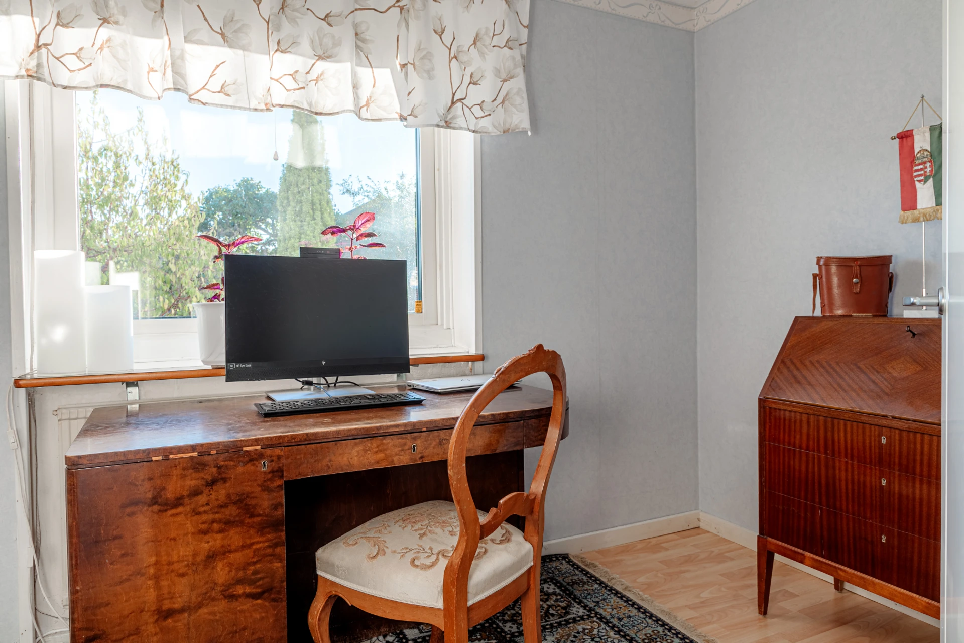 Björklaminat och tapetserade väggar. Rummet är ett perfekt utrymme för kontor eller som mindre sovrum, men eftersom det är mindre än 7kvm räknas det inte in i totala "antalet rum" i marknadsföringen.