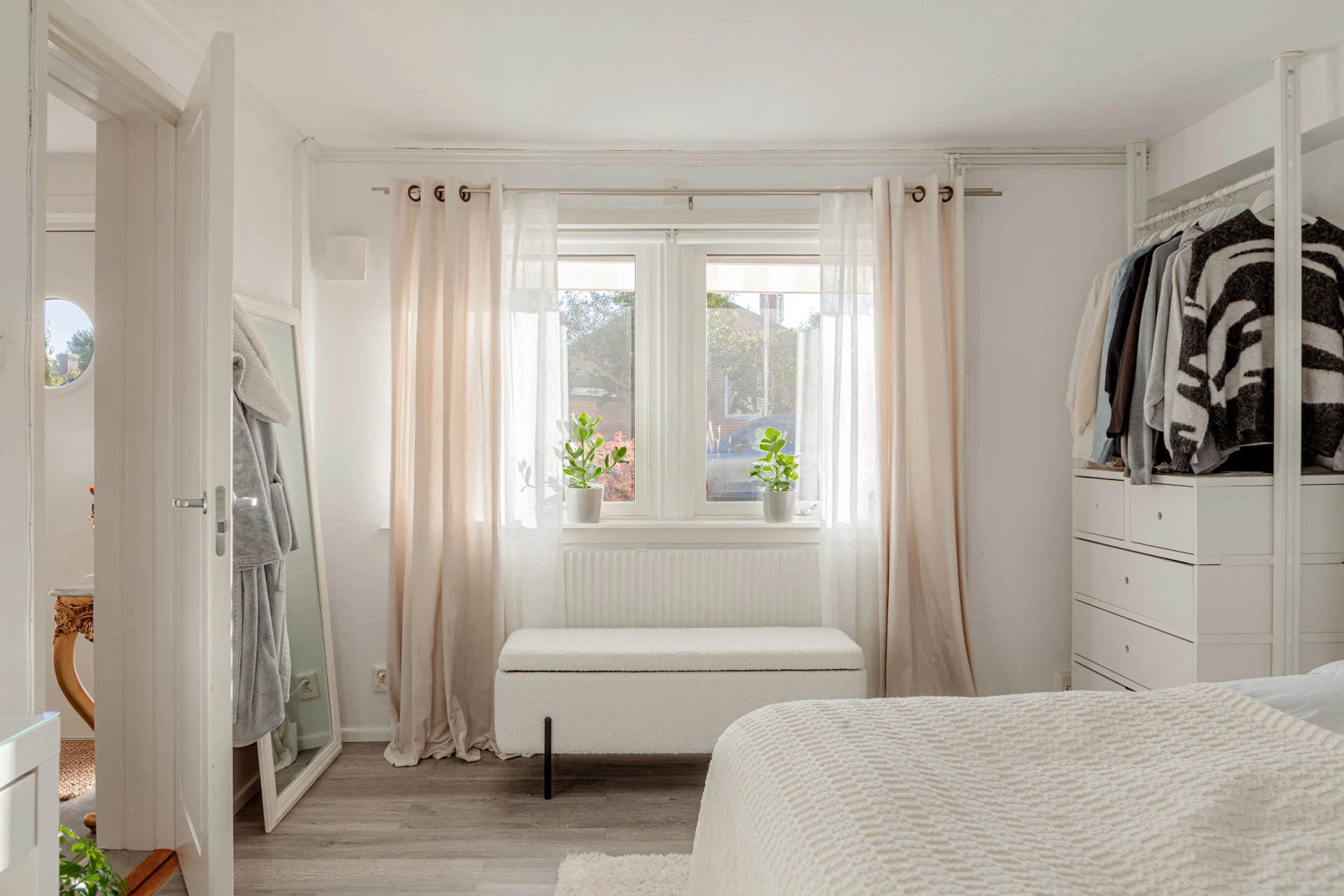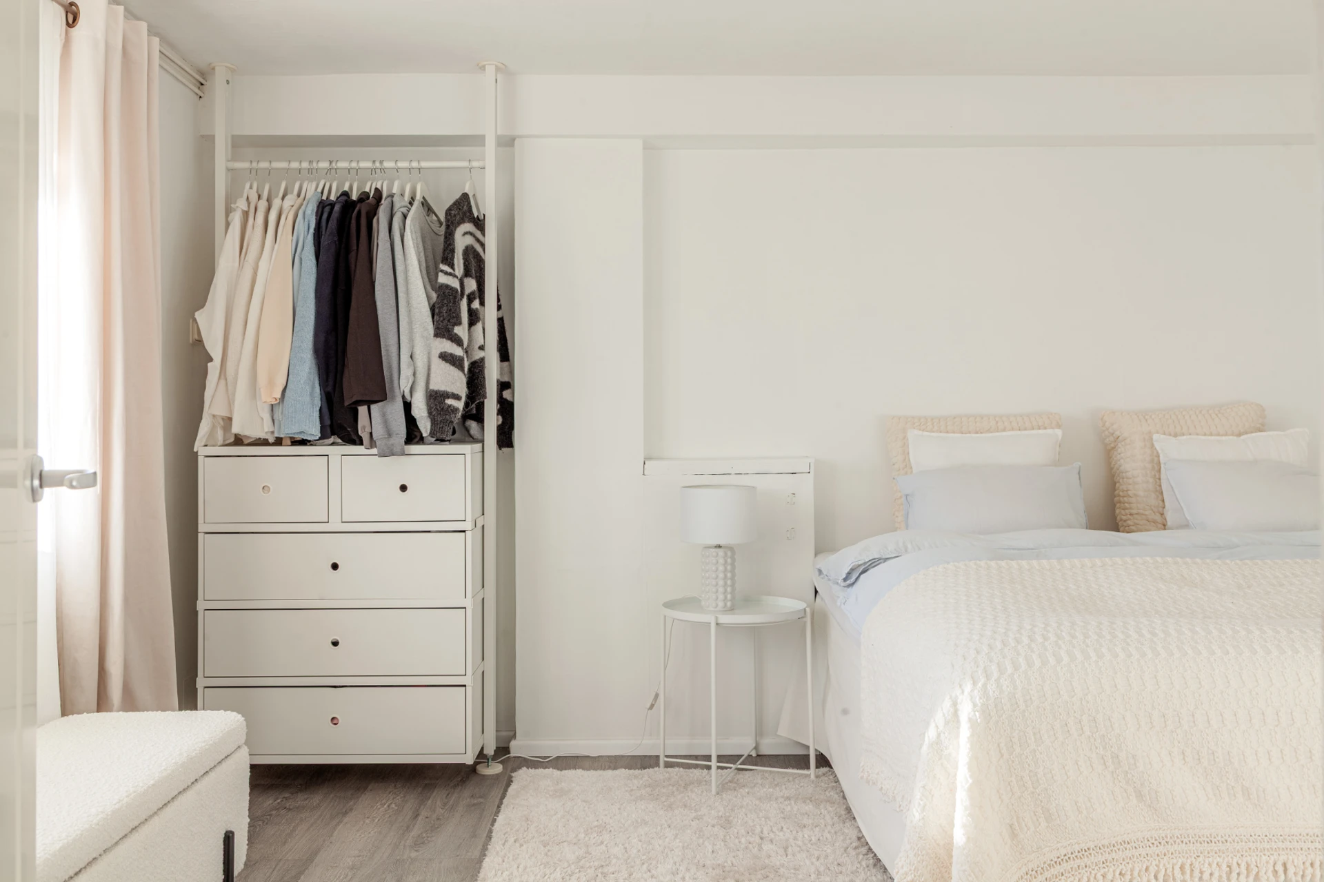 Ekparkett och vitmålade väggar. Förvaring i tre inbyggda garderober med överskåp (Ikea förvaringssystem ingår ej).