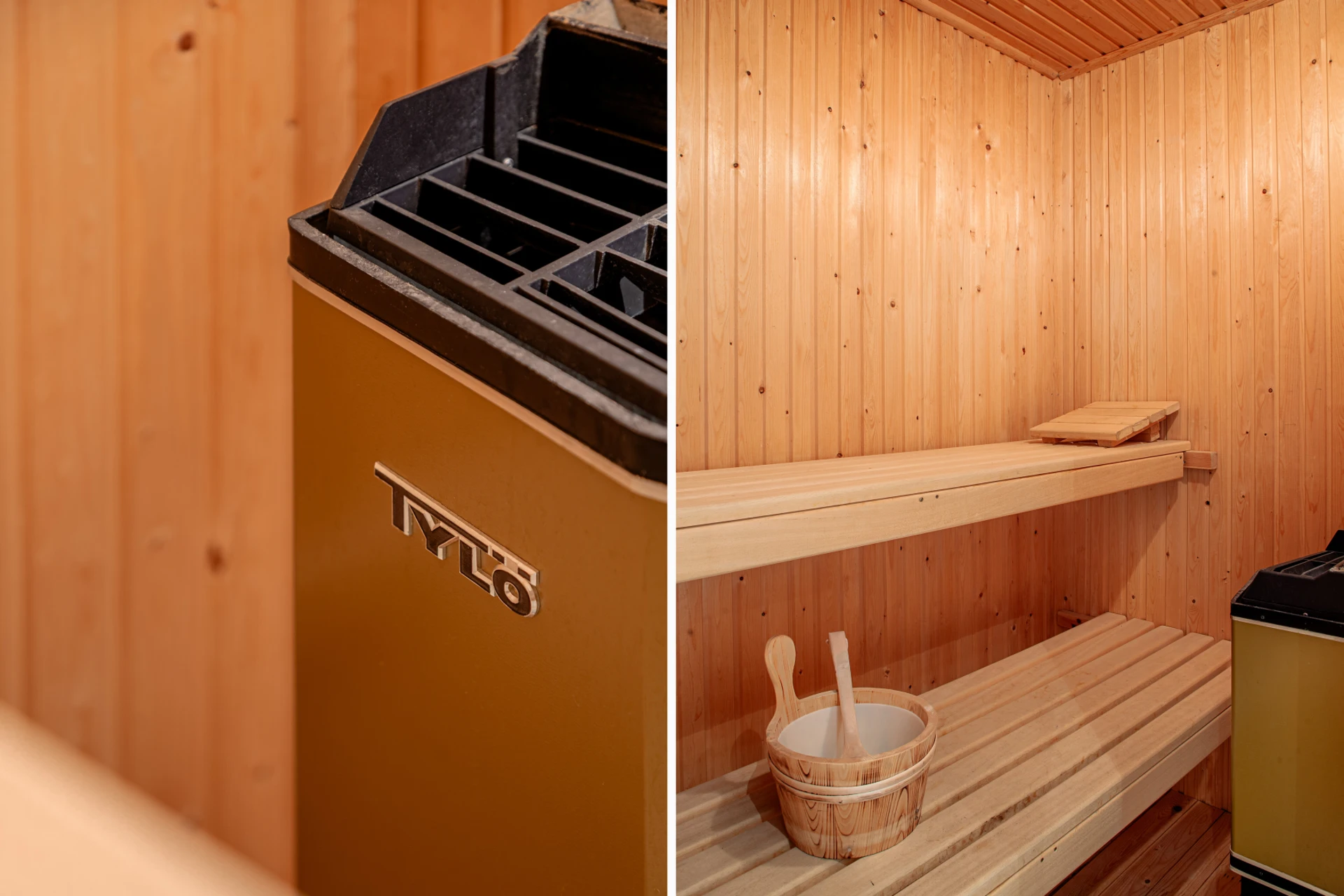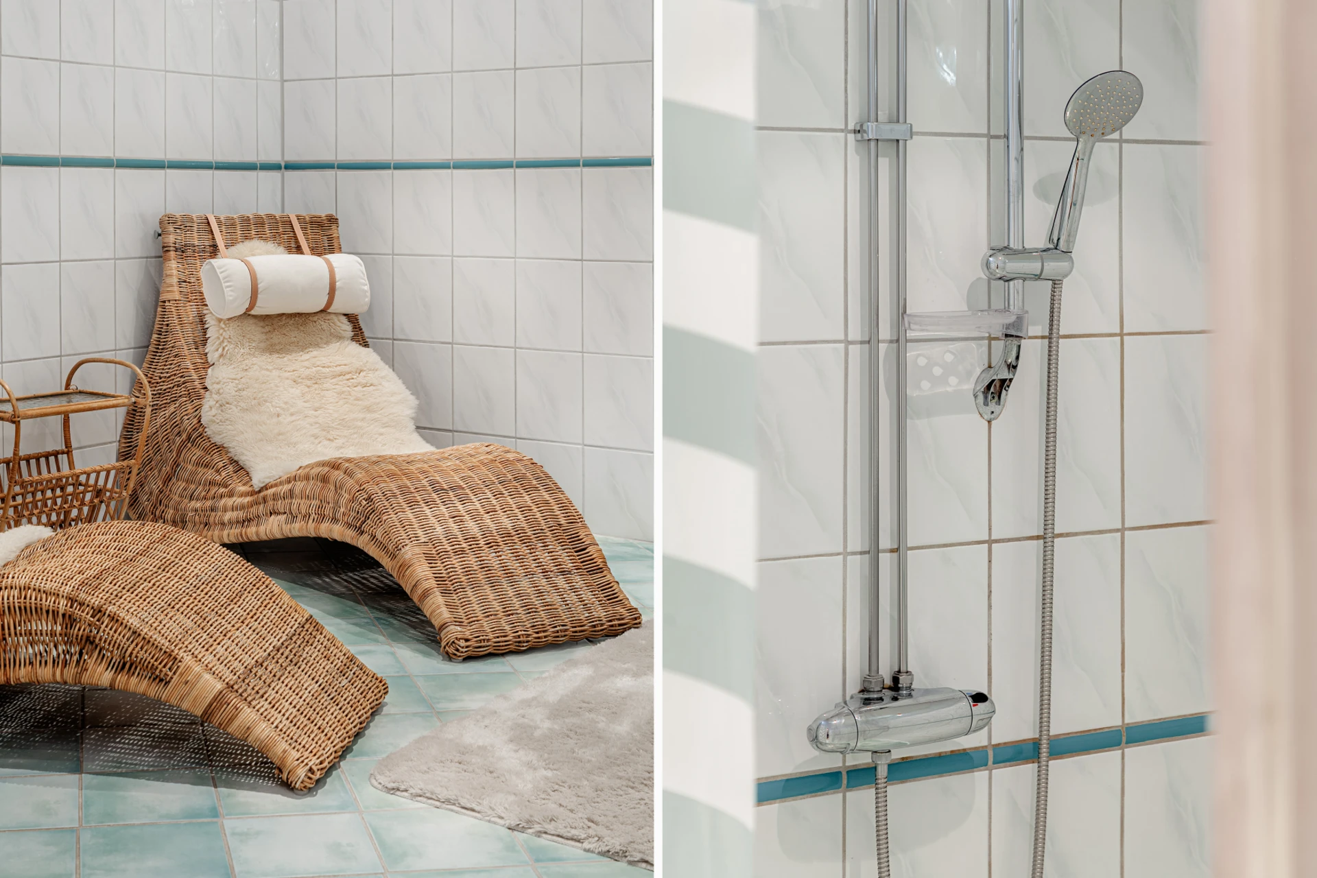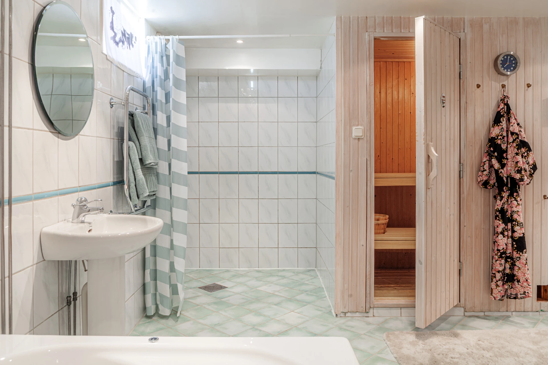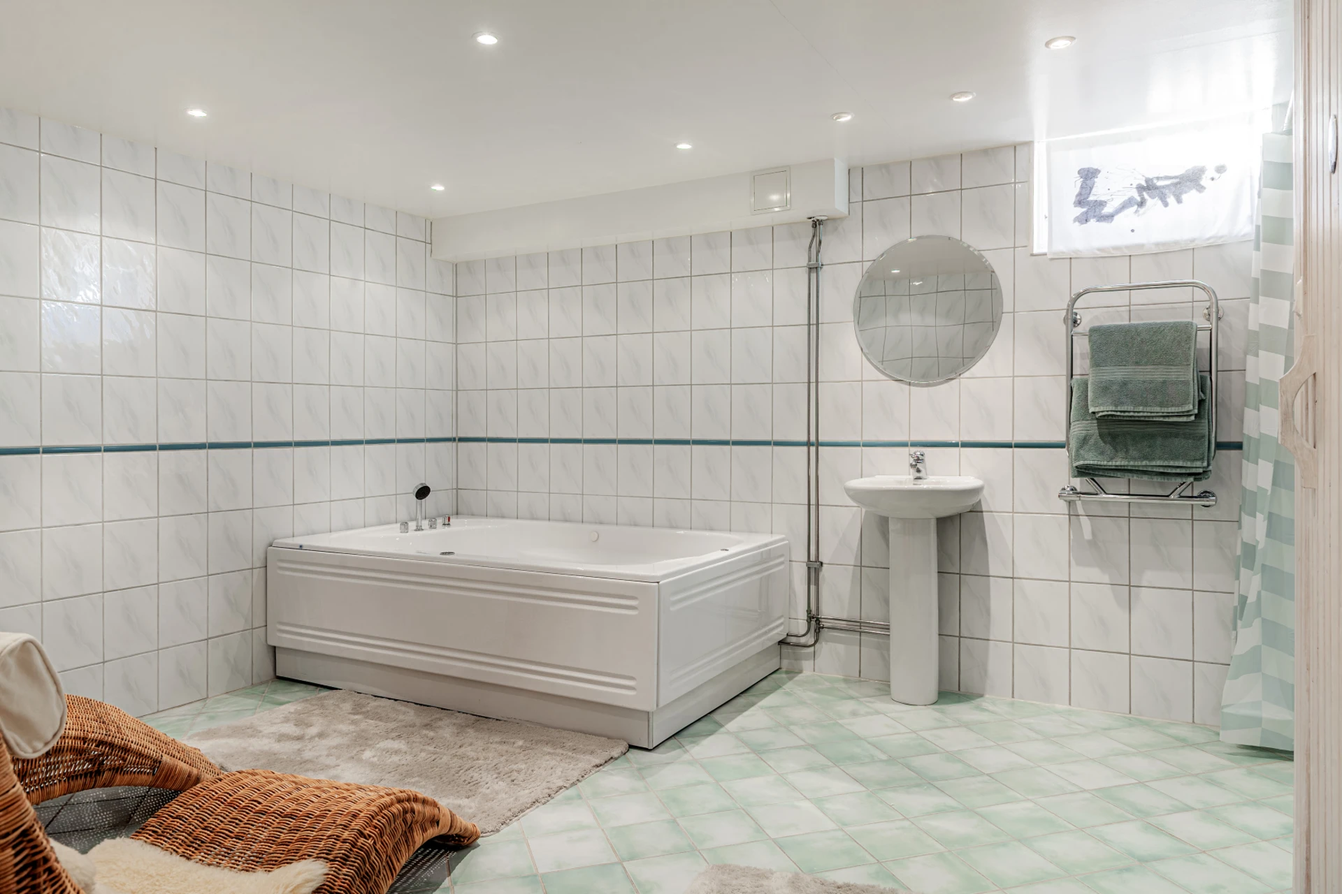 Grönblått klinkergolv med golvvärme och ljust kaklade väggar. Badrummet är utrustat med handfat, spegel, dusch, stort bubbelbadkar samt bastu.