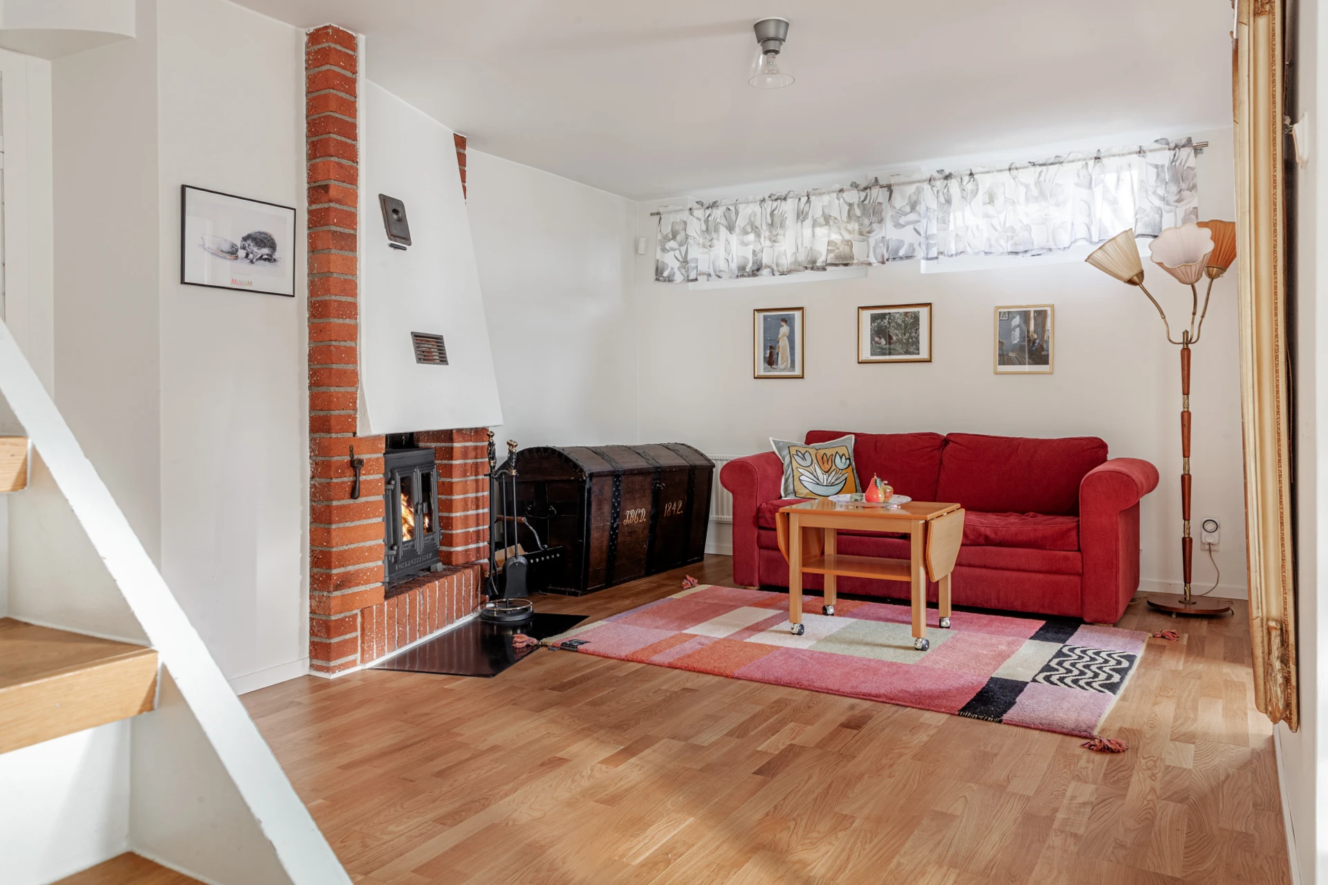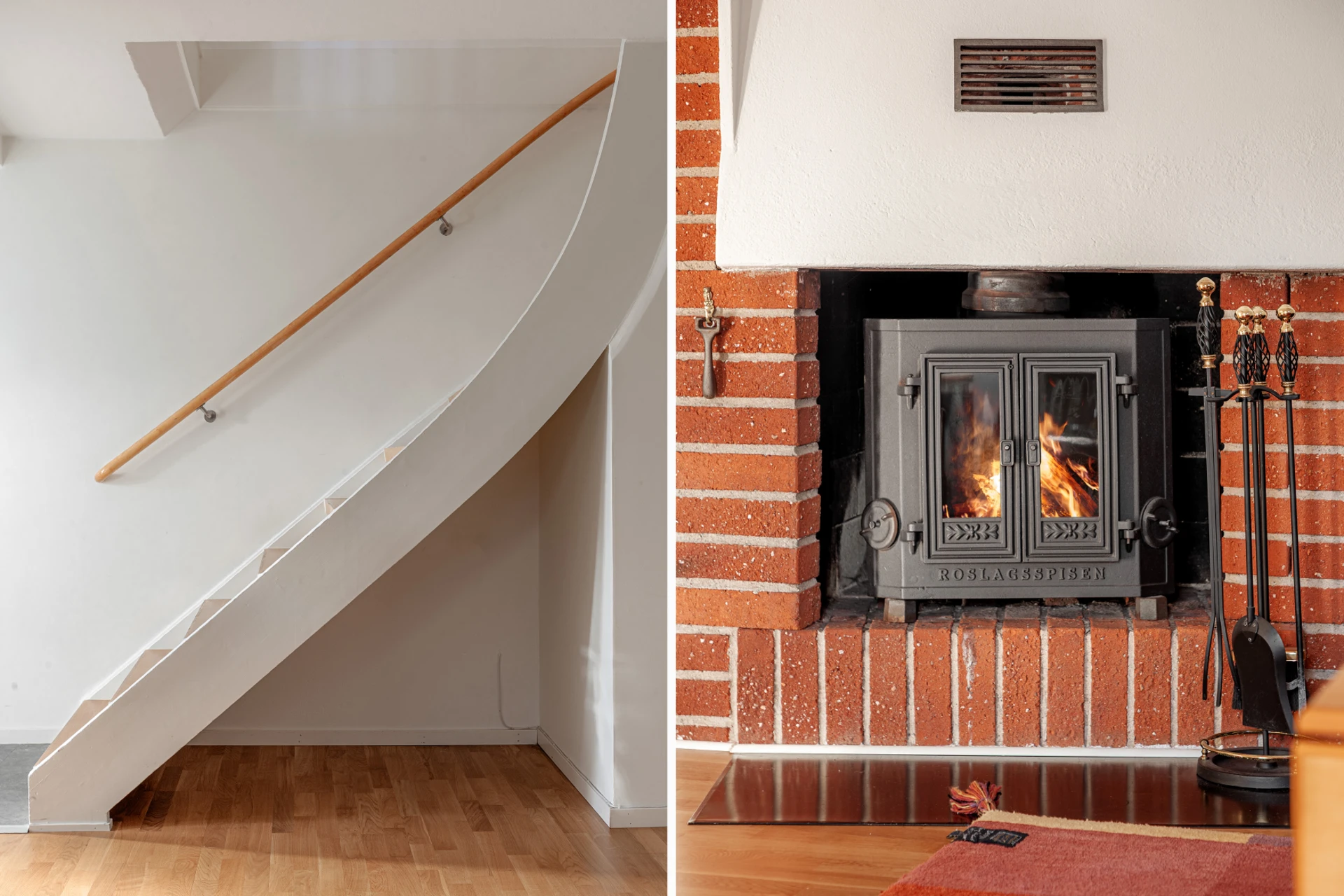 Ekparkett och vitmålade väggar. Öppen spis med insats.