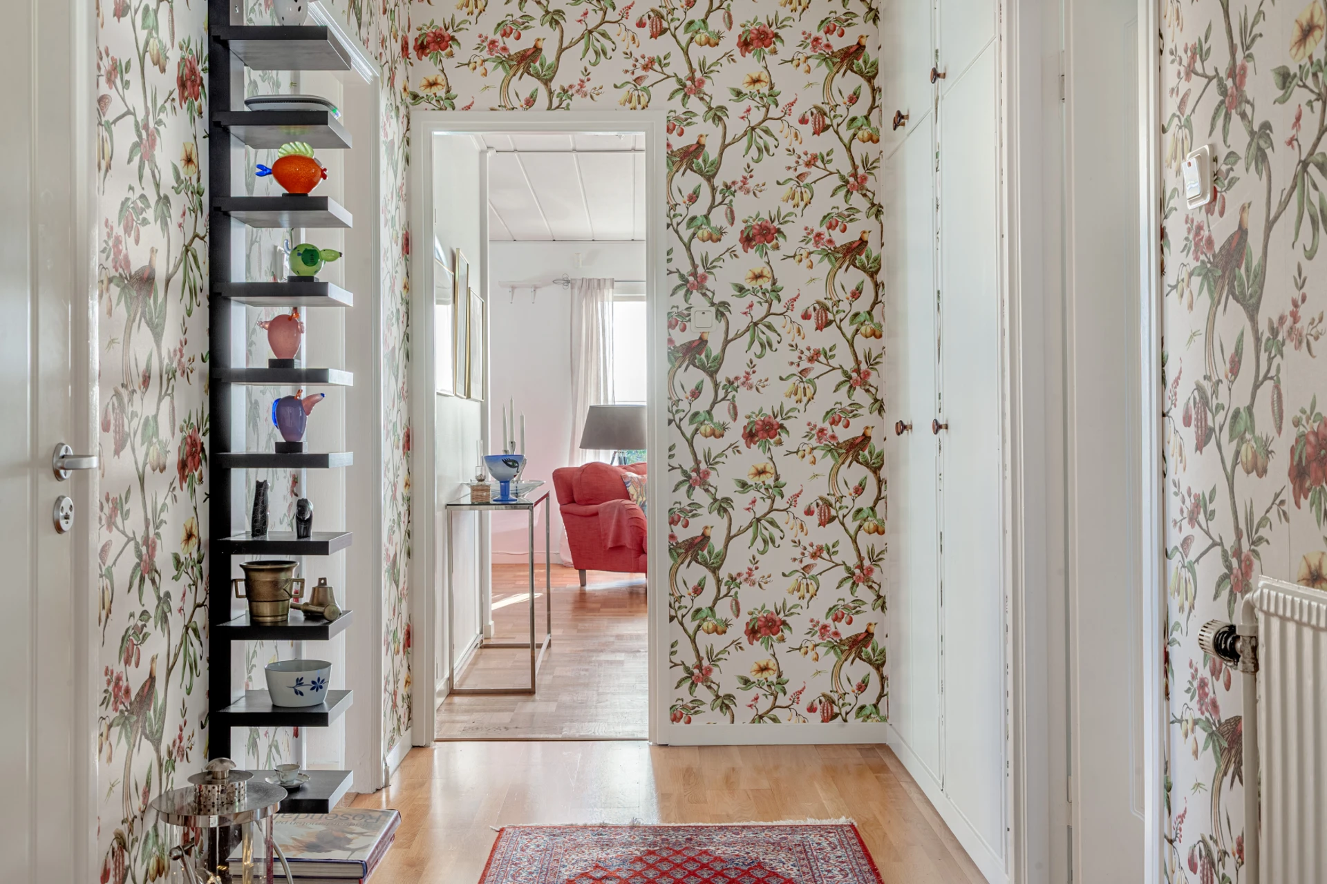 Ekparkett och tapetserade väggar. Förvaring i fyra garderober.