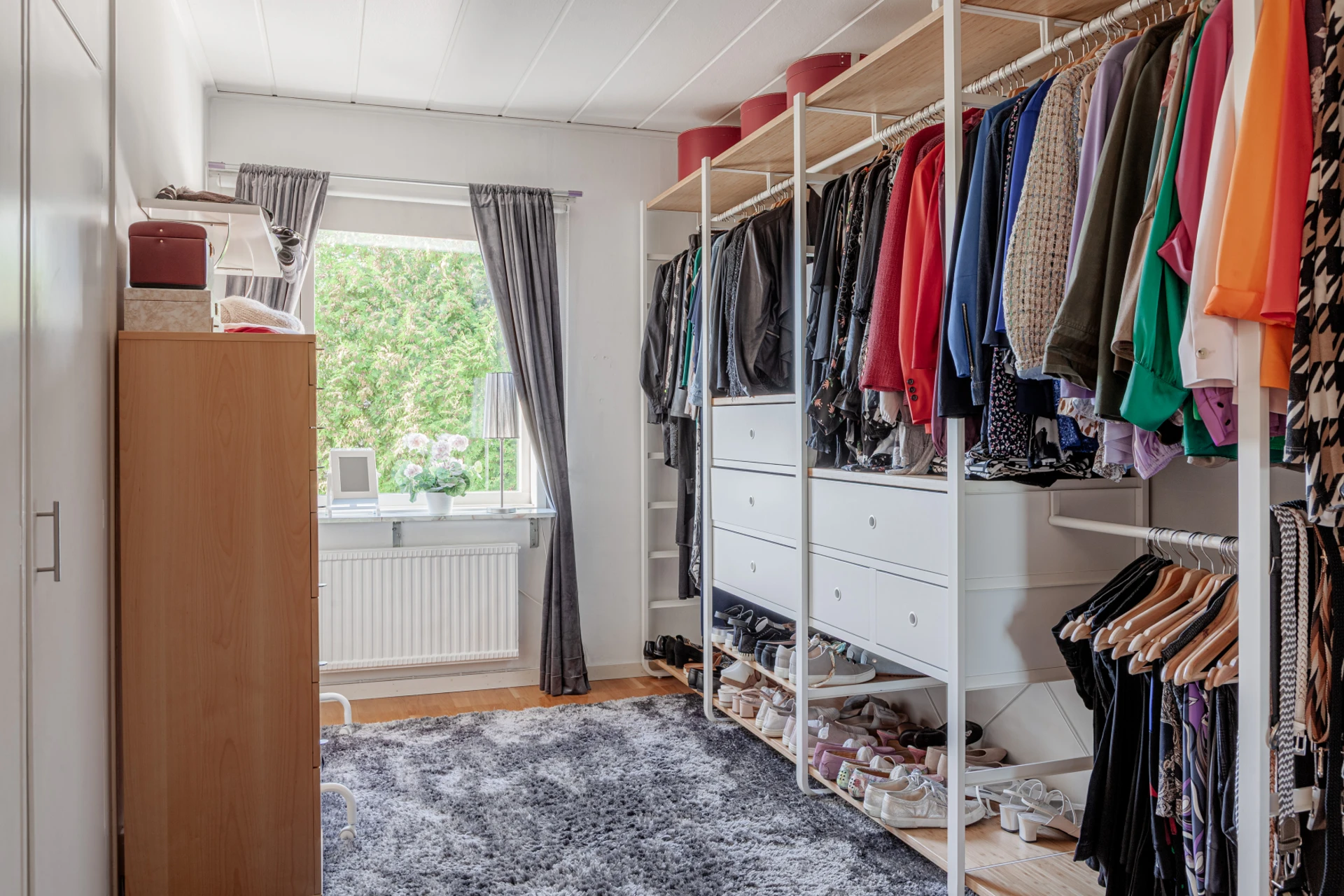 Grått laminatgolv och vitmålade väggar. Förvaring i IKEA förvaringssystem.