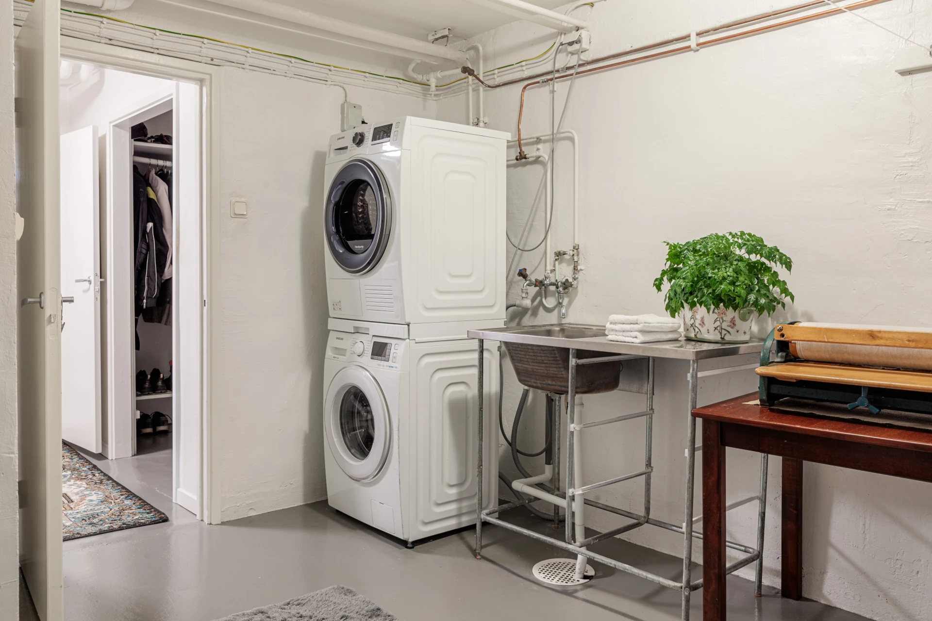 Gråmålat betonggolv och målade väggar. Den stora tvättstugan är utrustad med klädstreck, diskbänk med tvättho och tvättpelare med tvättmaskin samt torktumlare. Här finns även fjärrvärmeväxlaren.