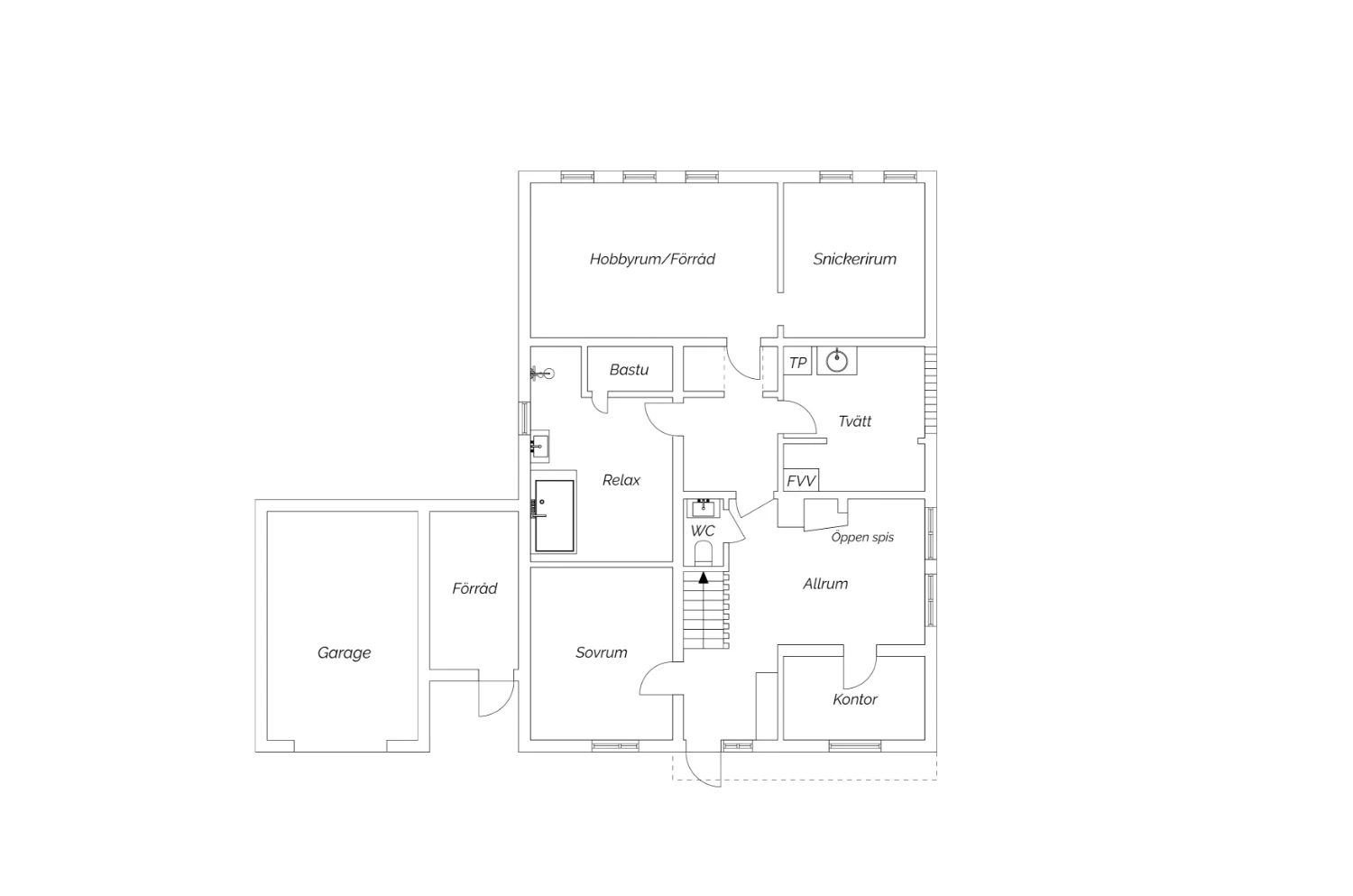 Målat betonggolv och målade väggar. Används idag som förråd, men kan användas som hobbyrum, för familjeaktiviteter eller t.ex till ett hemmagym. Förrådet har tre källarfönster.