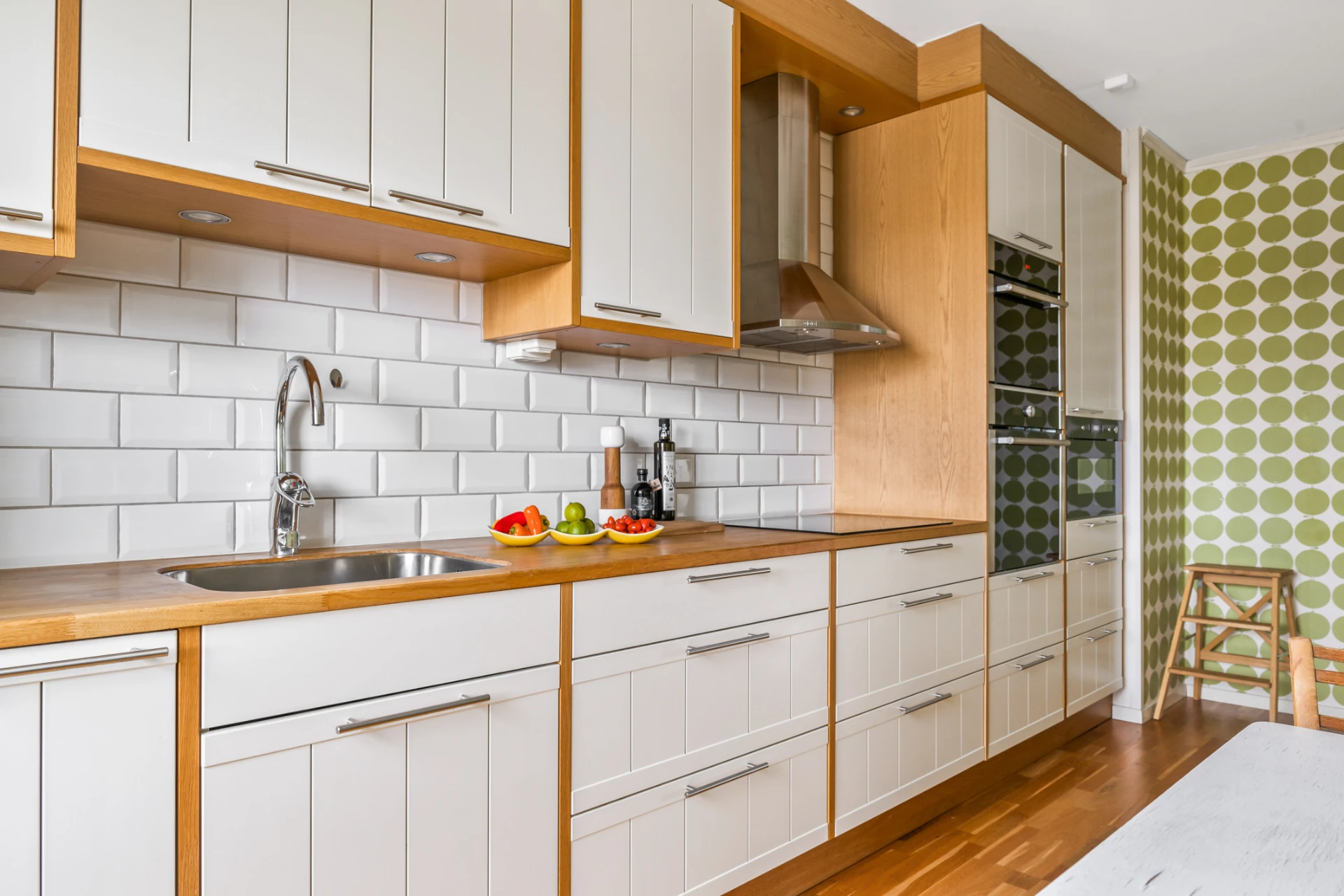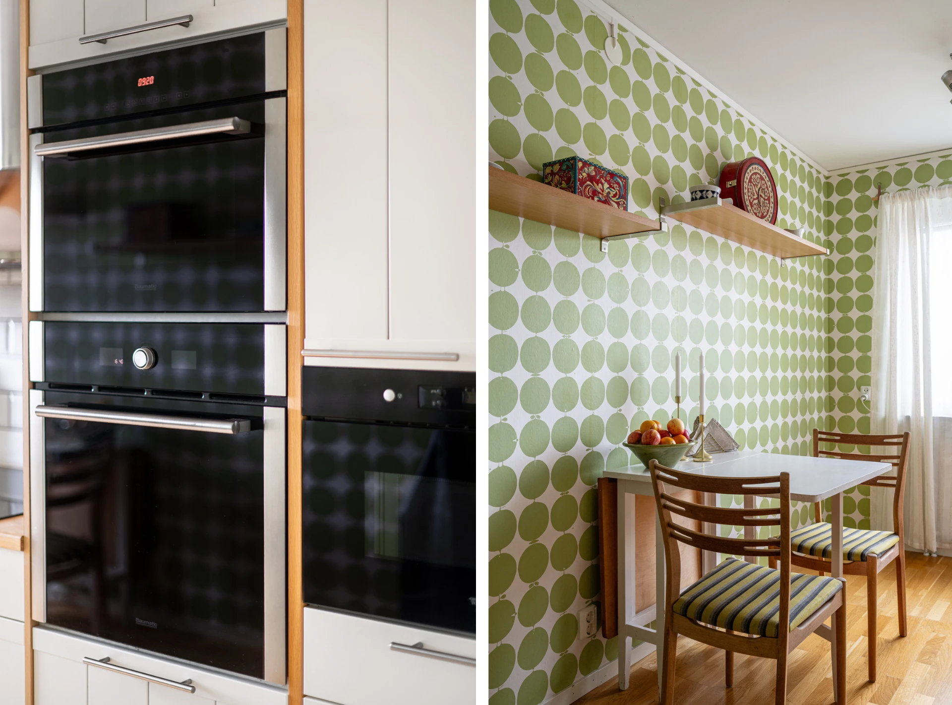 Kök med bänkskiva i trä, gott om förvaring i över- och underskåp bakom träluckor. Köket är utrustat med diskmaskin, kyl och frys samt två ugnar, spis och inbyggd mikrovågsugn.