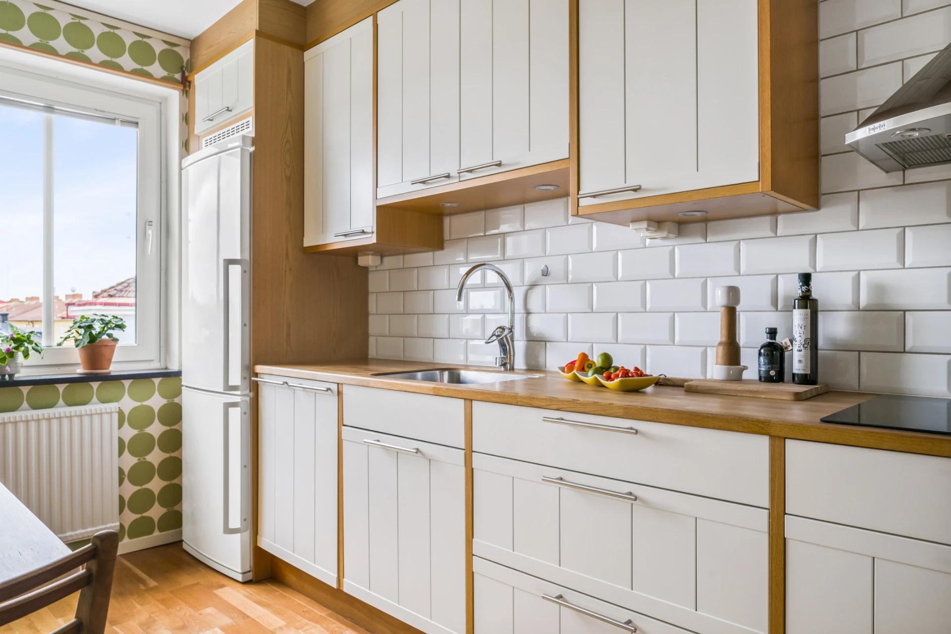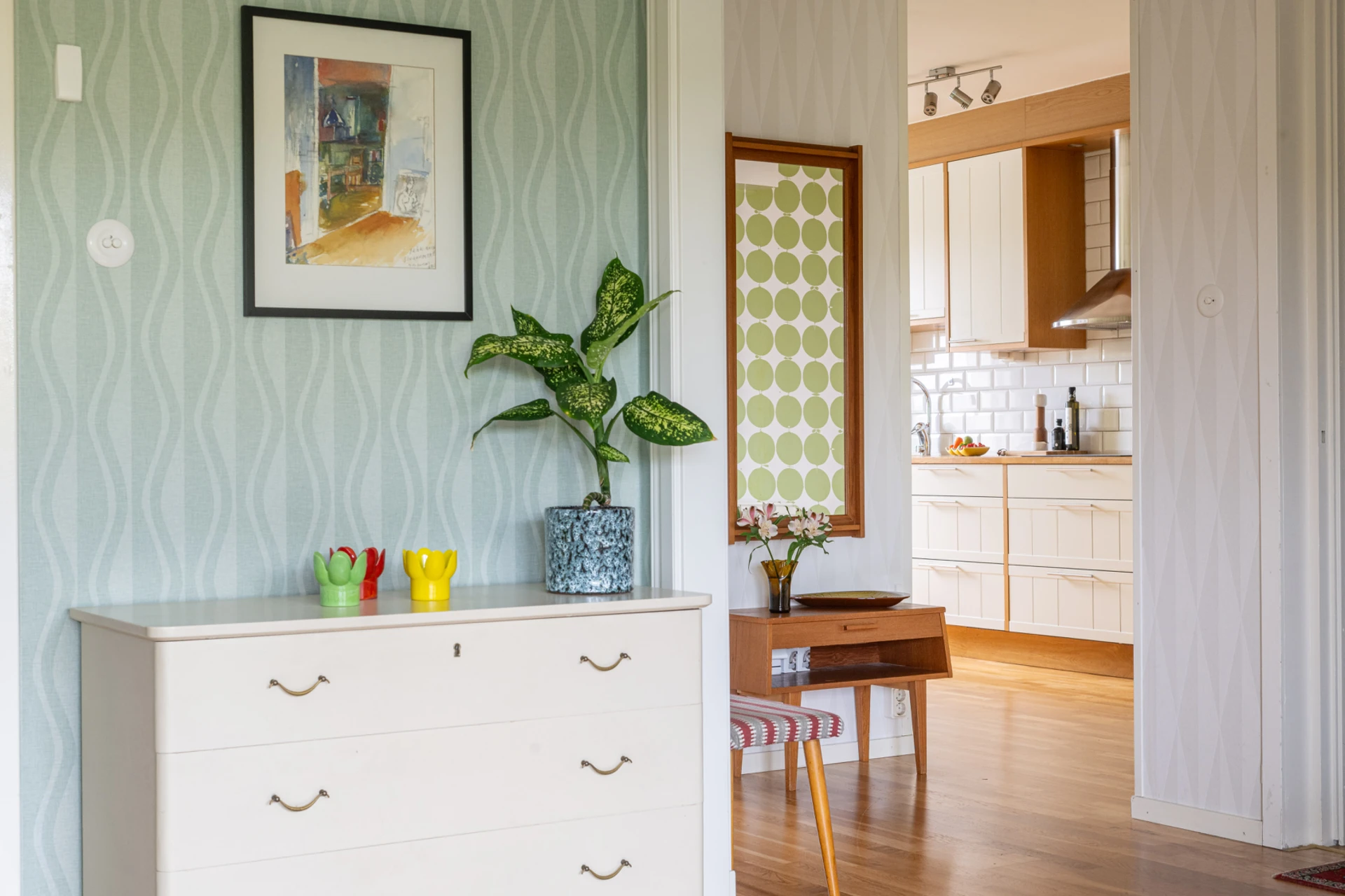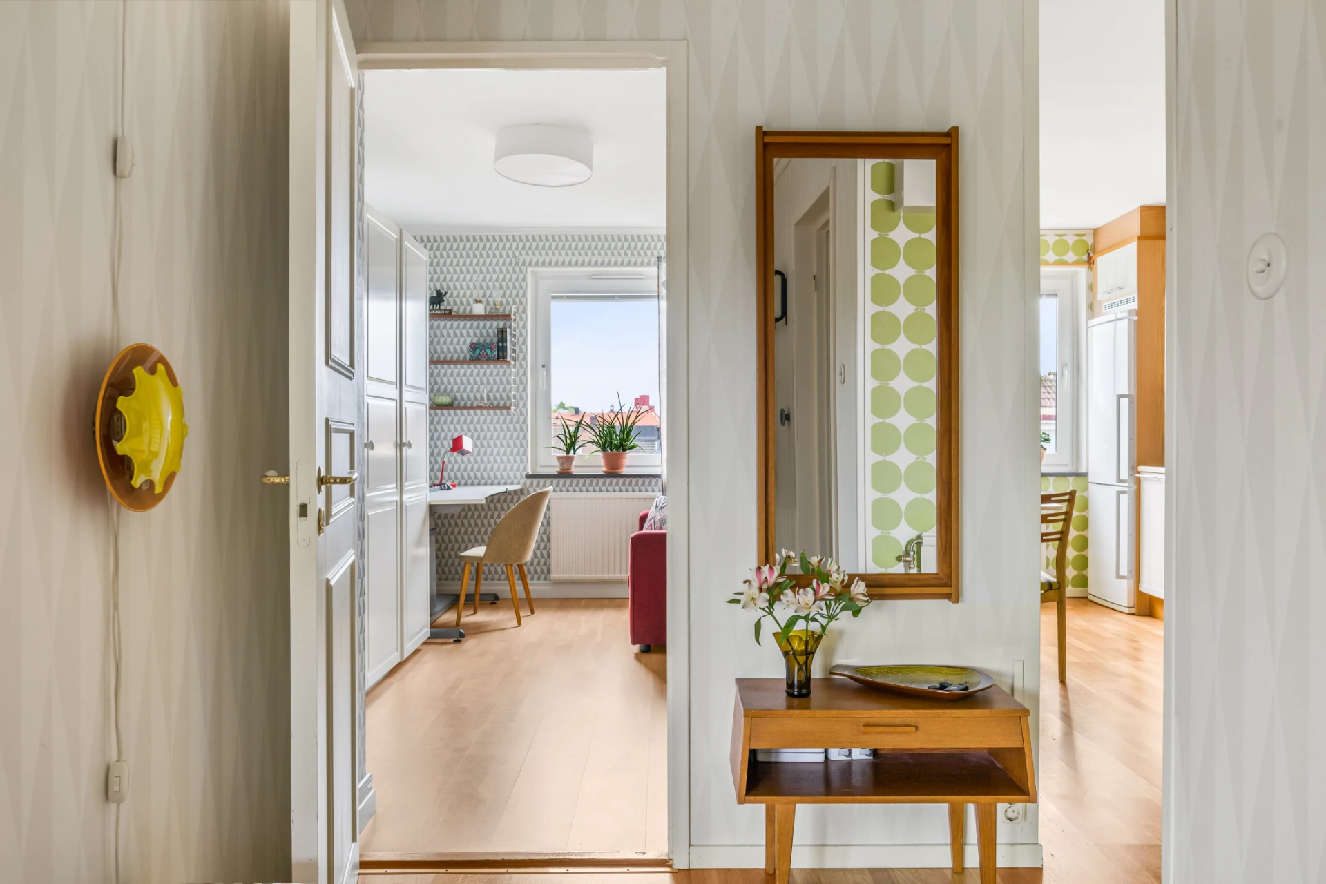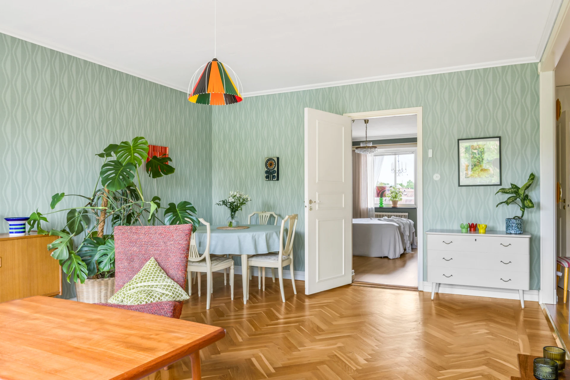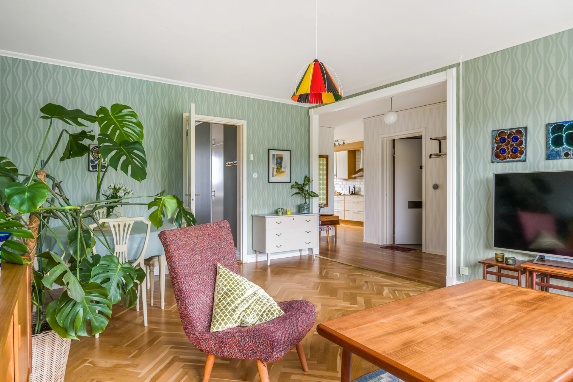 Lägenheten bjuder på en smart planlösning med gott om förvaringsmöjligheter, parkettgolv och vackra retrodetaljer som ger bostaden en personlig och tidlös charm. Från det generösa vardagsrummet har du härlig utsikt och glimt av vattentornet.