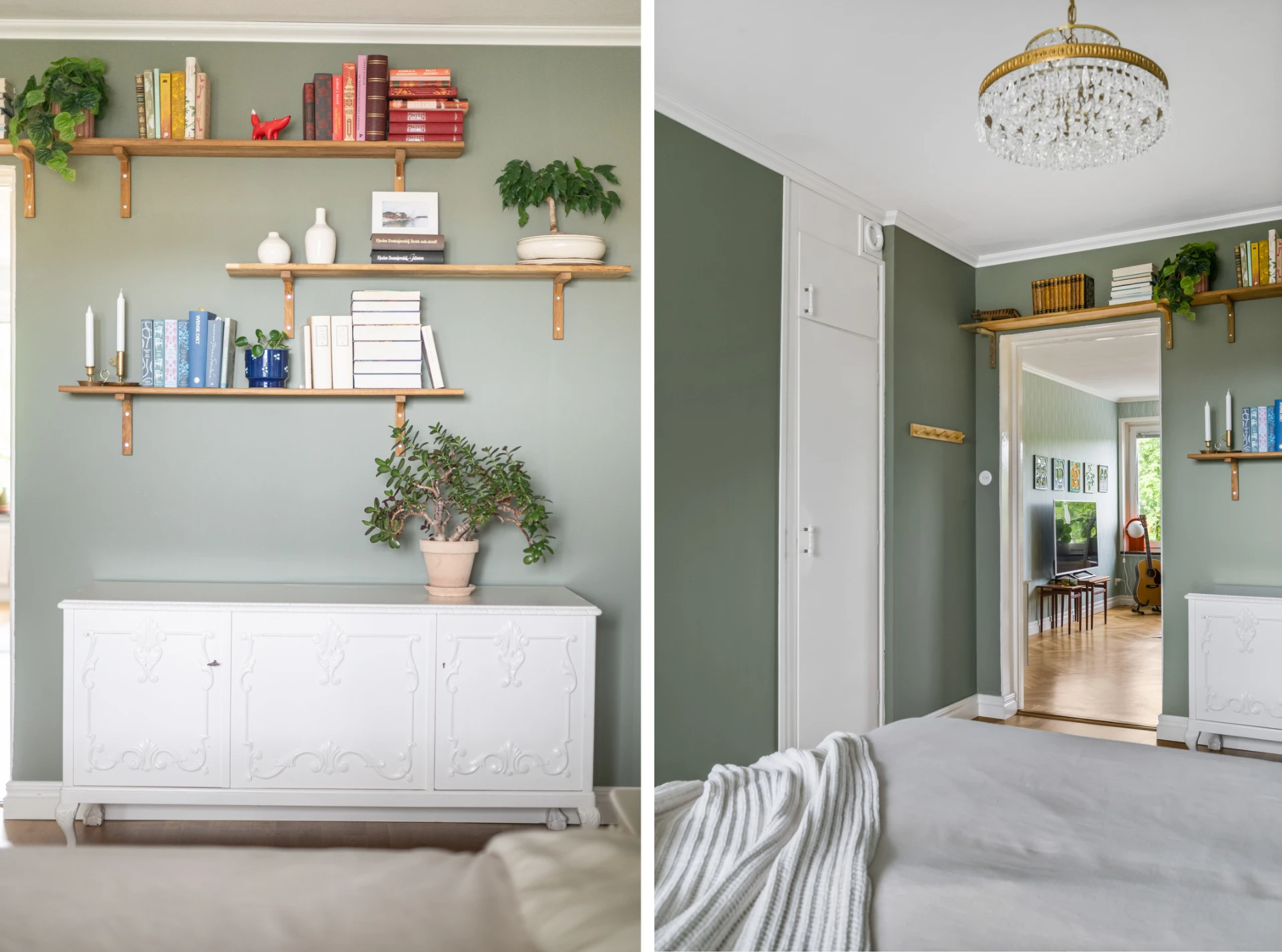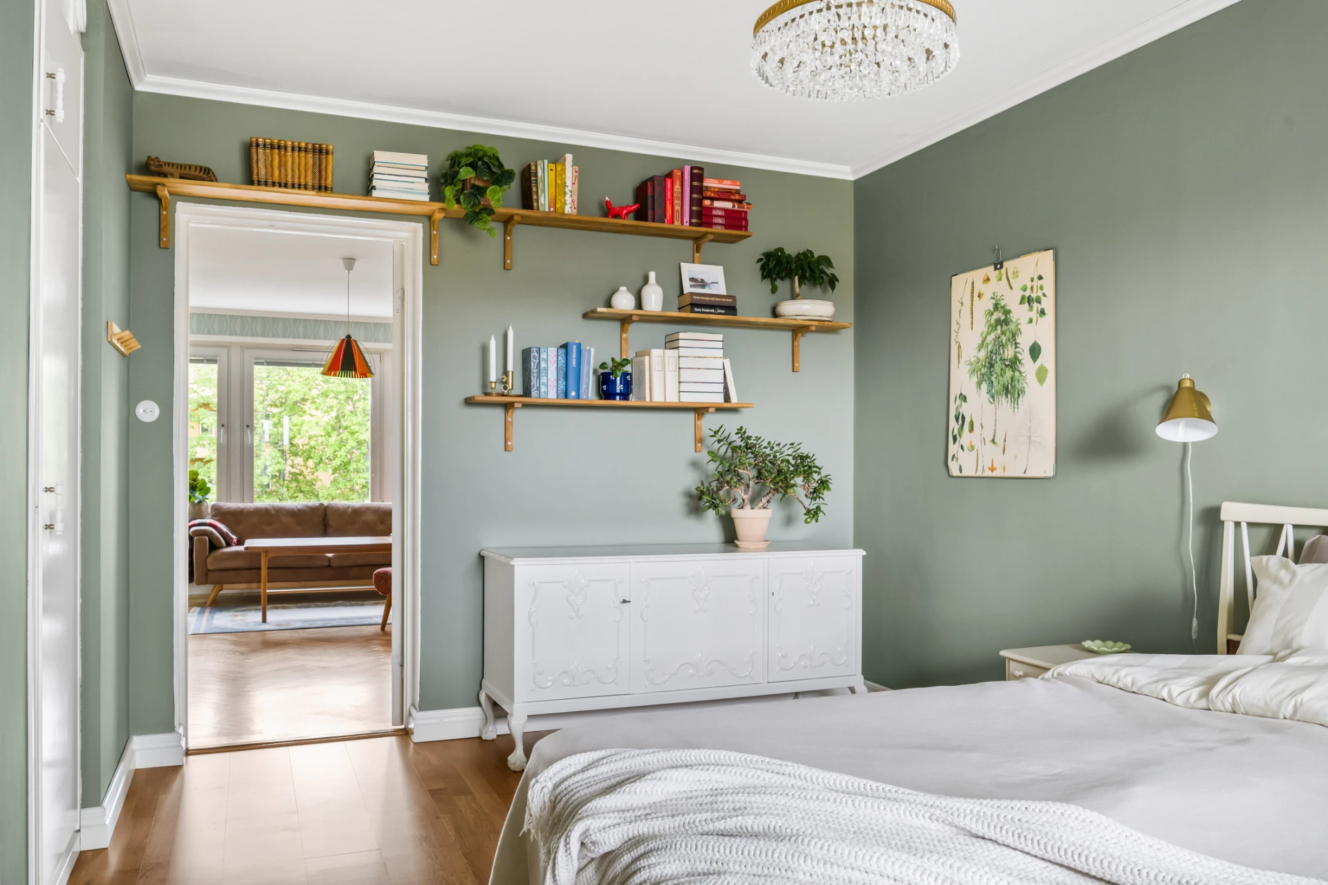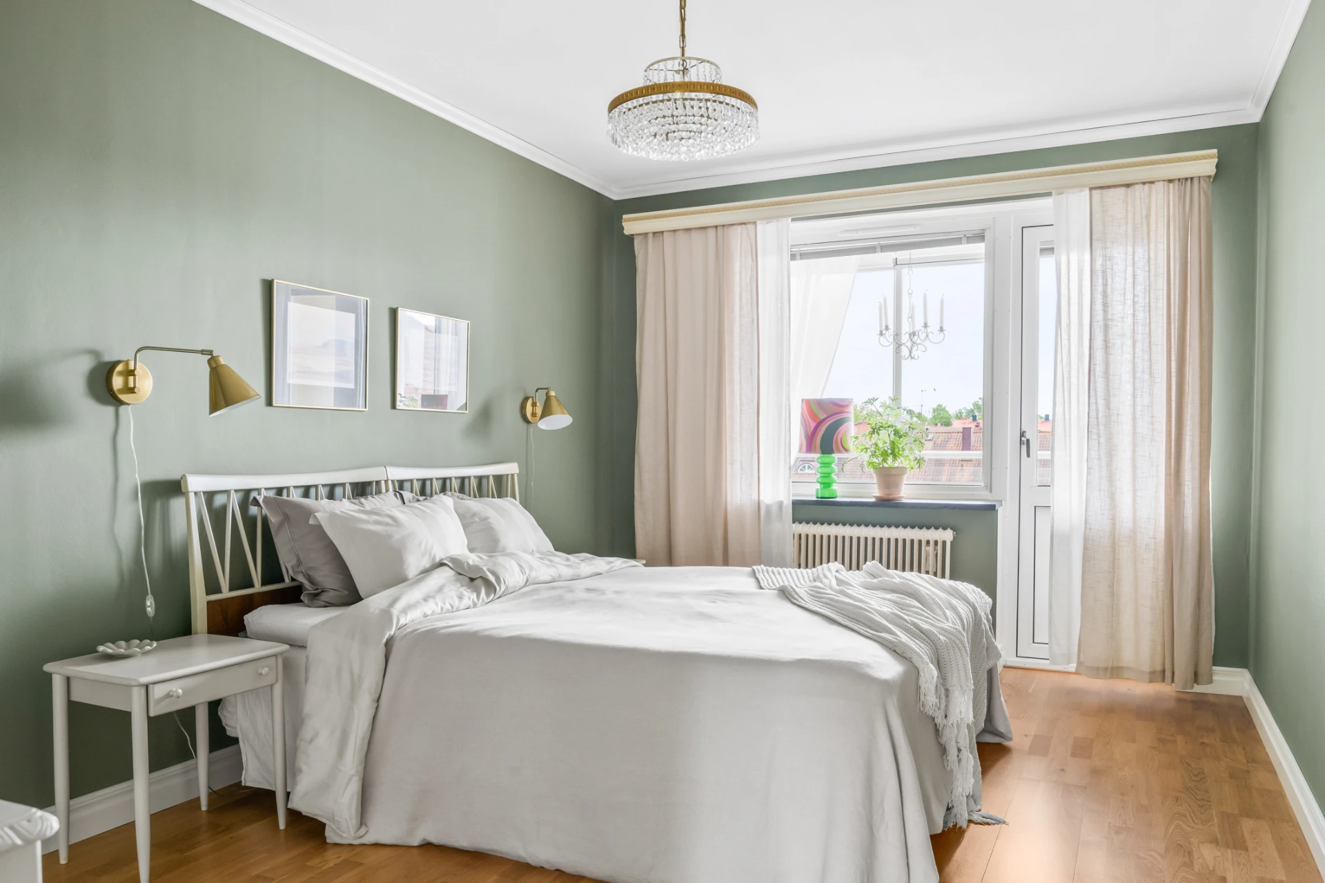 Ett större sovrum med målade väggar och parkettgolv. Här ifrån når du den inglasade balkongen mot innergård.