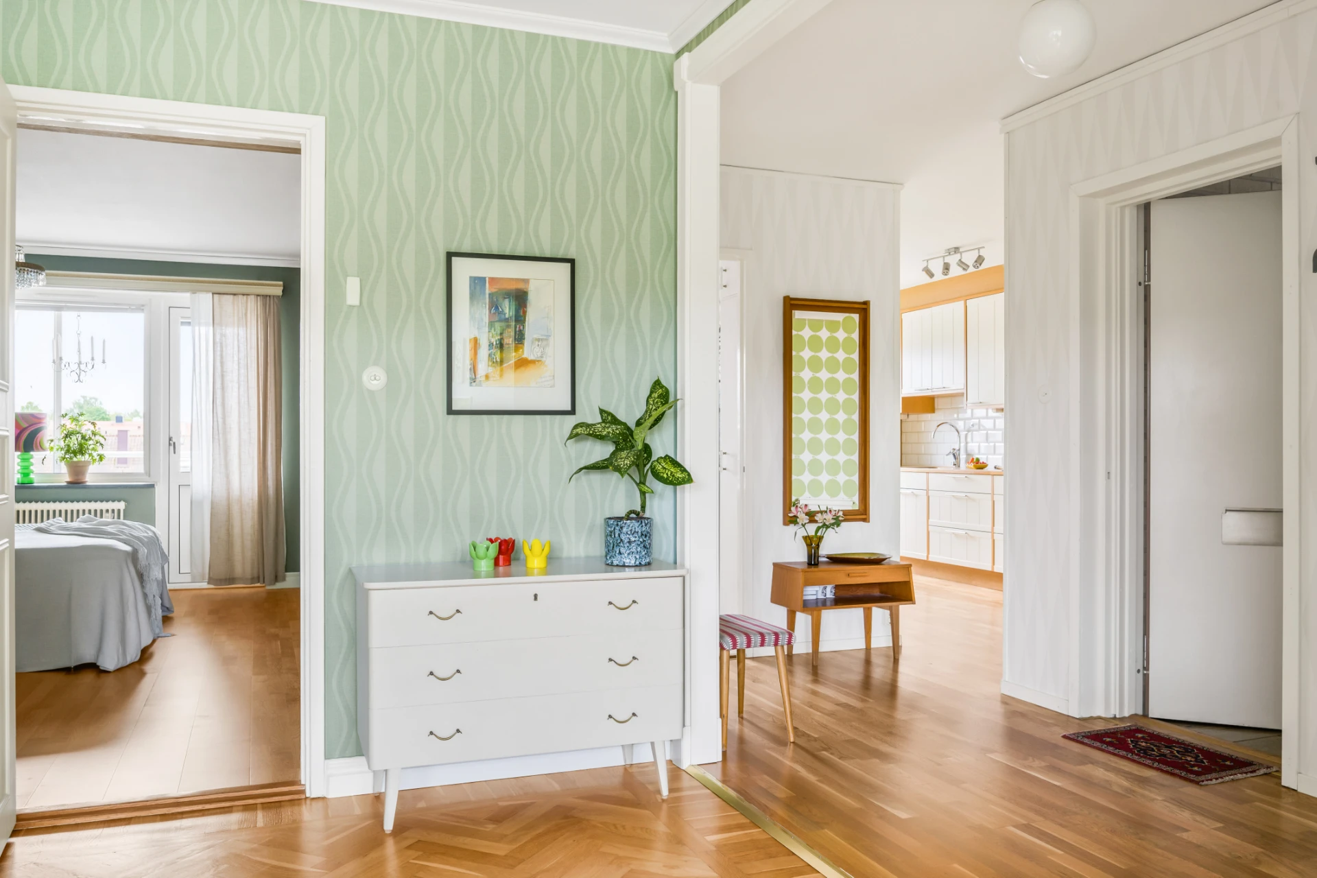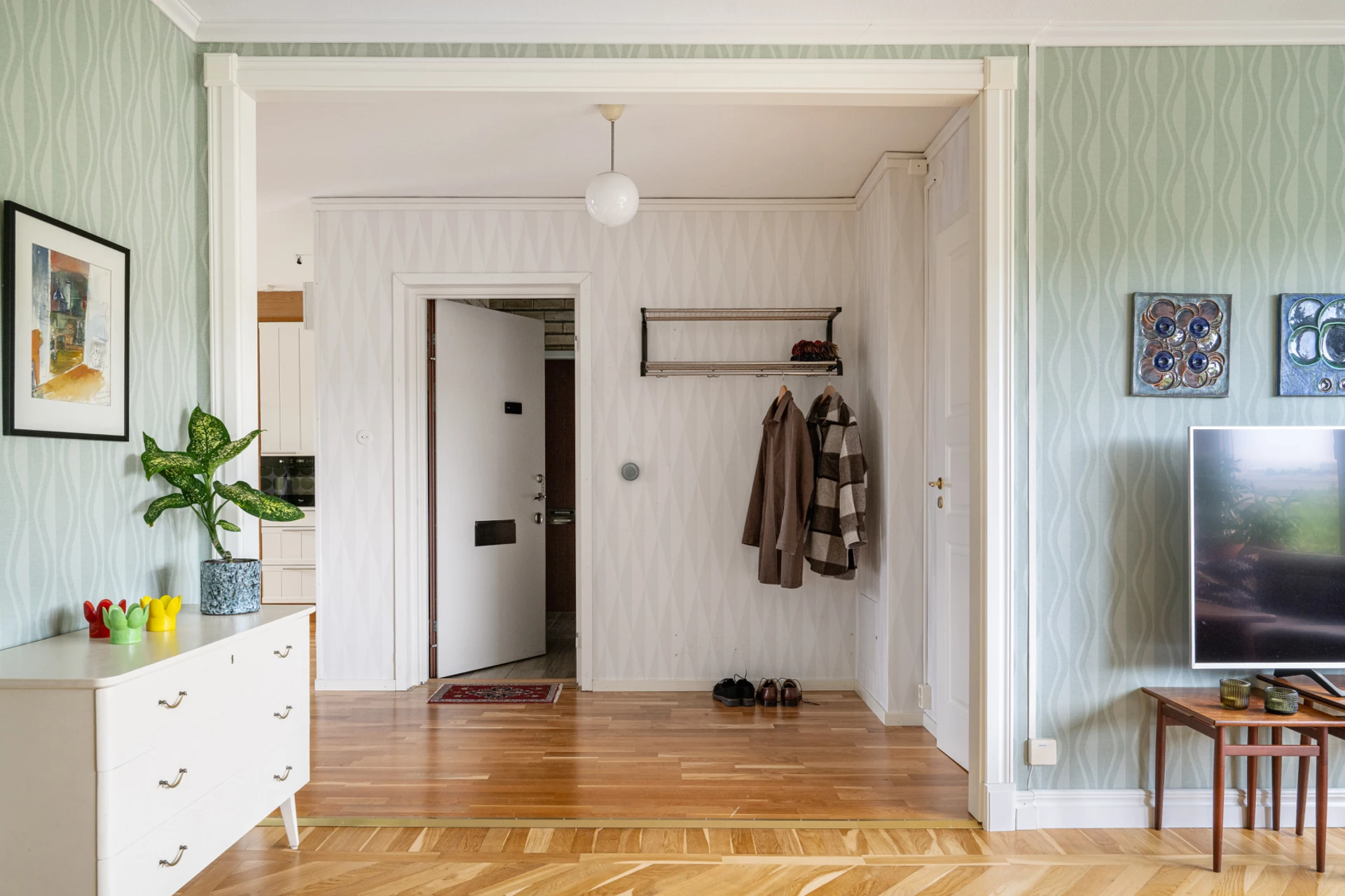 Inbjudande hall med parkettgolv och tapetserade väggar. Möjlighet att hänga ytterkläder på hatthylla.