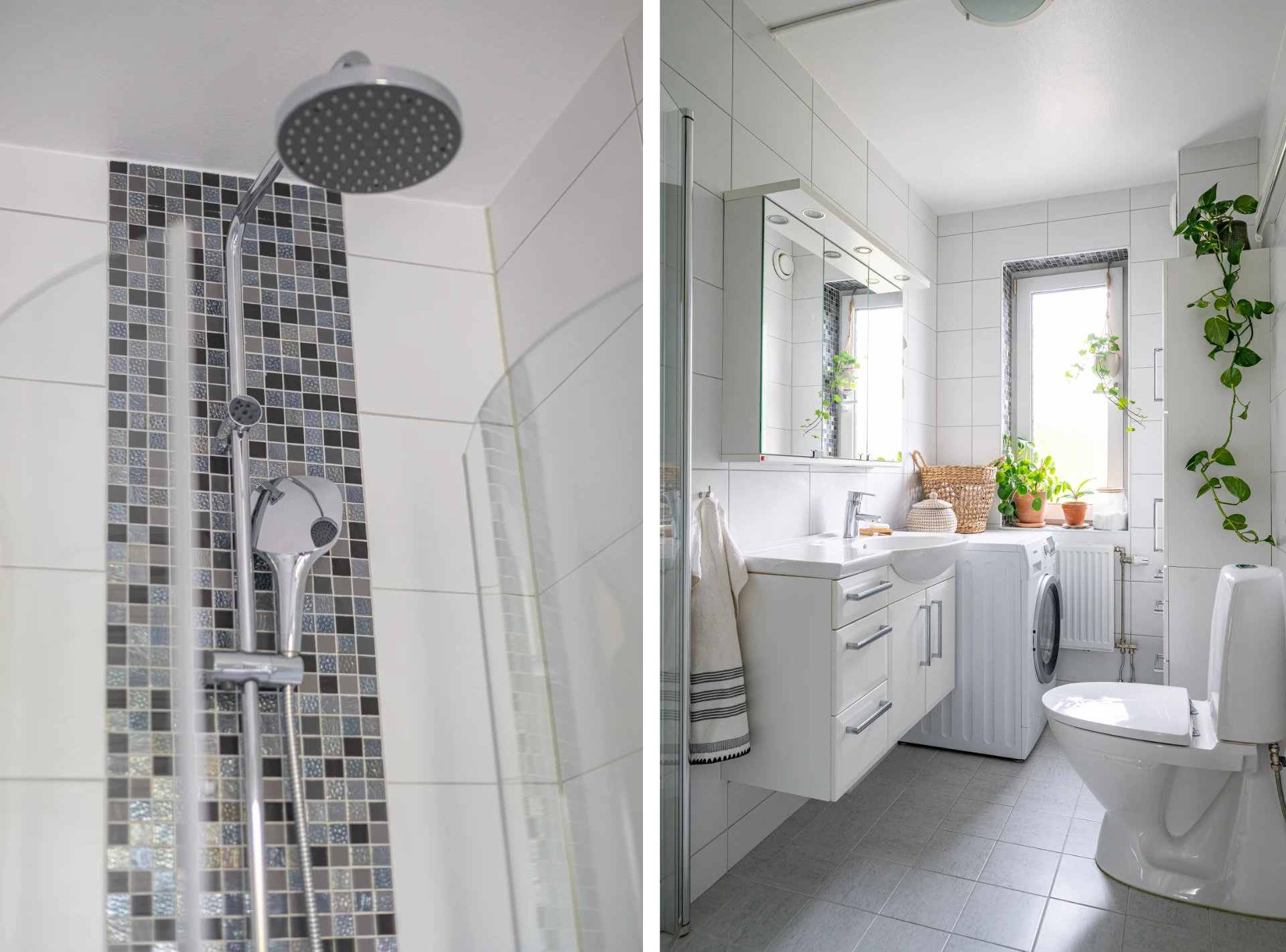 Tvättmaskin, kaklat golv och väggar. Wc, handfat med kommod och spegel med förvaring och belysning. Det finns även golvvärme i badrummet samt elektrisk handdukstork.