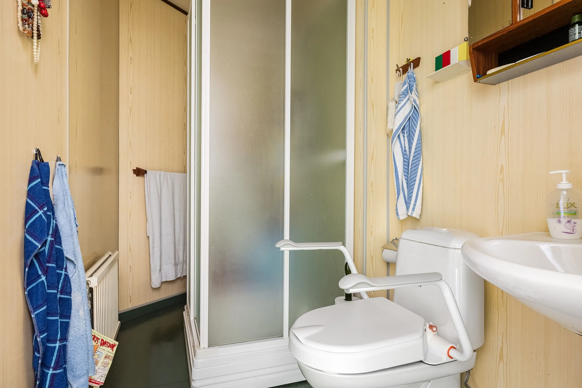 Badrum med duschkabin, toalett, tvättställ och spegelskåp.
