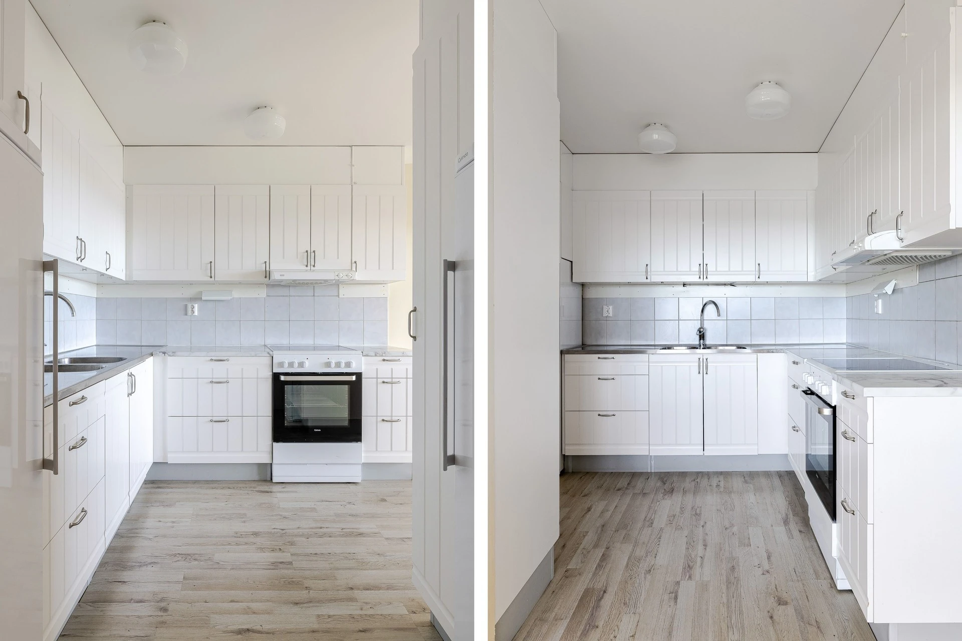 Funktionellt kök med gott om arbetsytor och förvaring.