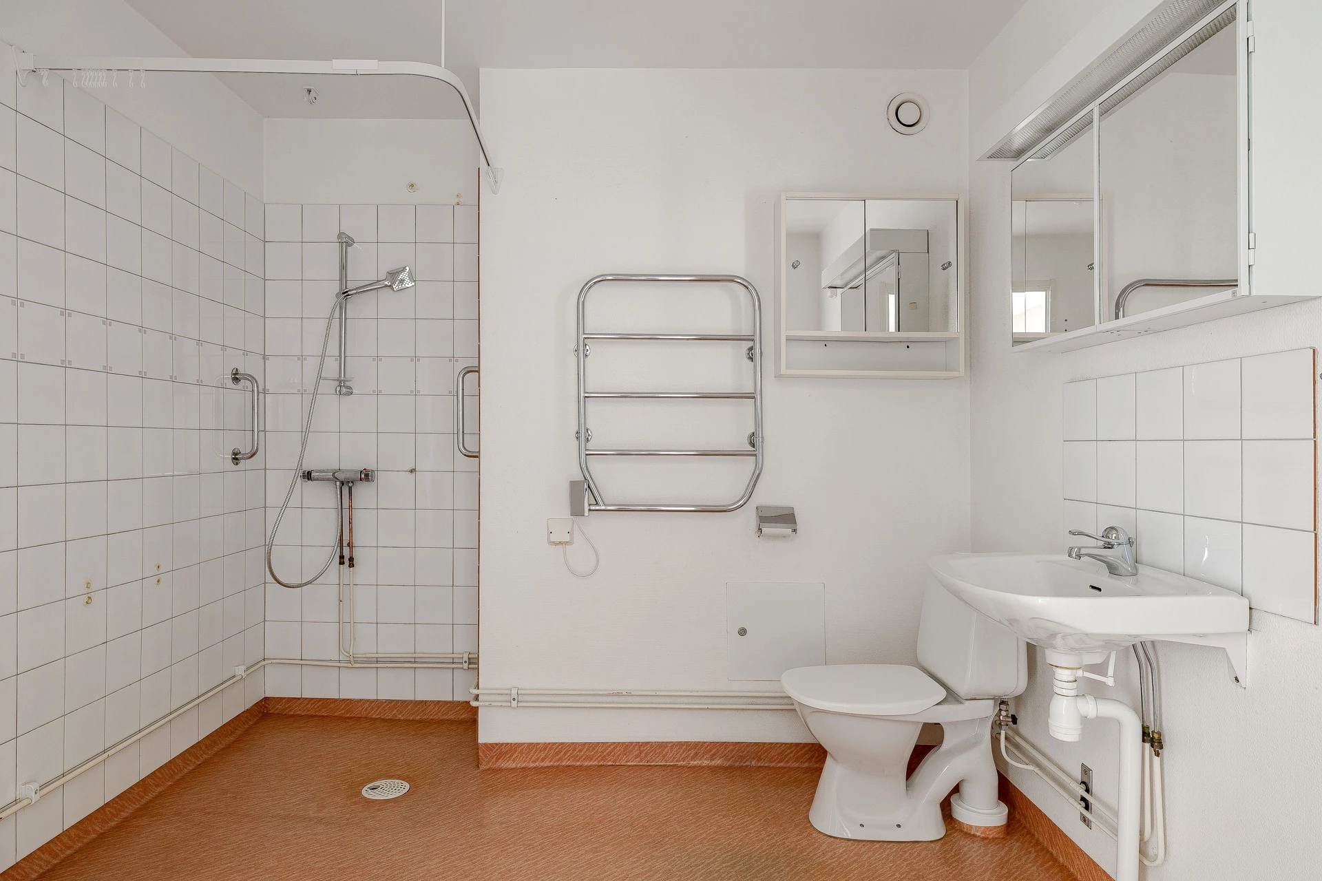 Badrum utrustat med spegelskåp, tvättställ, toalett, dusch.