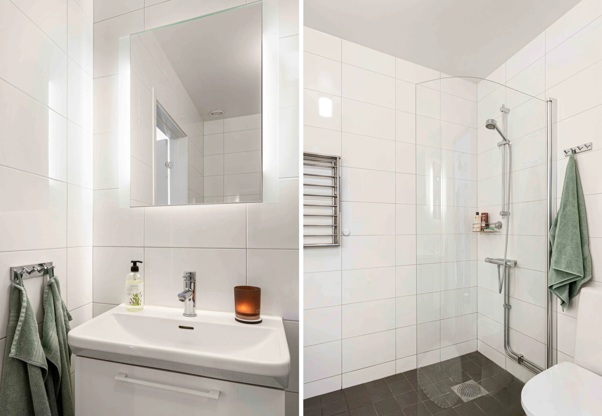 Det generöst tilltagna badrummet är utrustat med alla nödvändiga bekvämligheter, inklusive wc, dusch med glasvägg, tvättställ med kommod och spegelskåp med belysning. Dessutom finns en kombinerad tvättmaskin och torktumlare med bänkskiva ovanpå samt väggskåp för extra förvaring. Vita kaklade väggar samt mörktgrått klinker på golv.
