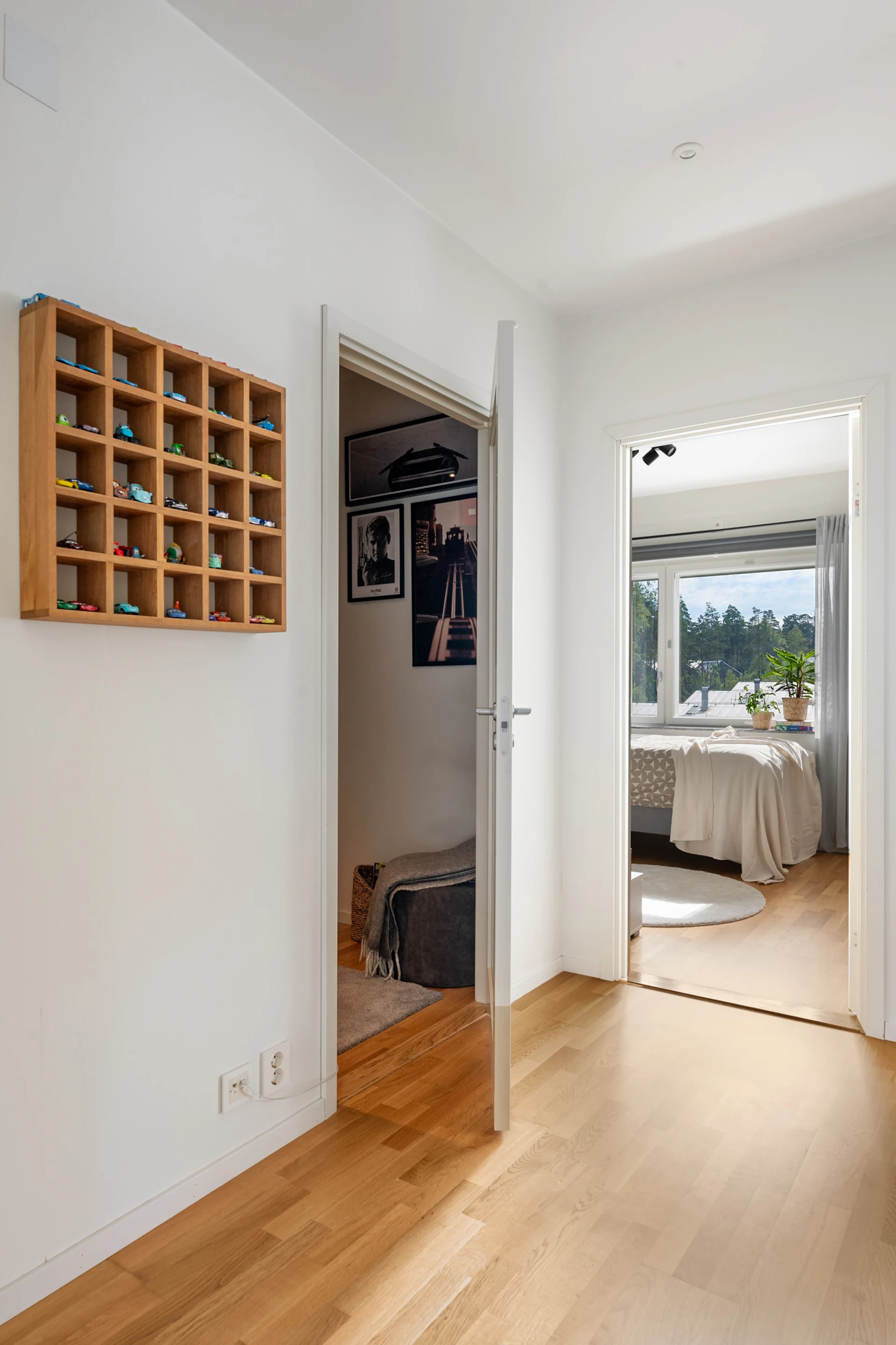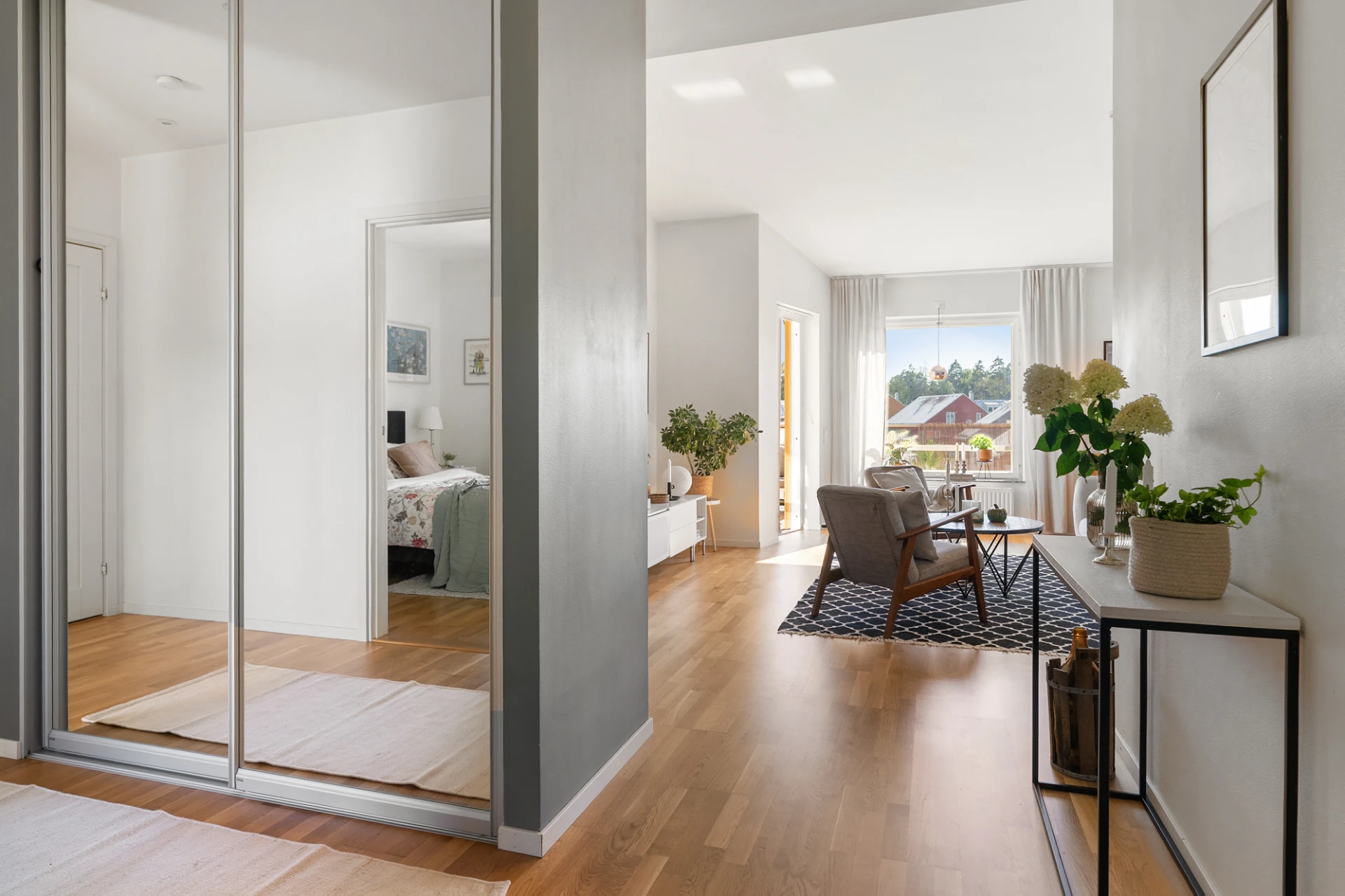 Hall med bra förvaringsmöjligheter i en generös garderob med skjutdörrar av spegelglas. Målade väggar och på golvet ligger en fin trestavig ekparkett som är genomgående i resterande rum av bostaden.