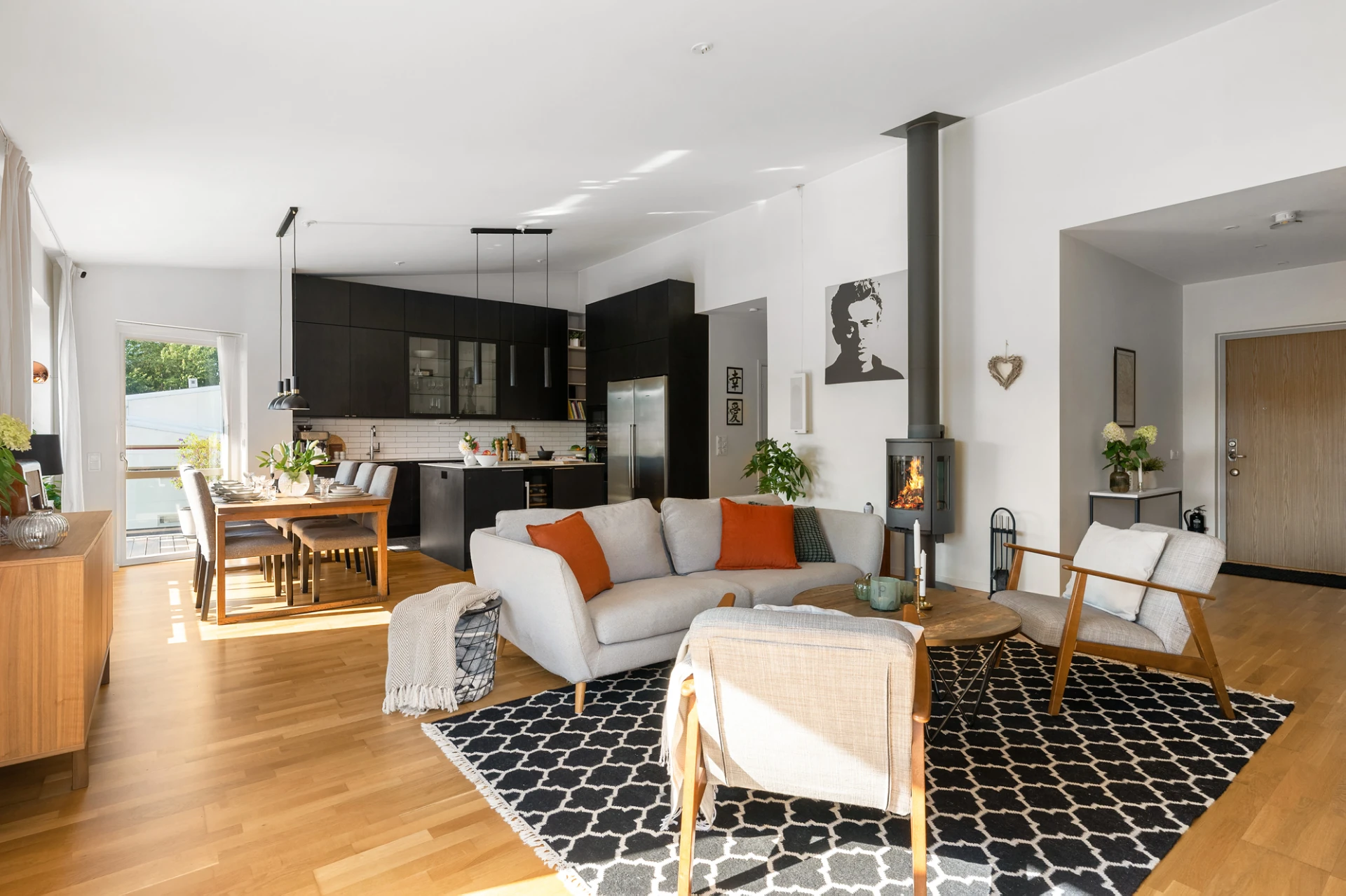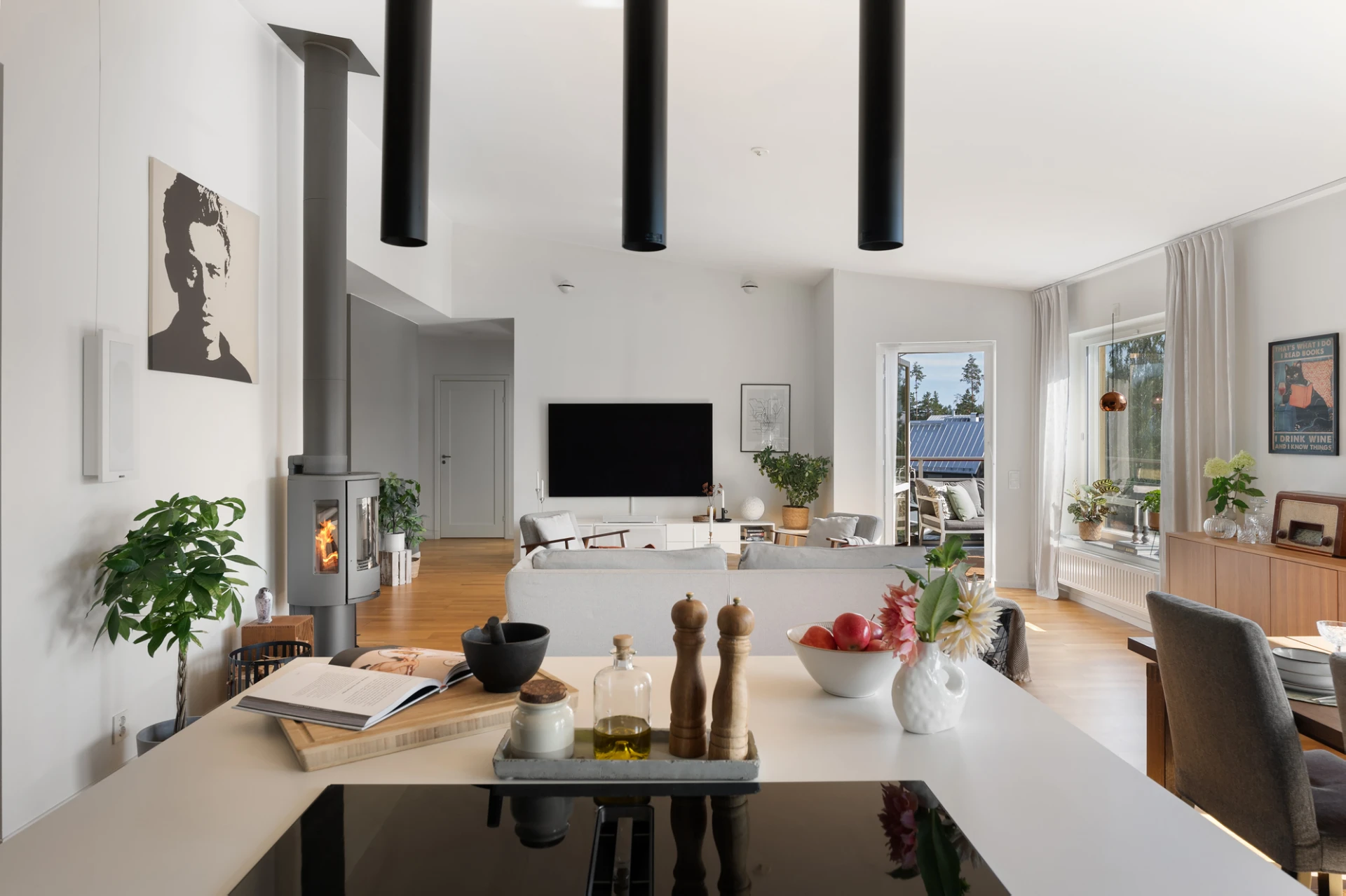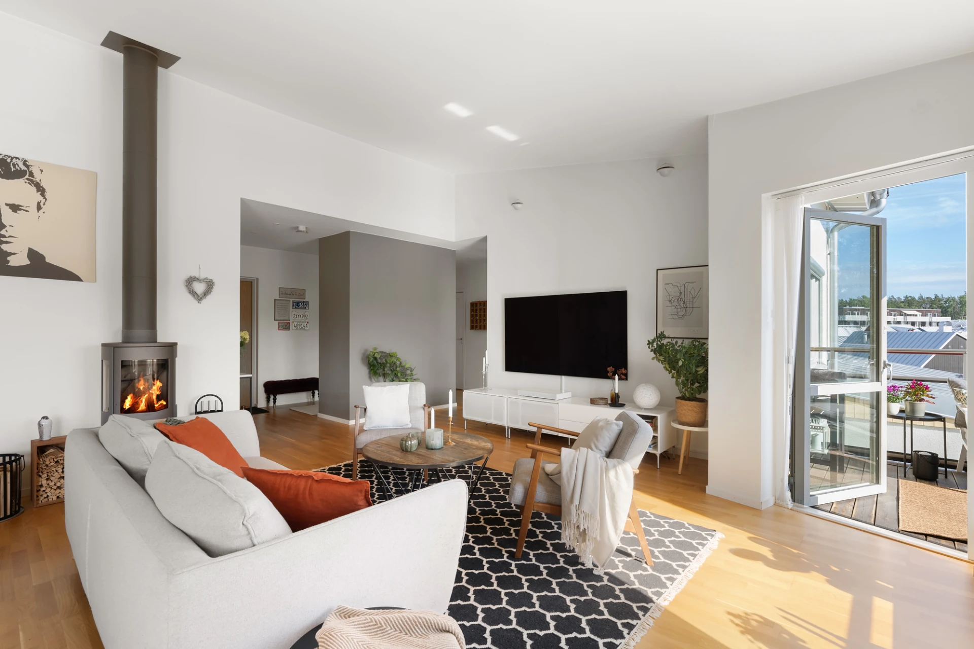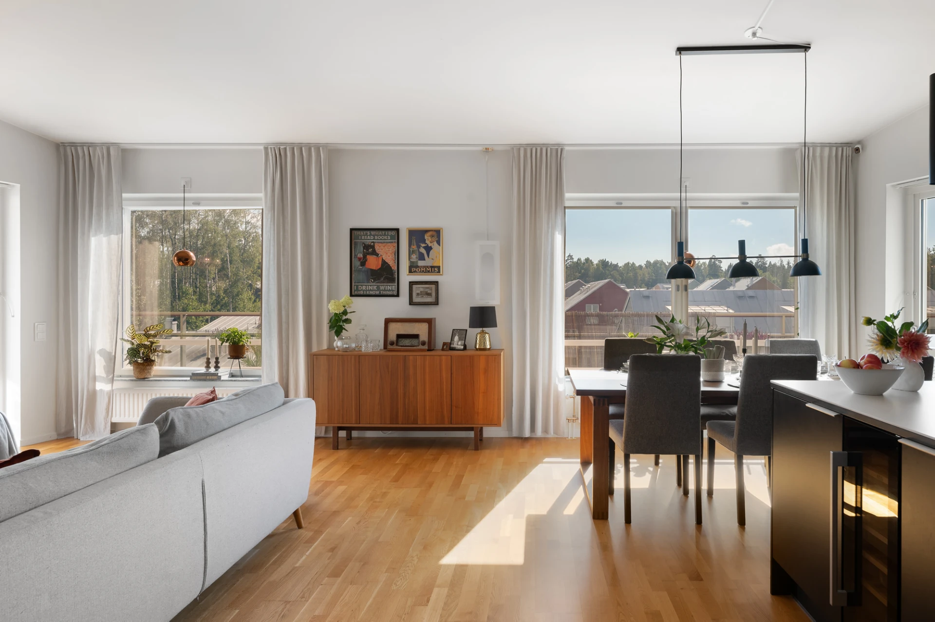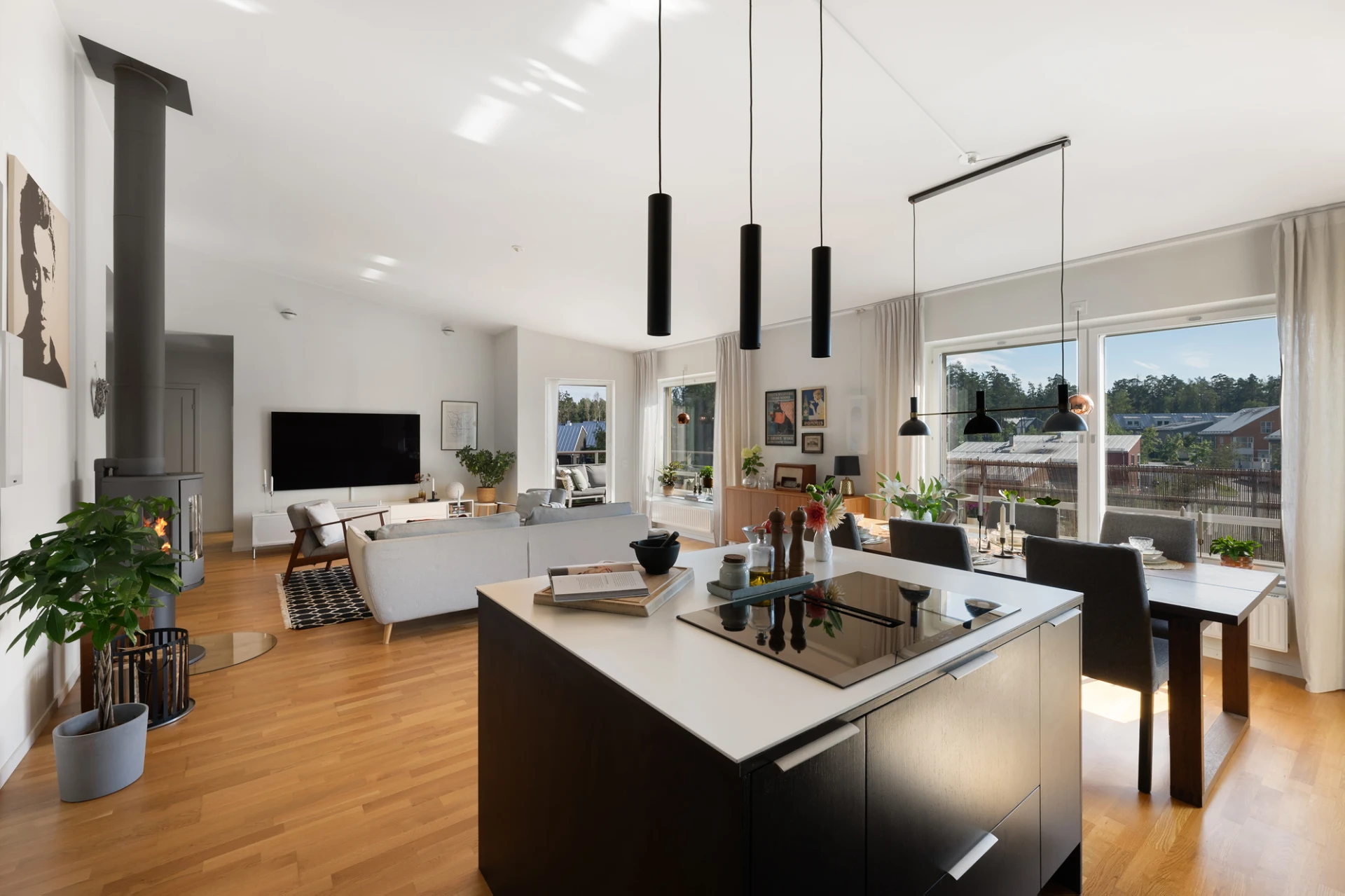Ett magiskt rum med högt i tak och stora fönsterpartier i ett fritt och insynsskyddat läge vilka ger ett vackert ljusinsläpp. Detta rum har braskamin och två utgångar till den generösa takterrassen med sol från morgon till sen kväll. Vardagsrummet har en öppen planlösningen mellan kök och matplats vilket skapar sociala ytor. Väggarna är vitmålade och på golvet ligger den fina ekparketten. Detta rum rymmer både stor soffgrupp såsom det generösa matbordet.
