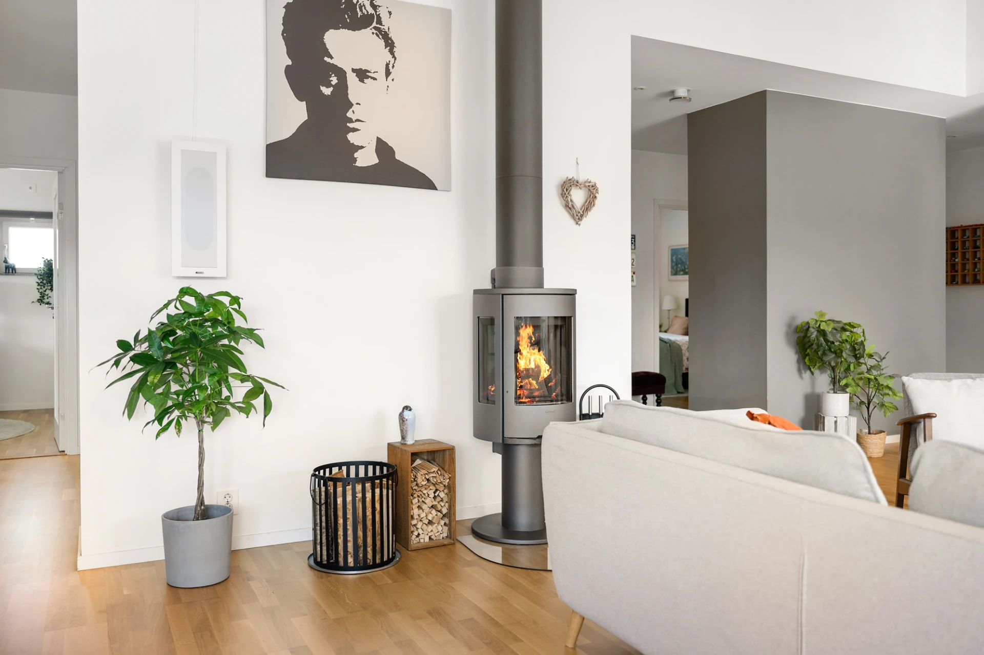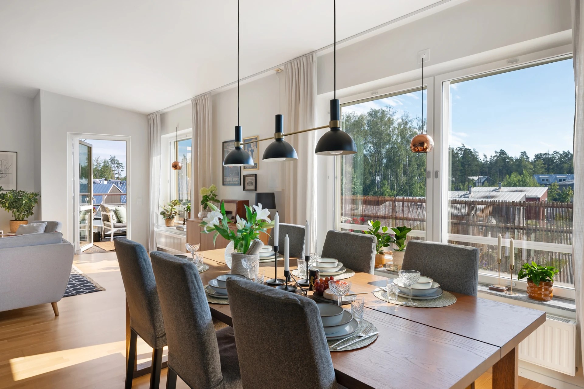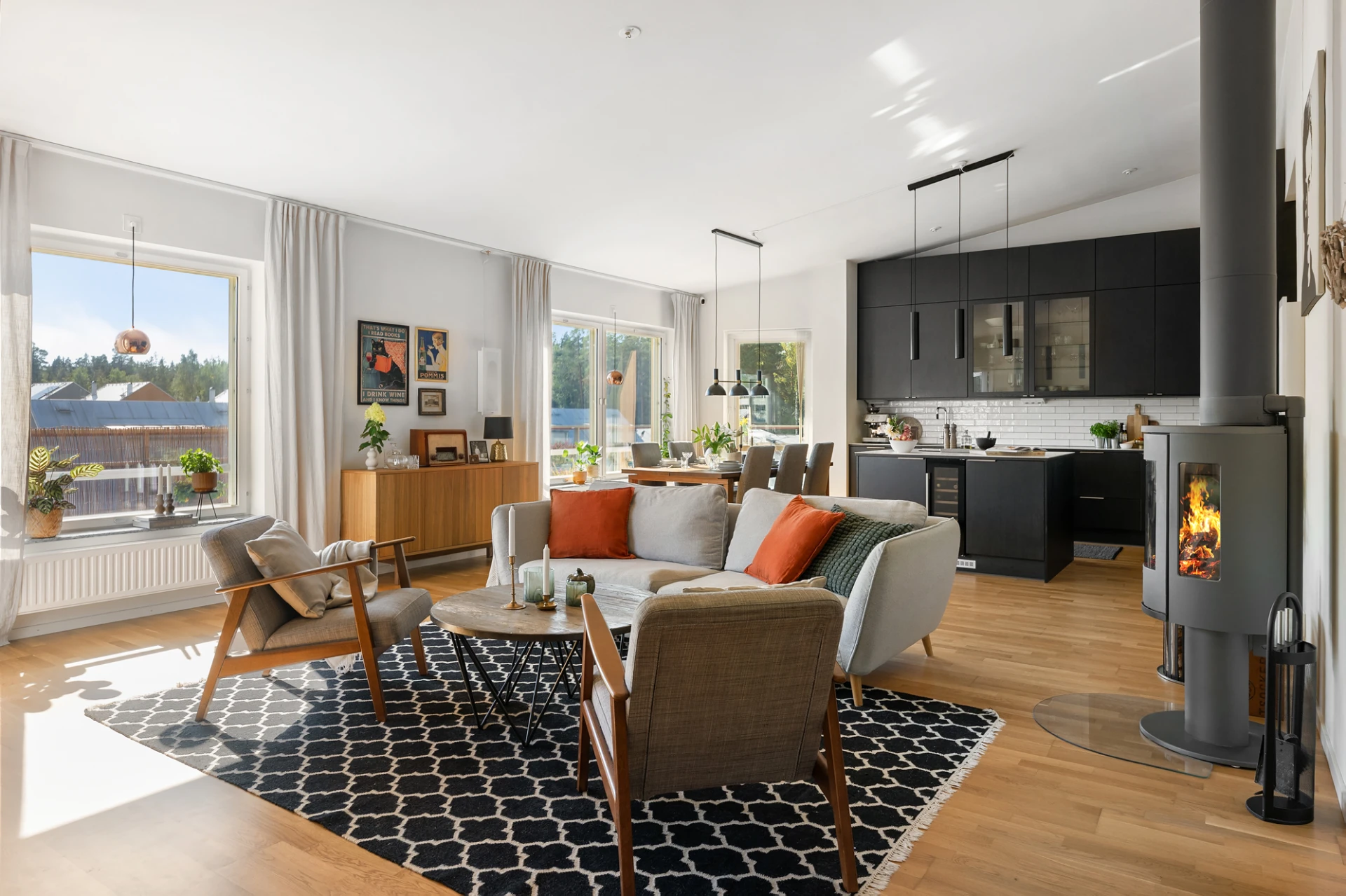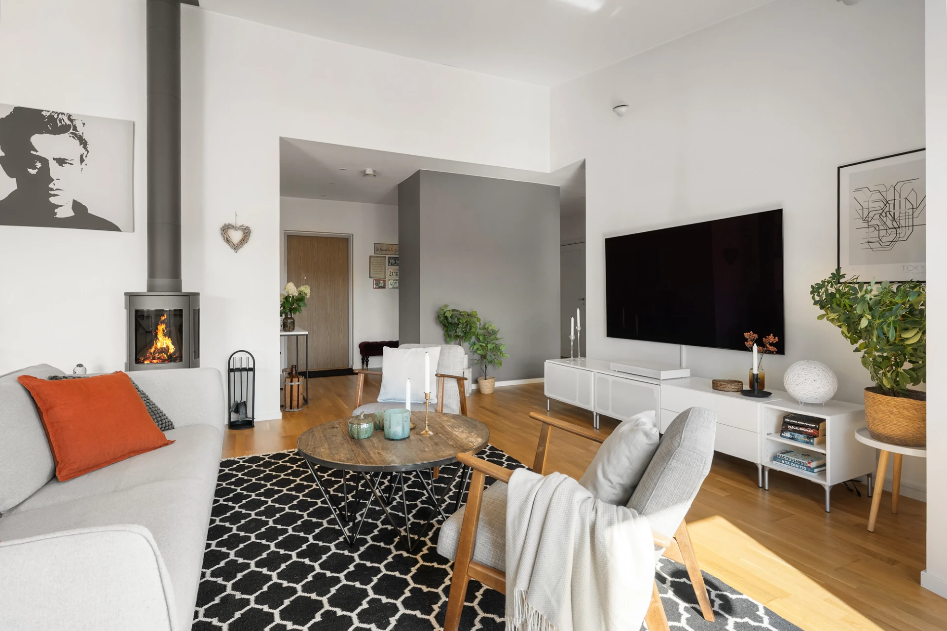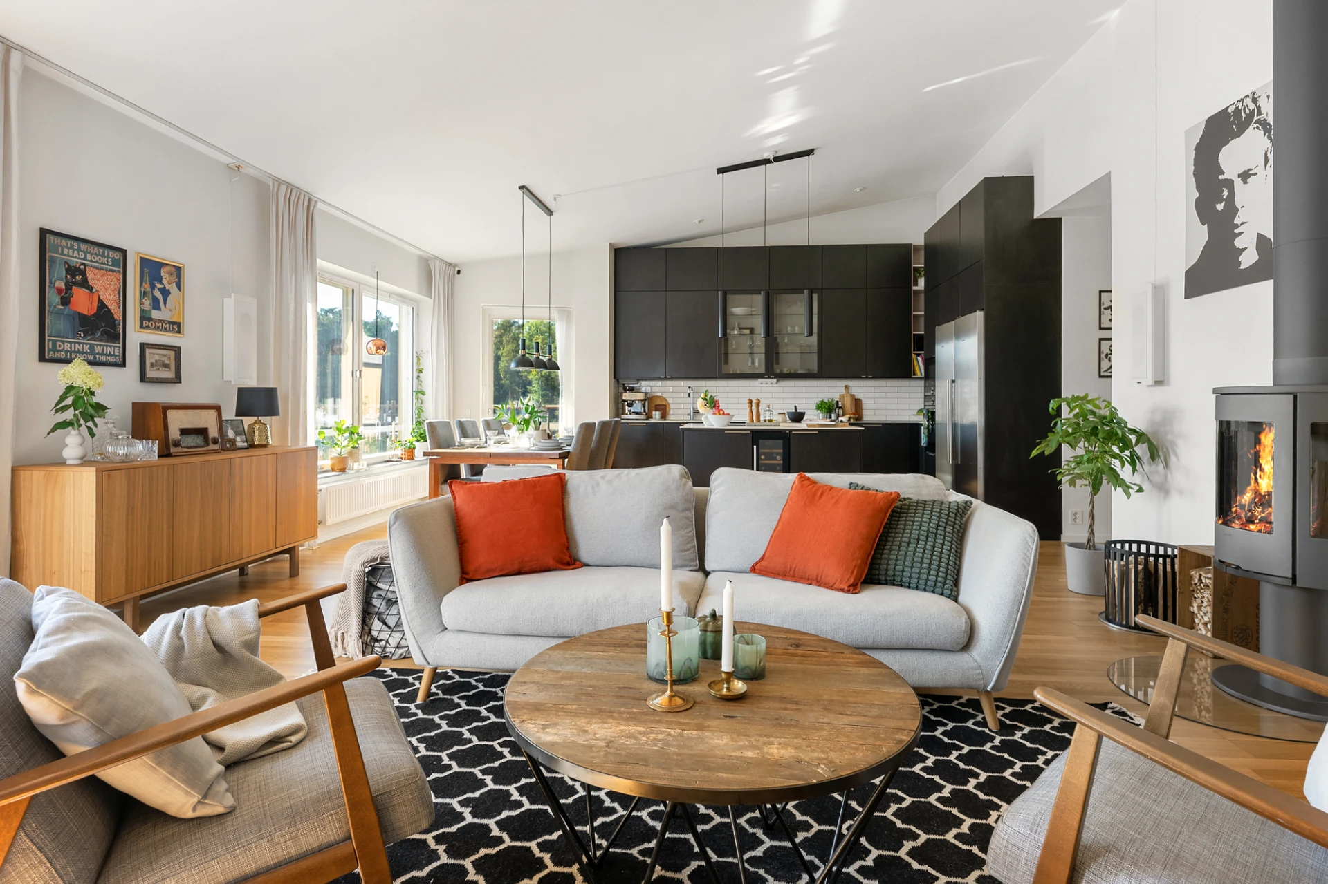 Ett magiskt rum med högt i tak och stora fönsterpartier i ett fritt och insynsskyddat läge vilka ger ett vackert ljusinsläpp. Detta rum har braskamin och två utgångar till den generösa takterrassen med sol från morgon till sen kväll. Vardagsrummet har en öppen planlösningen mellan kök och matplats vilket skapar sociala ytor. Väggarna är vitmålade och på golvet ligger den fina ekparketten. Detta rum rymmer både stor soffgrupp såsom det generösa matbordet.